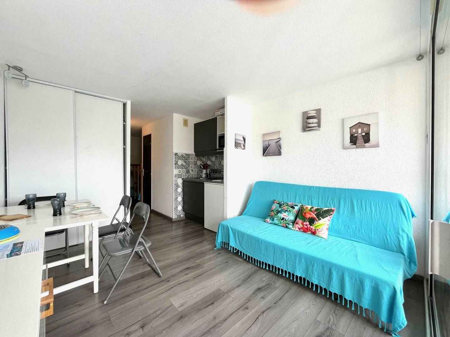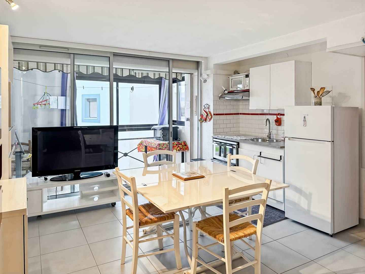 Le grau du roi, rive droite, la residence de la mer, 2 pièces au 2ème étage de 40m² avec terrasse de 12m² vue mer panoramique, exposée sud. séjour avec 1 clic clac en 140x190 et télévision. chambre avec 1 lit 2 pers en 140x190. cuisine équipée avec cuisinière 4 feux, micro-ondes et réfrigérateur-congélateur, lave-linge. salle d'eau