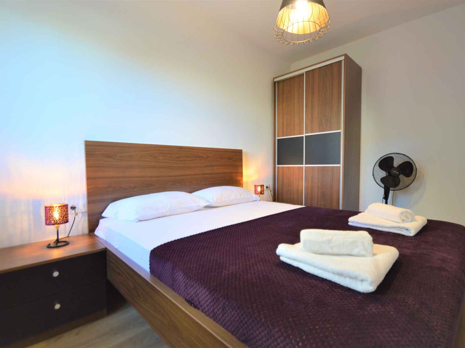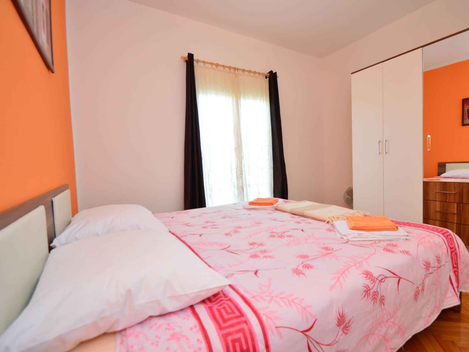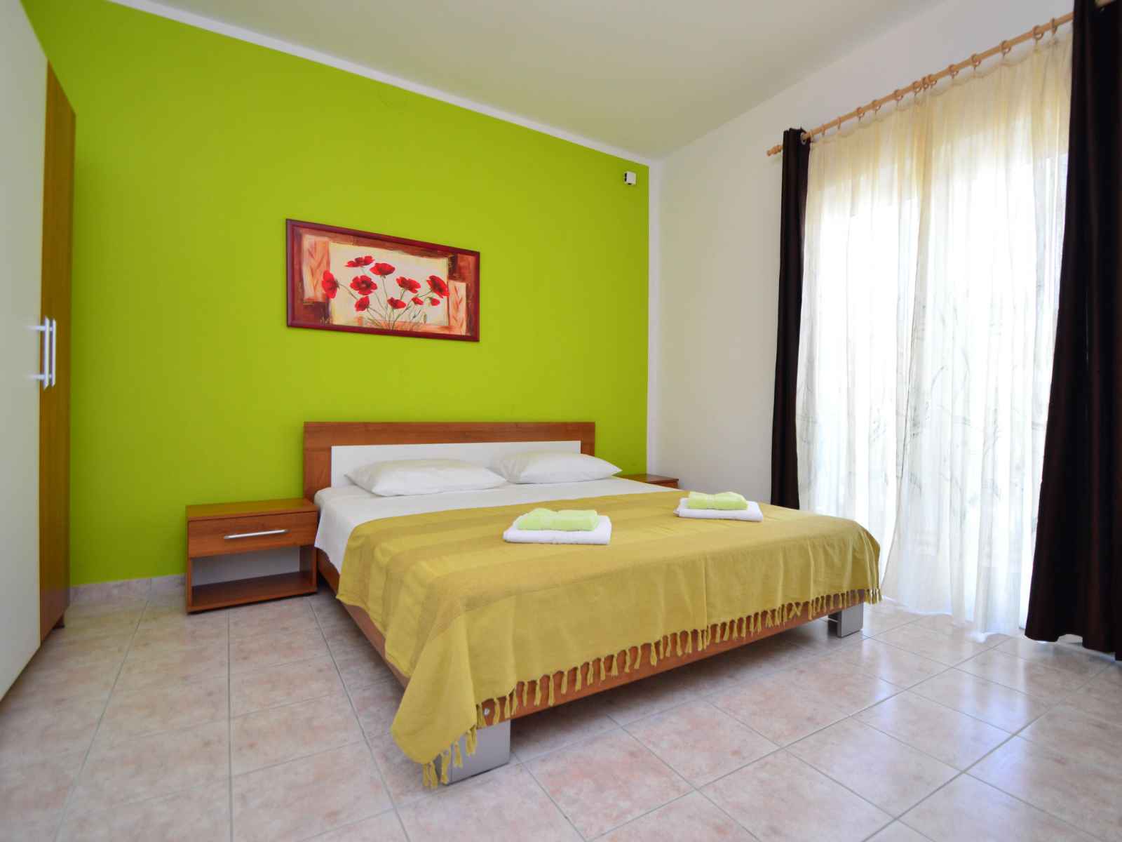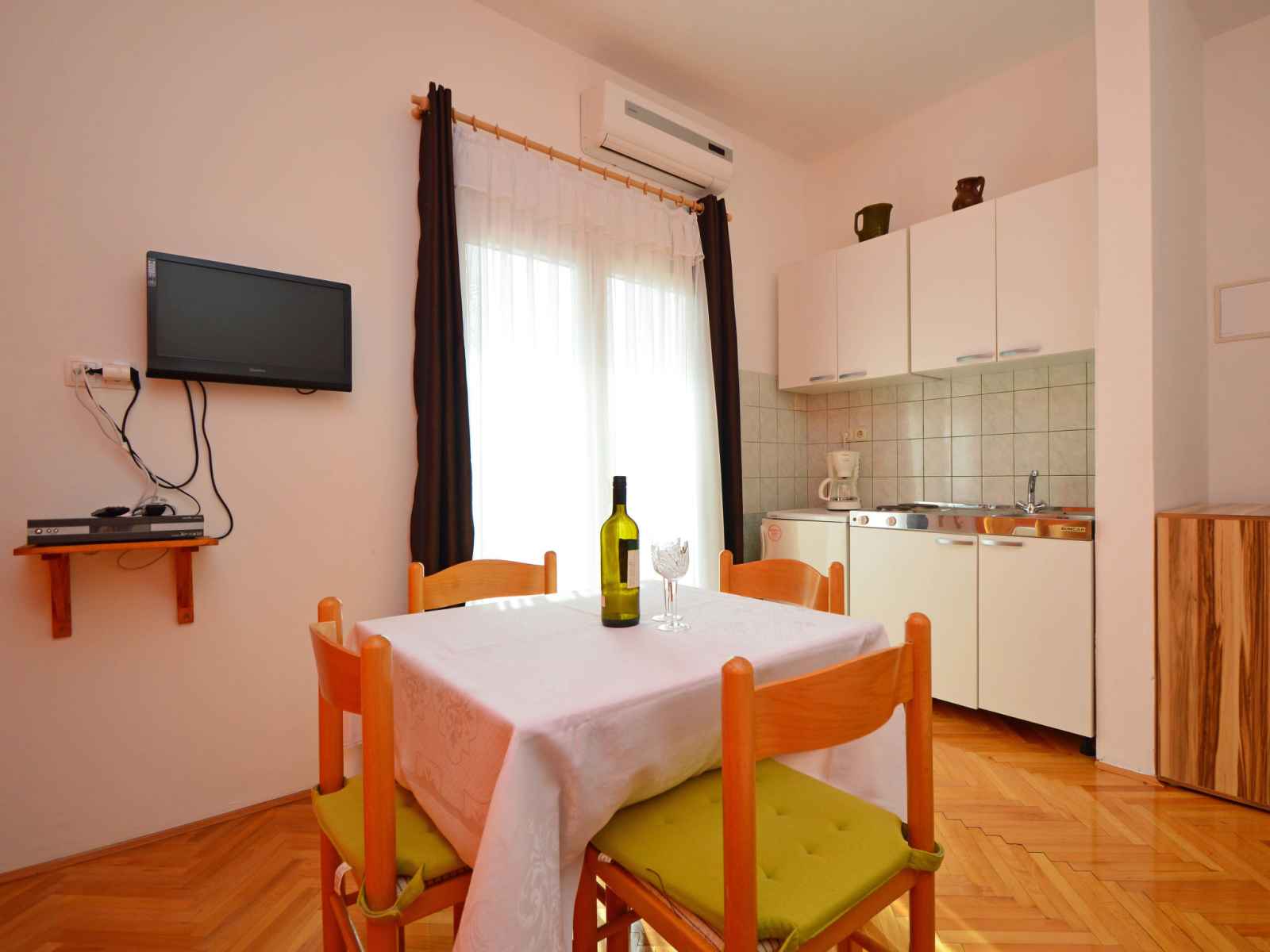 de cuisson, four, 2 plaques vitrocéramiques, Poêle à gaz, micro-ondes, congélateur, cafetière électrique). Douche/WC. À l'étage supérieur: (escalier extérieur) séjour/salle à manger avec 1 divan-lit (80 cm, longueur 200 cm), coin-cuisine et TV (satellite) (écran plat), air-conditionné. Sortie sur le balcon. 1 chambre avec 1 grand-lit (180 cm, longueur 200 cm). Séjour/salle à manger avec 1 divan-lit (80 cm, longueur 200 cm), coin-cuisine et TV (satellite) (écran plat), air-conditionné. Sortie sur le balcon. 1 chambre avec 1 grand-lit (180 cm, longueur 200 cm). Sortie sur le balcon. 1 chambre avec 1 grand-lit (180 cm, longueur 200 cm), douche/WC. Sortie sur le balcon. 2 douches/WC. Pas de chauffage. 3 balcons 6 m2, terrasse 40 m2 partiellement couverte. Meubles de terrasse, chaises longues. Vue sur la piscine. A disposition: lave-linge, chaise haute pour enfant, lit bébé, sèche-cheveux. Internet (Connexion WIFI, gratuit). Veuillez noter: une chambre double est à l'exterieur de l'appartement.