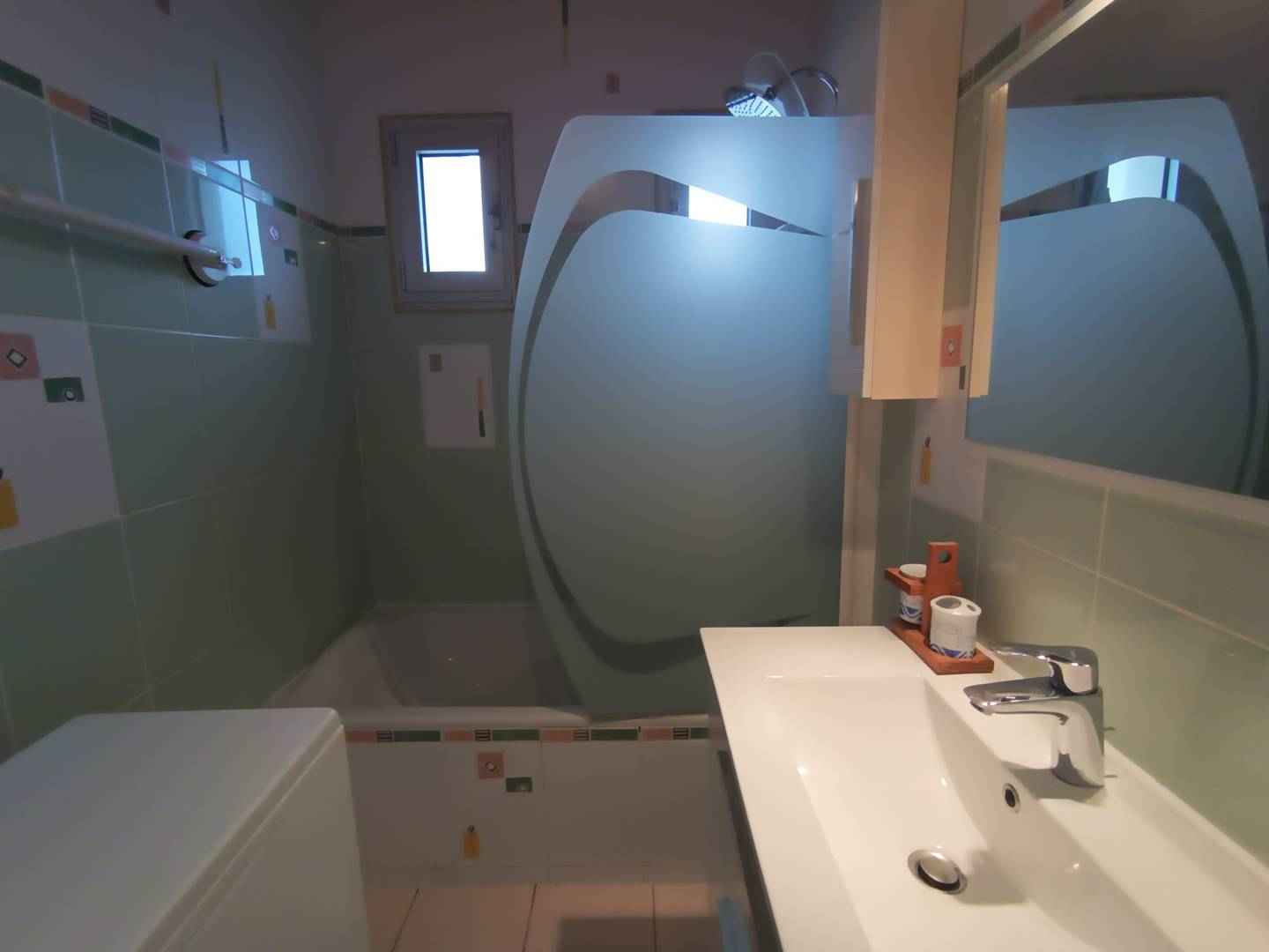 salle de bain : douche avec lavabo avec lave-linge