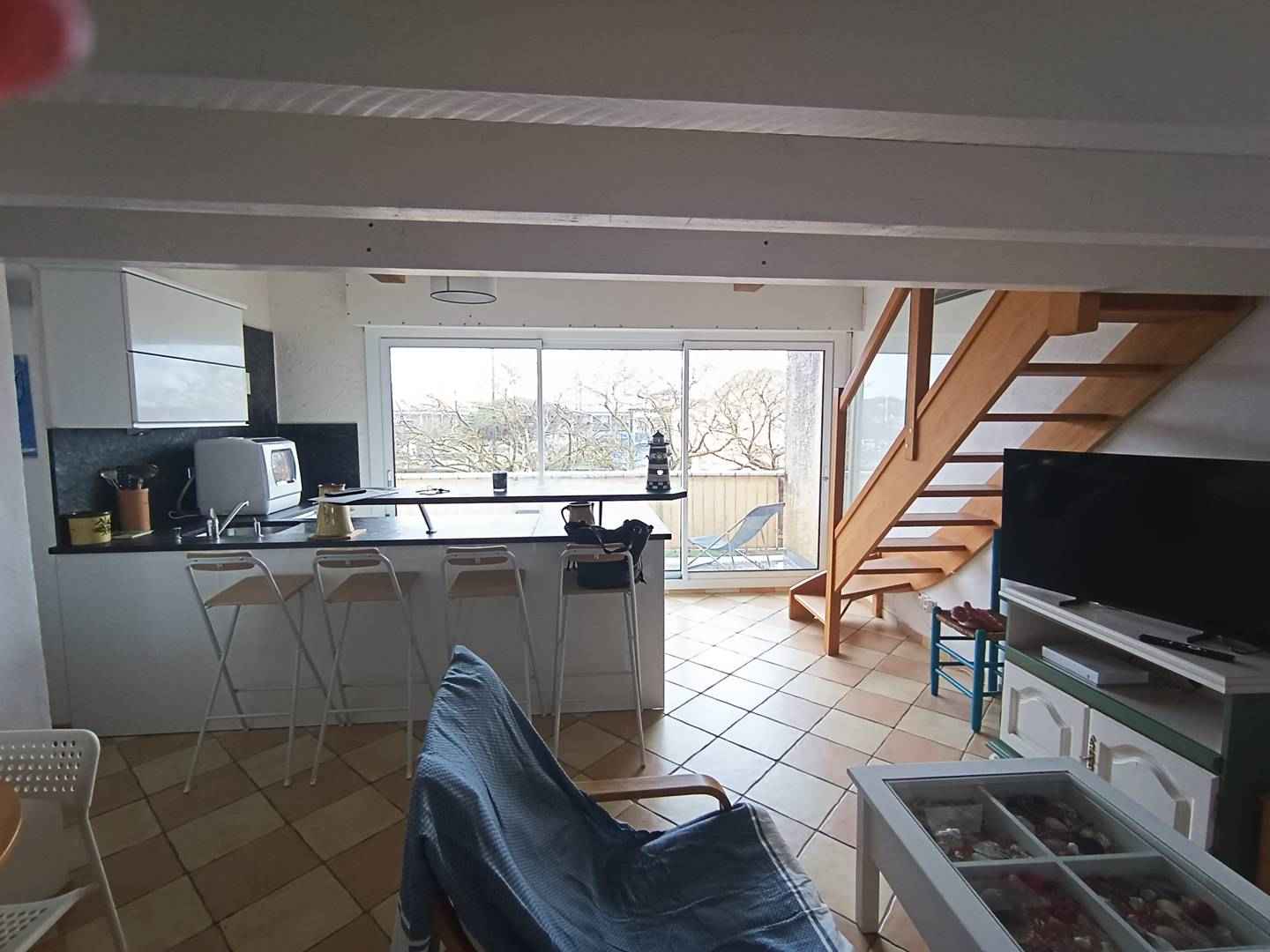 ouverte sur la terrasse, table, chaises, canapé, télévision,