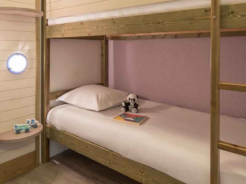 - pièce à vivre : 1 lit-double rabattable et 1 coin nuit avec 2 lits superposés (recommandés pour les enfants)