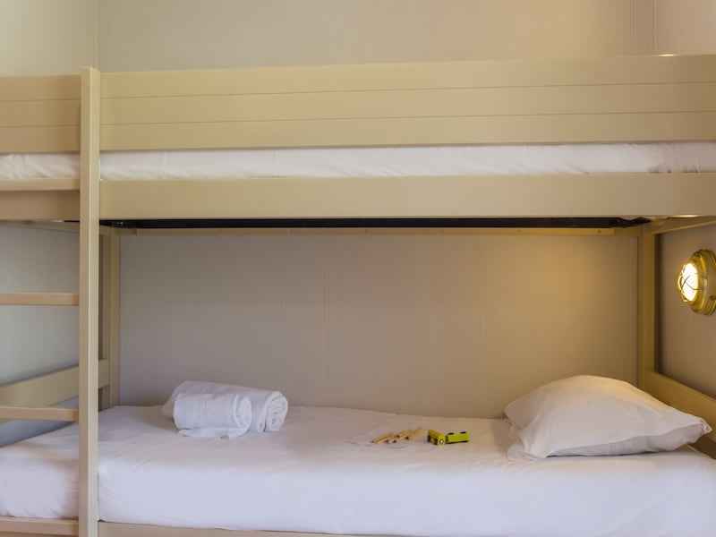 - pièce à vivre : 2 lits-banquettes et 1 coin nuit avec 2 lits superposés à l'entrée (recommandé pour les enfants)