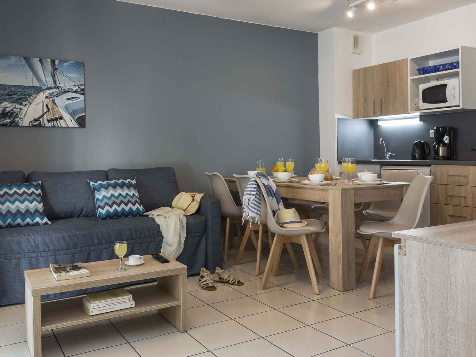 kitchenette équipée (plaque électrique 4 feux, réfrigérateur, micro-ondes, lave-vaisselle)