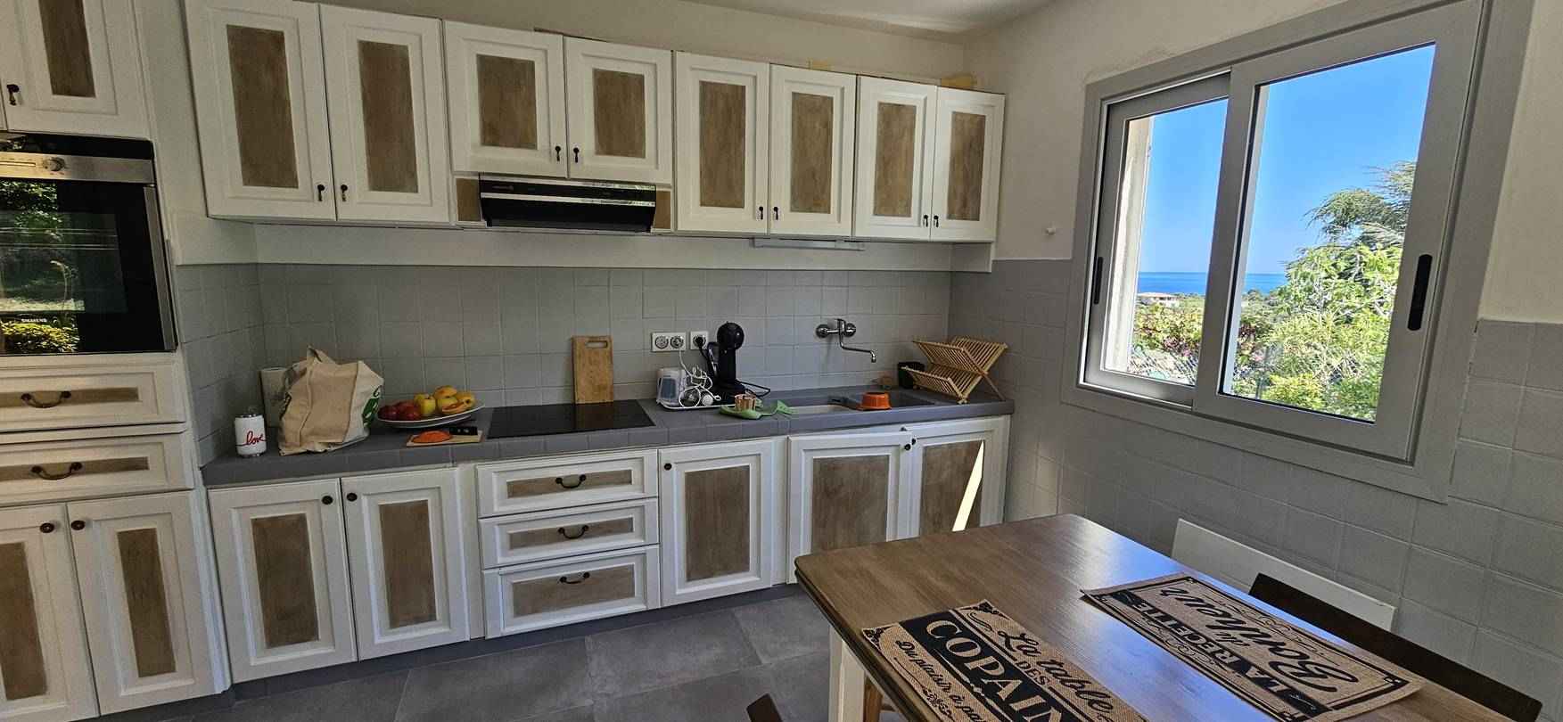 - Séjour (Beau séjour lumineux avec canapé d'angle convertible, ventilateur de plafond, salle à manger(4personnes), rangements, le tout donnant sur une terrasse avec vue panoramique sur la mer.)