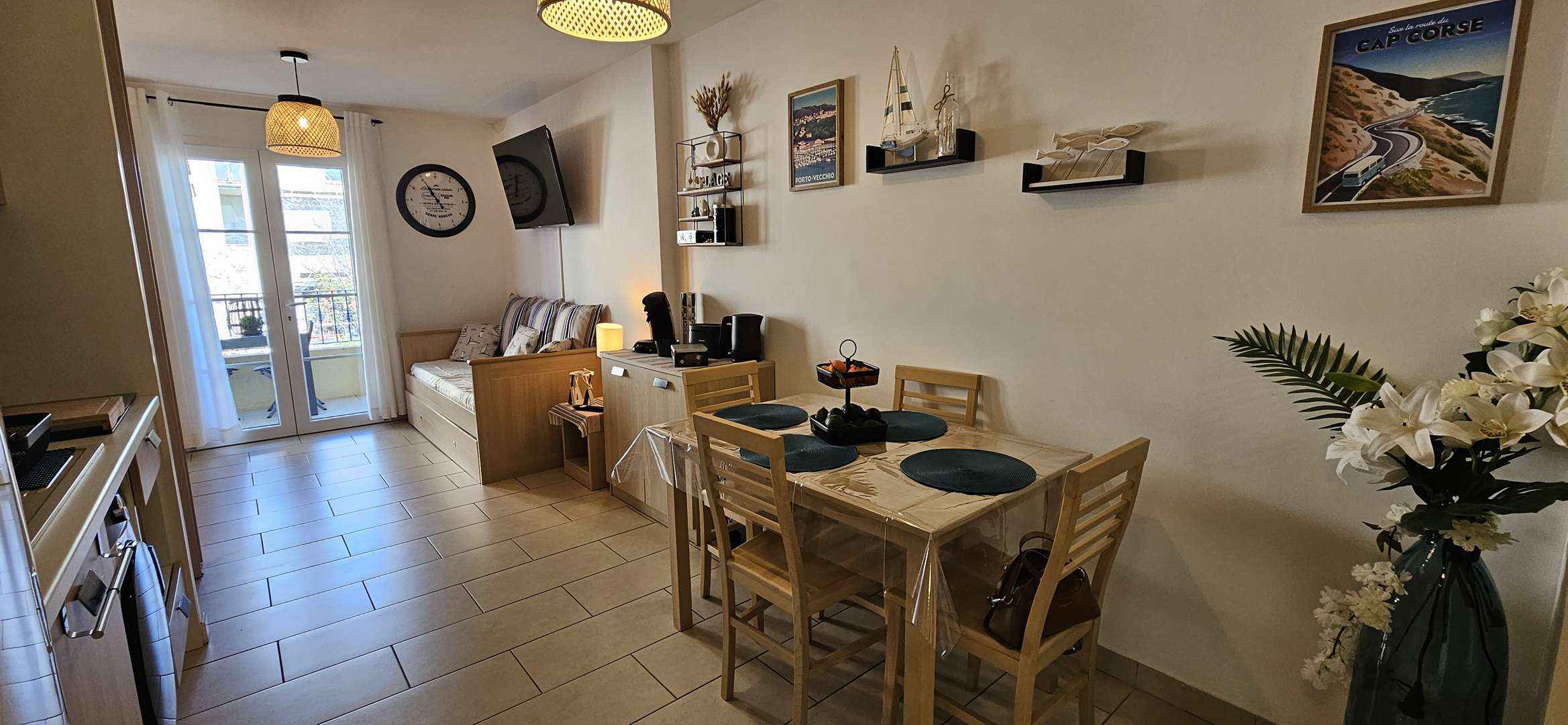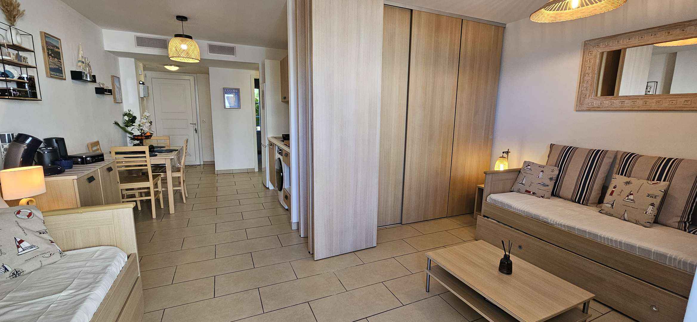 Séjour avec coin cuisine toute équipée ( lave-linge , réfrigérateur-congélateur, combiné four et micro-onde, plaque à induction, hotte aspirante, cafetière senseo, grille-pain, bouilloire) , coin salle à manger pour 4 personnes , coin nuit (fermé) avec un canapé gigogne 2 lits simples( 2x80) convertible en lit double (160) , TV connectée, wifi
