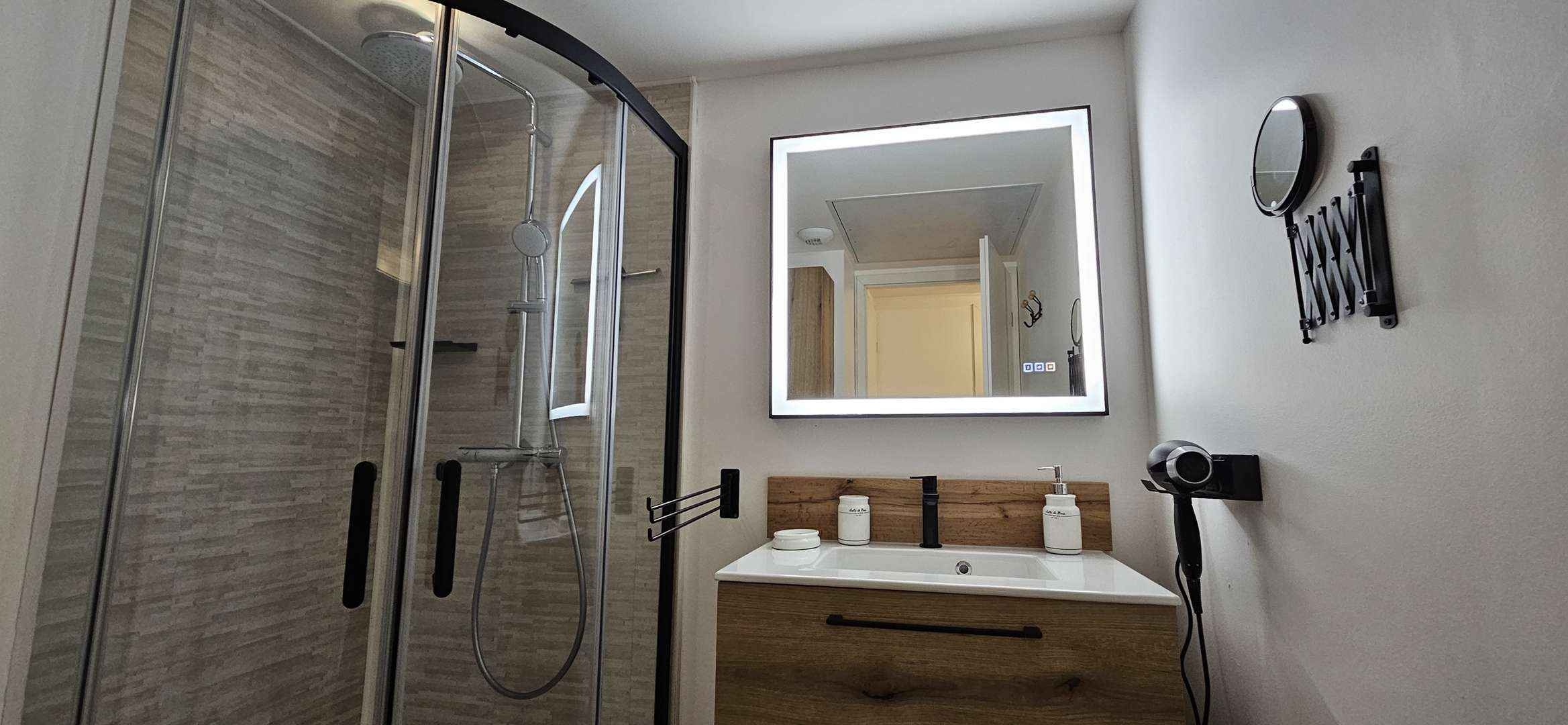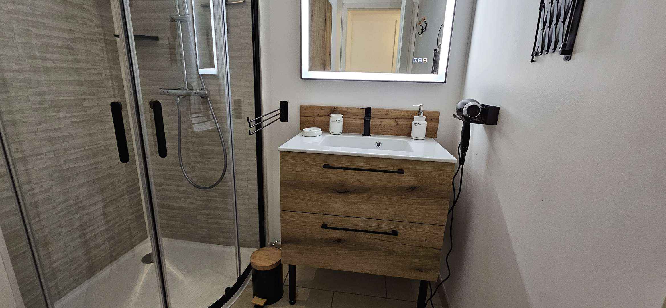 - Salle d'eau (Douche, vasque, sèche-cheveux)