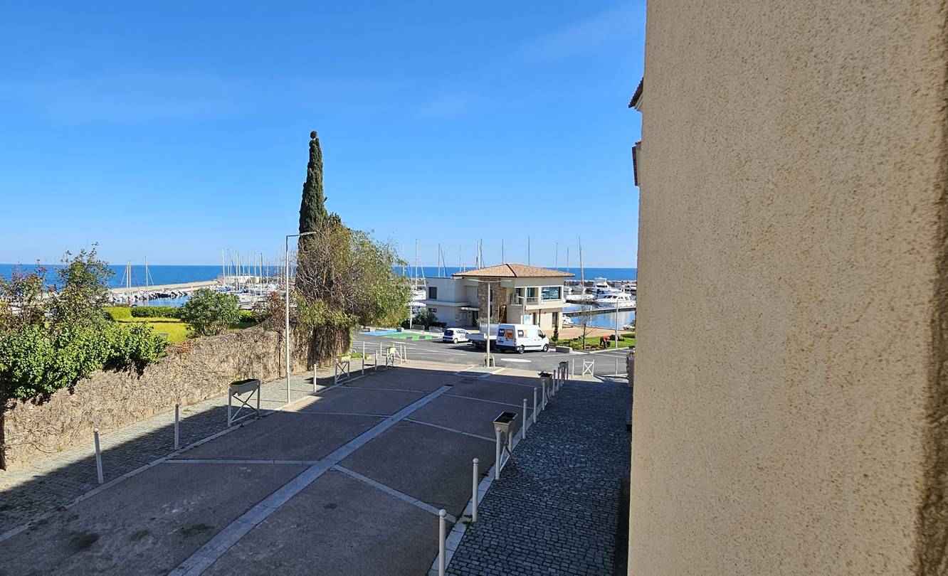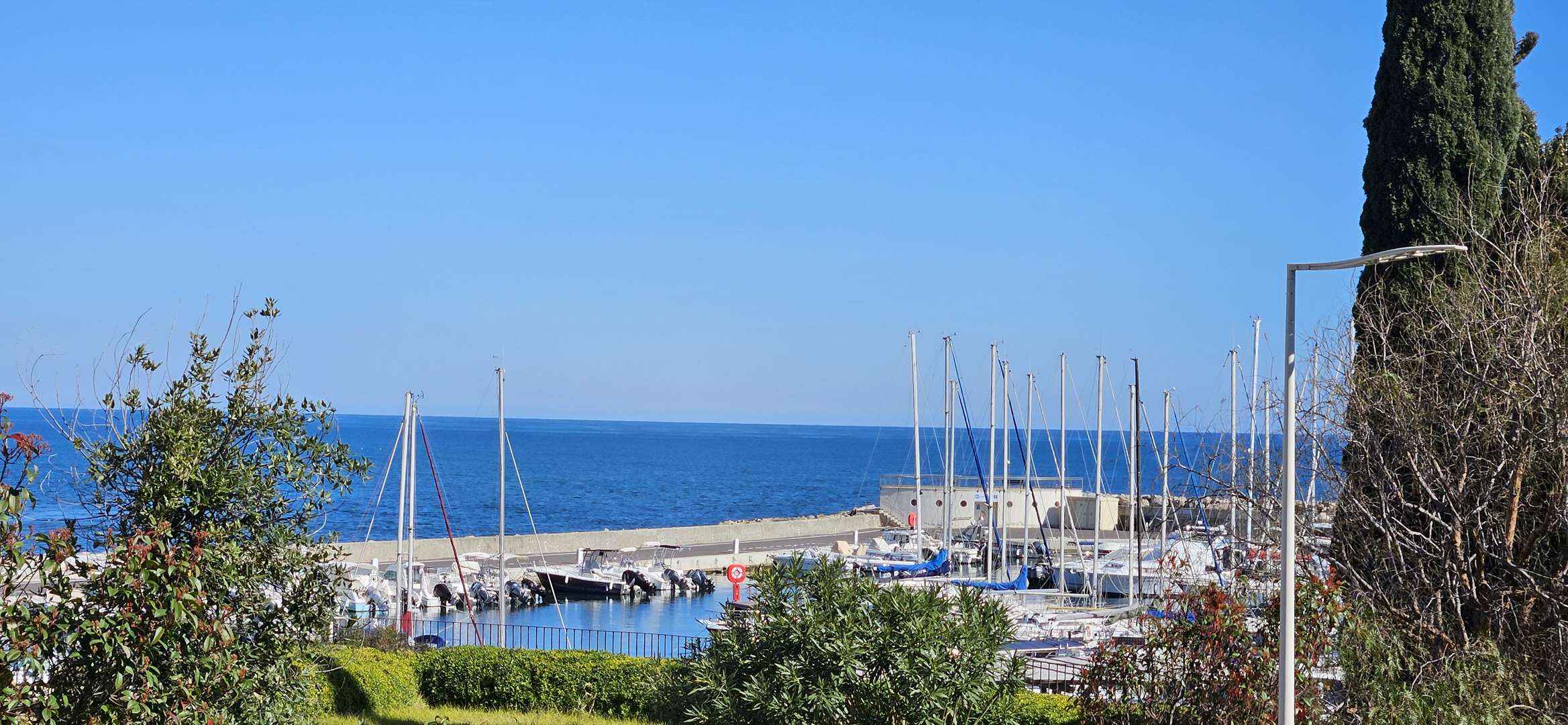 Donnant sur la terrasse couverte avec salon de jardin , vue mer, port de plaisance et montagne.