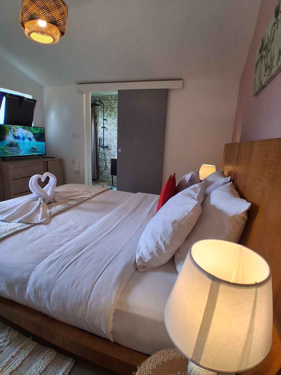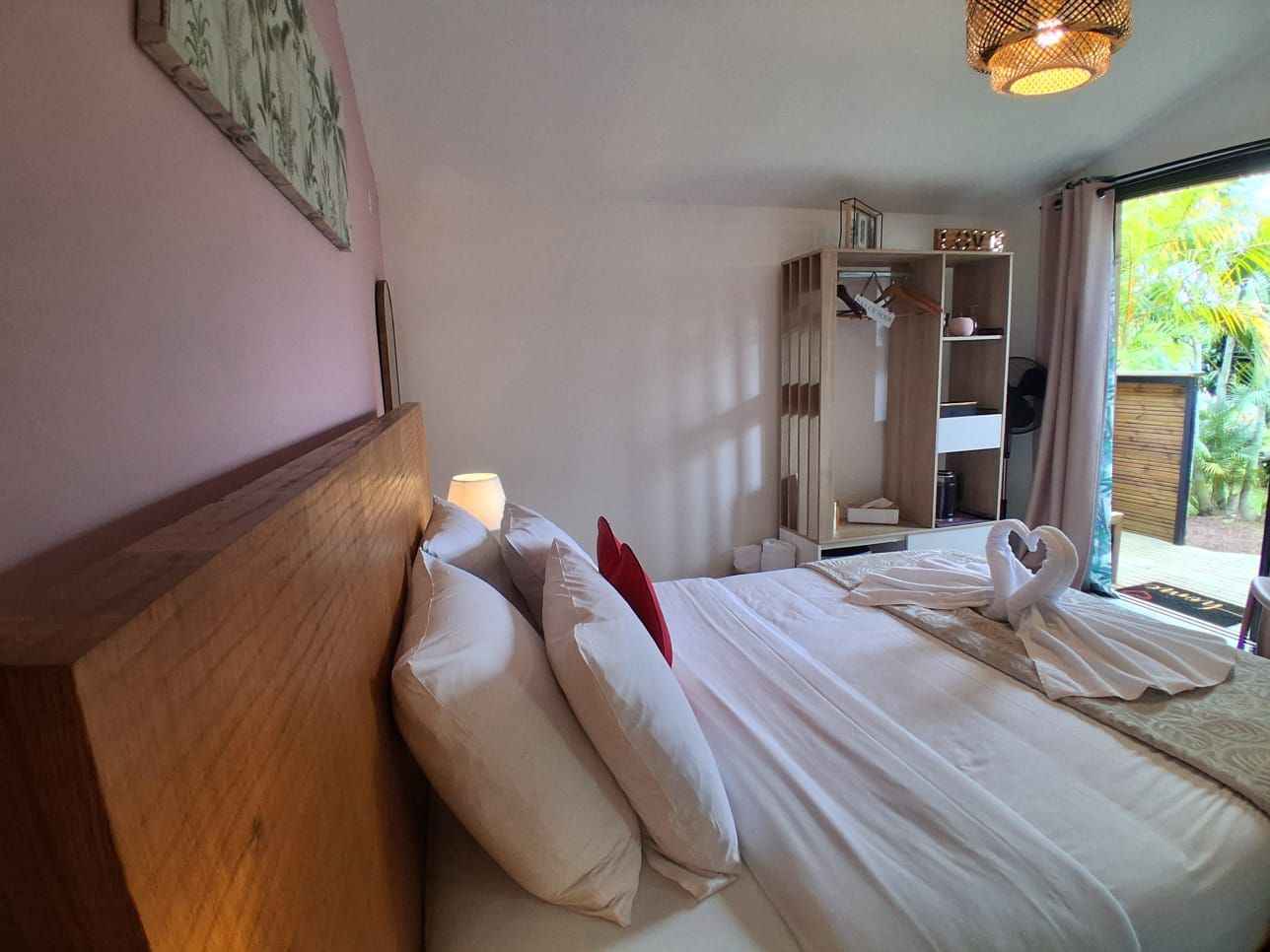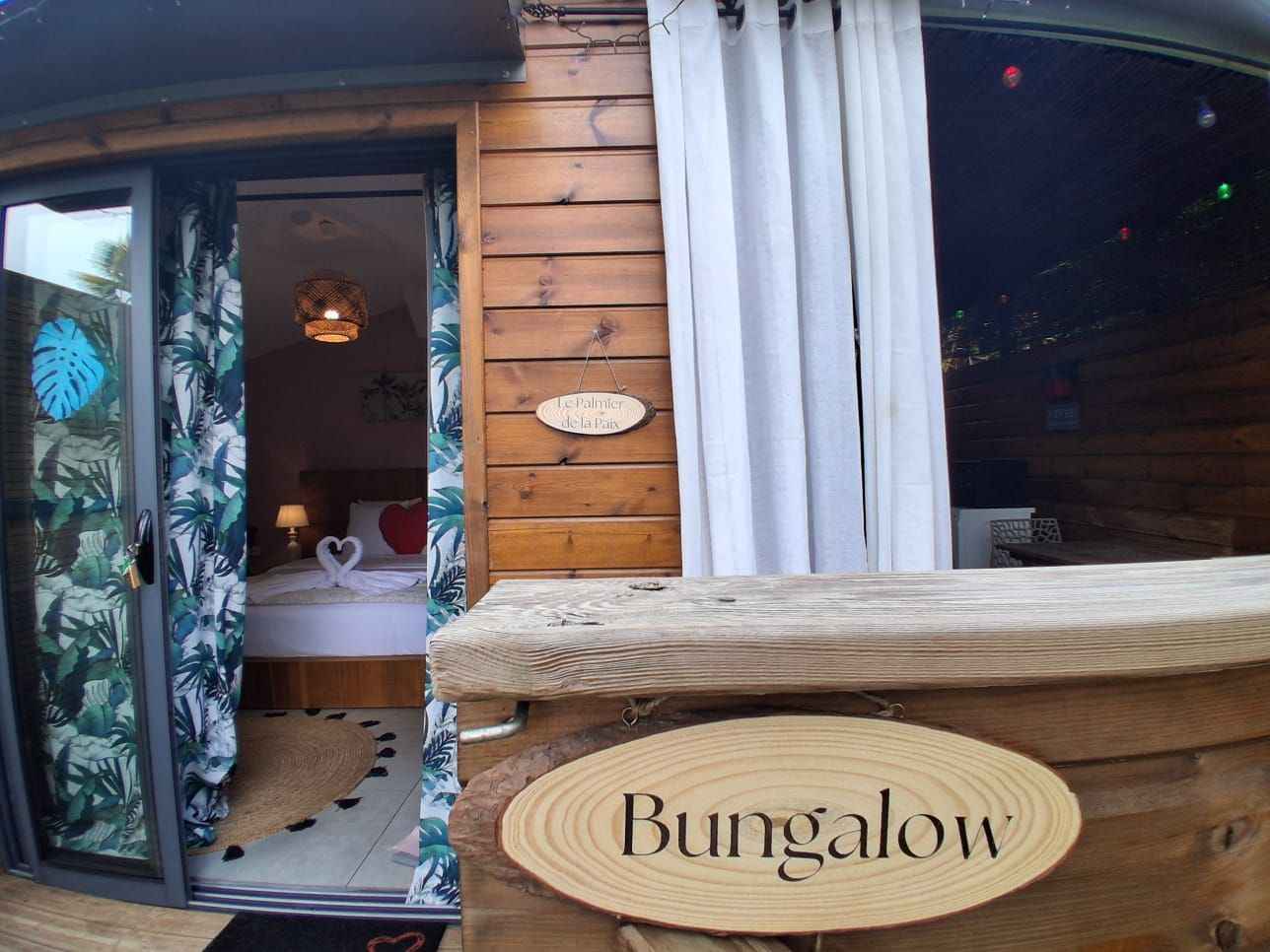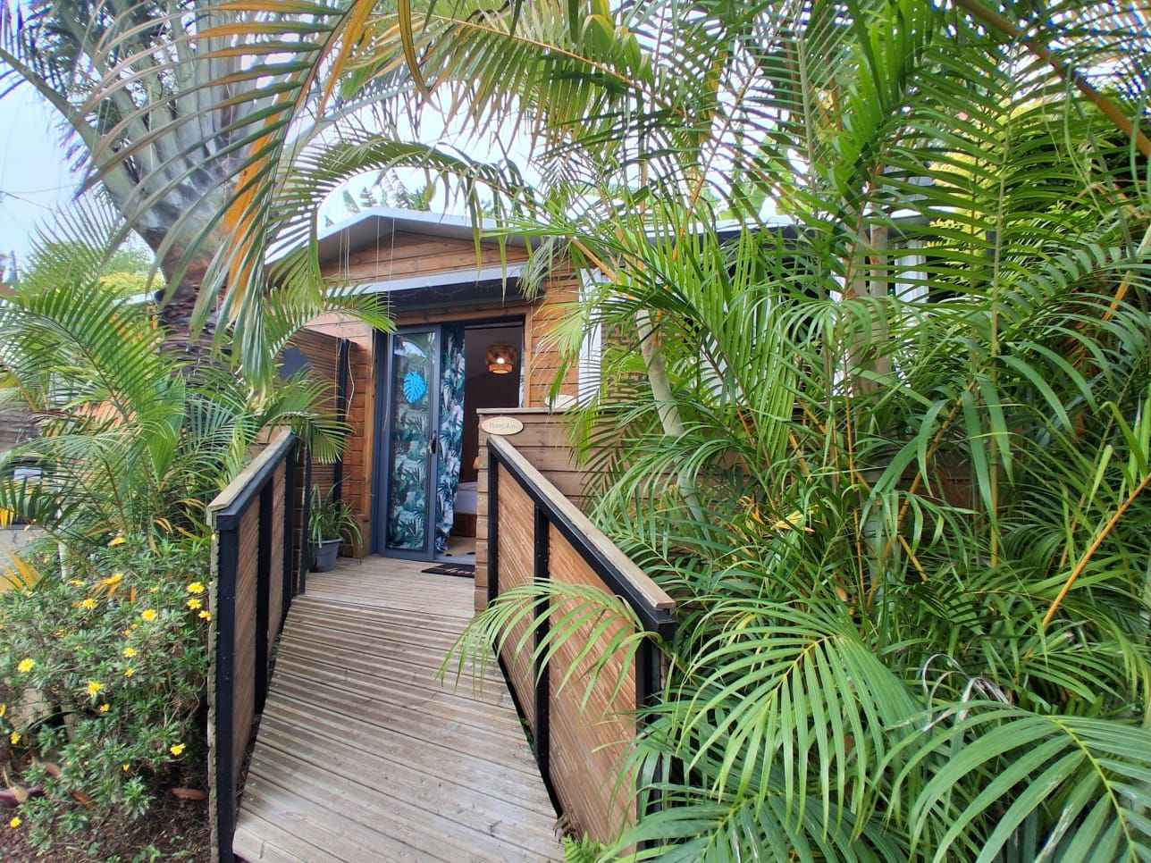 Ce bungalow est composé d'un lit queen size (160x200), d’une commode, d’un portant à vêtement, d’une smart tv, d’une salle d’eau privative. sont à votre disposition: sèche-cheveux, serviette de bain, serviette de piscine, peignoirs, savon et shampoing, petit frigo, un plateau/bouilloire. la chambre est accessible par une rampe mais