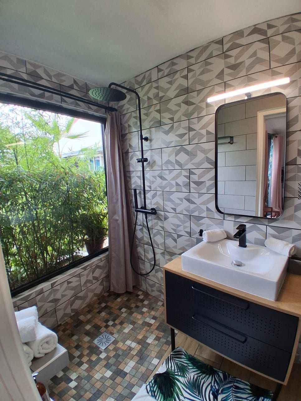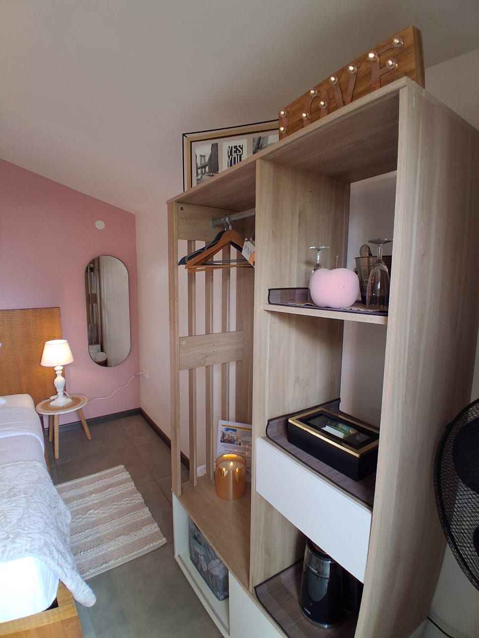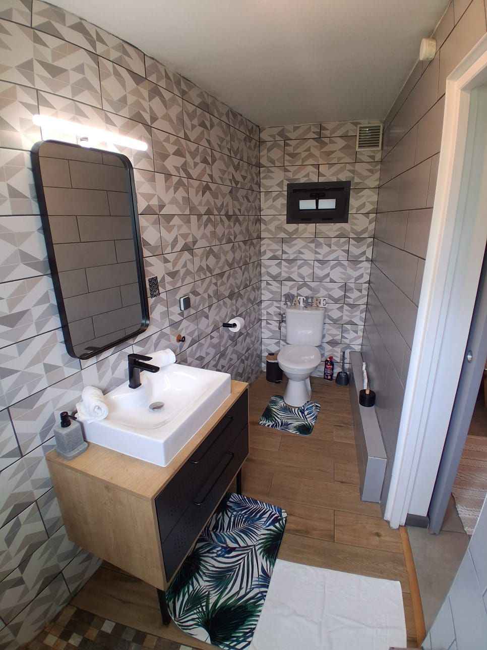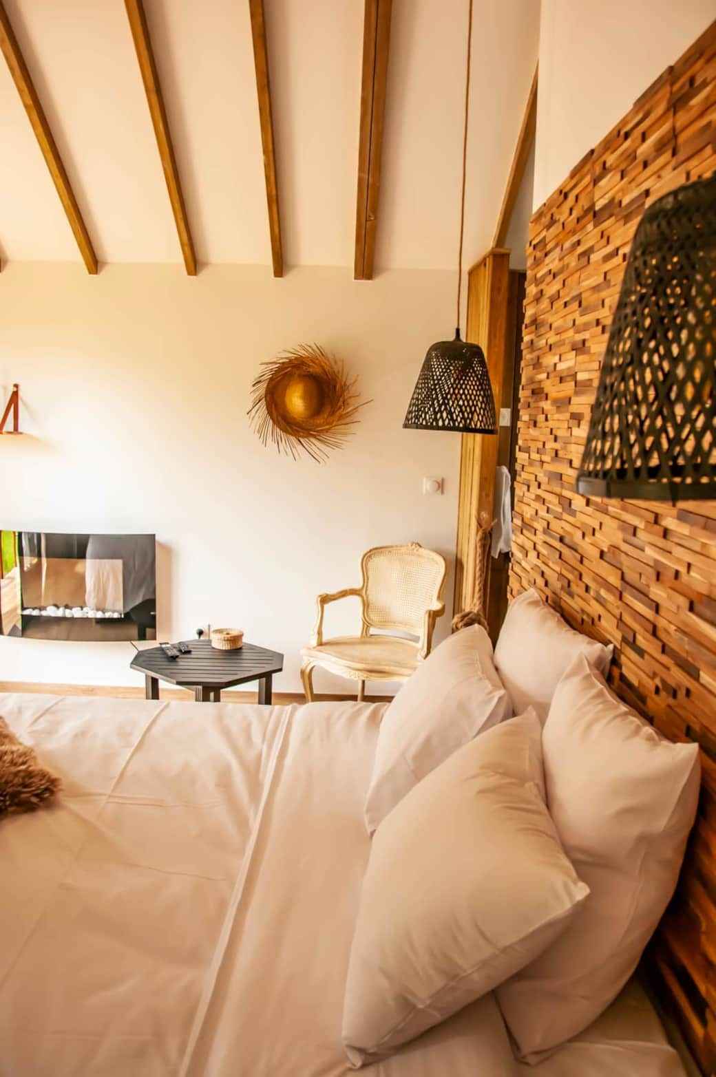 Ce bungalow est composé d'un lit queen size (160x200), d’une commode, d’un portant à vêtement, d’une smart tv, d’une salle d’eau privative. sont à votre disposition: sèche-cheveux, serviette de bain, serviette de piscine, peignoirs, savon et shampoing, petit frigo, un plateau/bouilloire. la chambre est accessible par une rampe mais