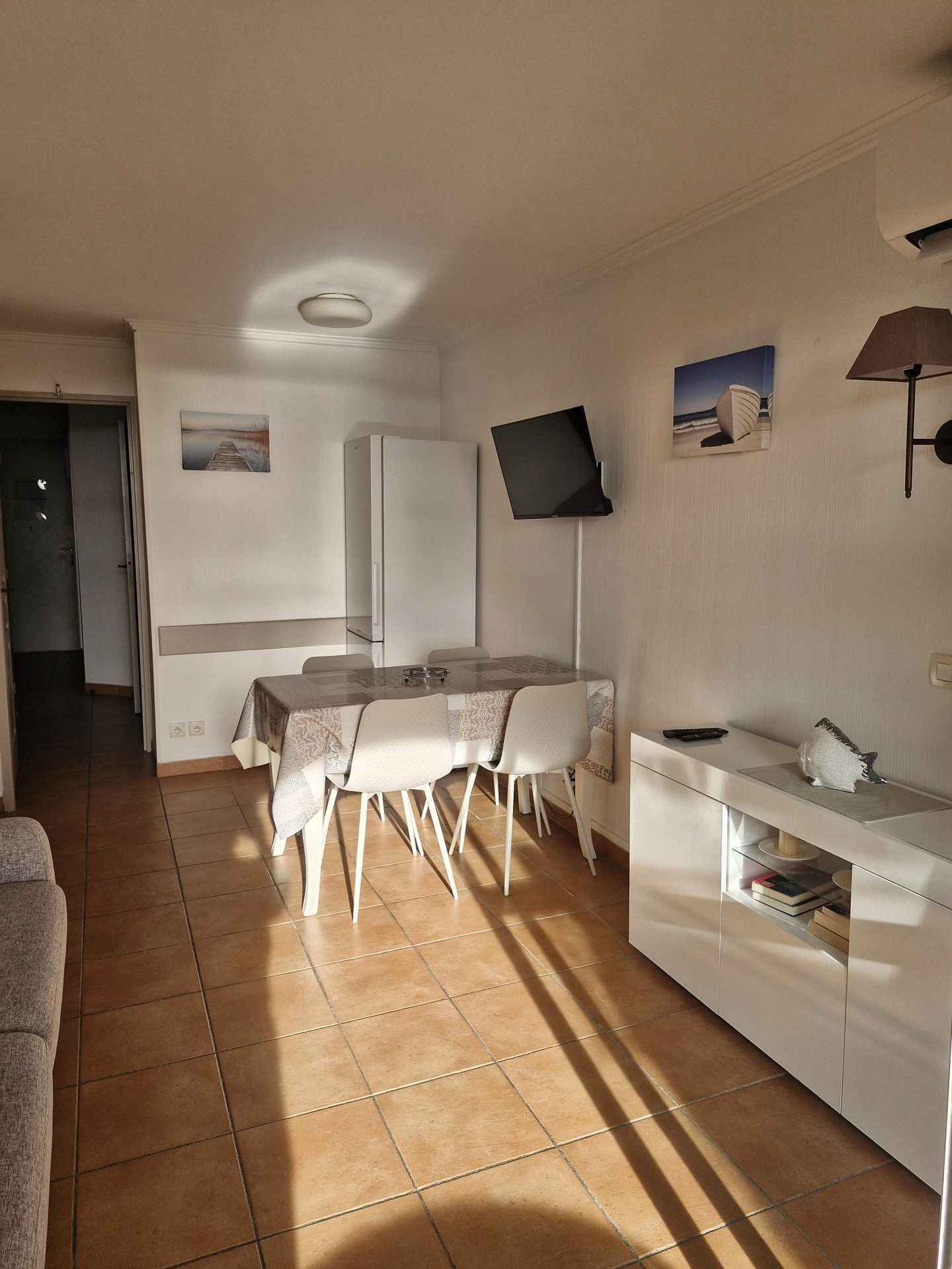 coin cuisine équipé : réfrigérateur, congélateur, lave vaisselle, plaques vitro-céramiques, micro-ondes, cafetière, nécessaire de vaisselle. l'appartement dispose d'un lave-linge et de la climatisation.