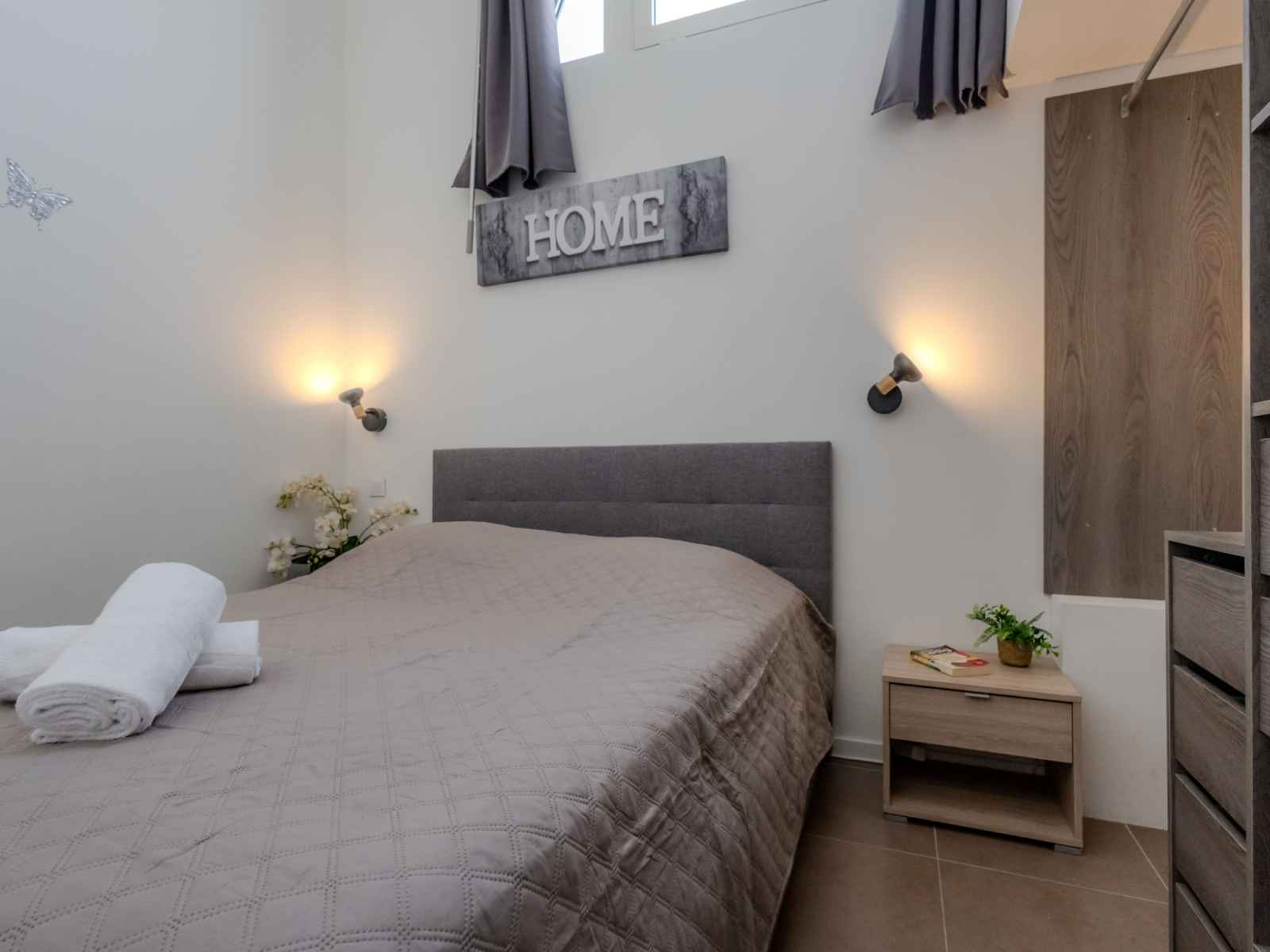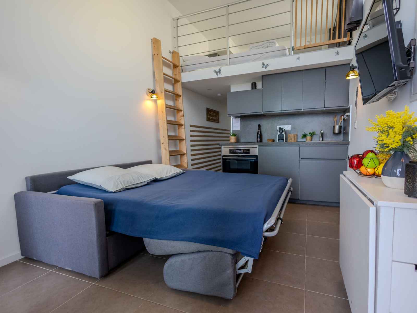 longueur 190 cm). Petite cuisine ouverte (four, 2 plaques à induction, grille-pain, bouilloire électrique, cafetière électrique, Capsules pour machine à café (Nespresso) (NON INCLUSES)) avec table pour les repas. Douche/WC. Chauffage électrique, air-conditionné, chauffage à air chaud. À l'étage supérieur: (escalier raide) galerie avec 2 lits (90 cm, longueur 190 cm). Terrasse 15 m2, couverte, situation sud. Meubles de terrasse. Très belle vue sur la mer. A disposition: lave-linge, fer à repasser, sèche-cheveux. Internet (Connexion WIFI, en sus). Place de parking (1 Voiture). Veuillez noter: logement non-fumeur. Détecteur de fumée. Annonce d'un particulier (art 155, IV du CGI).