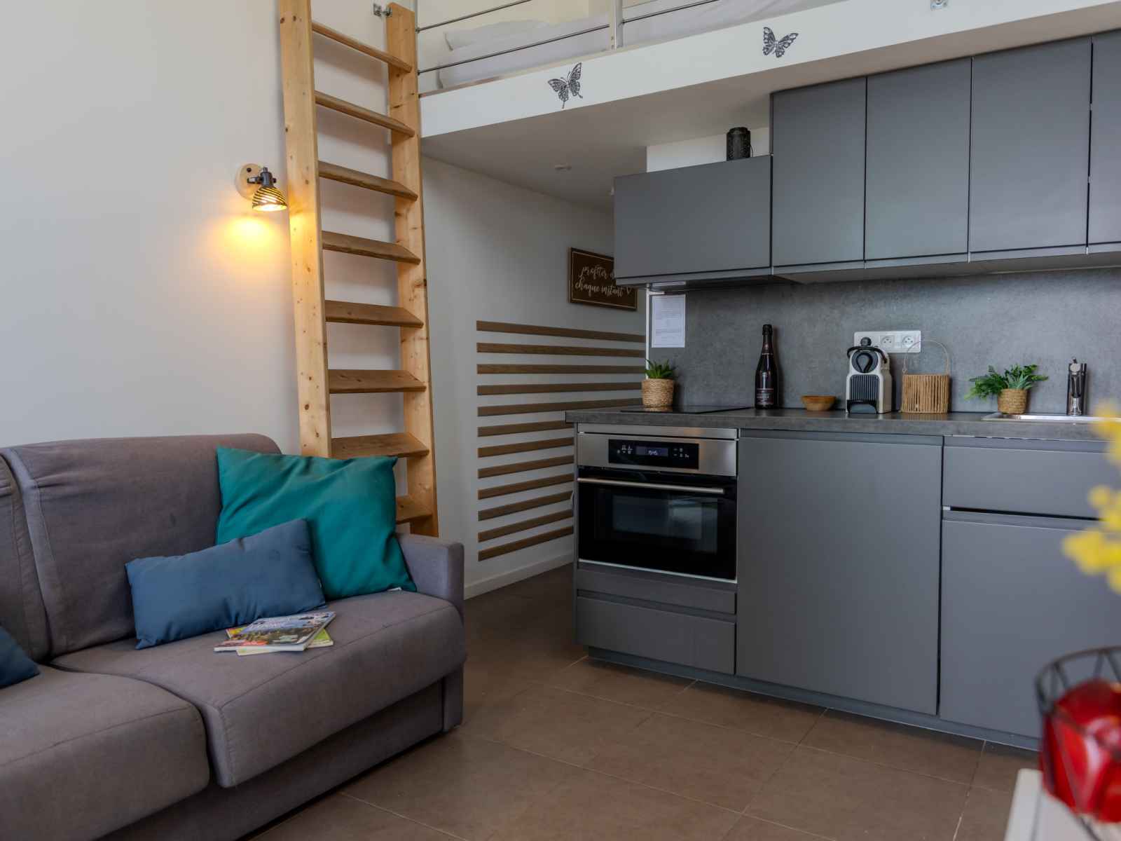 "j6 174 l'esquinade", apt 2 pièces 28 m2 sur 2 niveaux, au rez-de-chaussée. mansardé, complètement rénové en 2024, aménagement agréable et moderne: séjour/salle à manger mansardé - 330 cm avec 1 divan-lit double (140 cm, longueur 190 cm), tv (écran plat). sortie sur la terrasse. 1 chambre mansardée - 330 cm avec 1 grand-lit (140 cm,