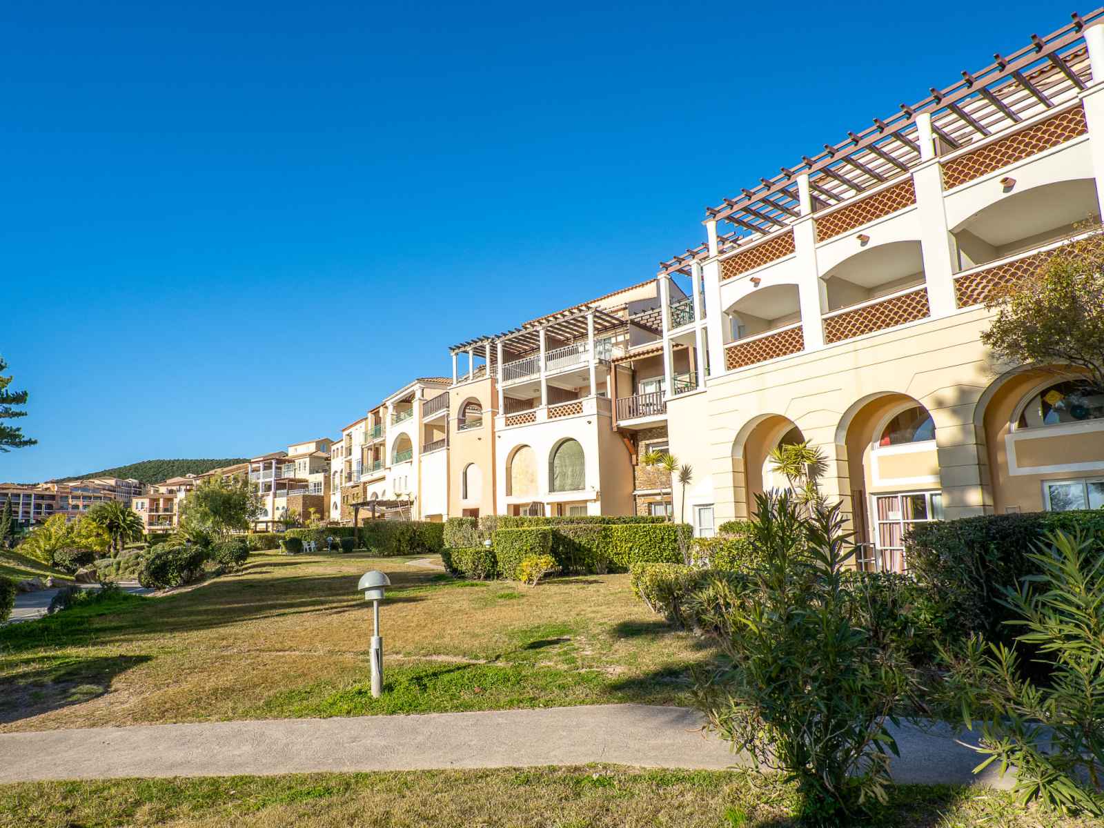 Grand complexe de vacances "village cap estérel - l'esquinade", année de construction 1990. en bordure de la localité, à 2 km du centre d'agay, sur un versant, dans un quartier résidentiel, à 900 m de la mer, à 900 m de la plage, route à traverser, en bordure du terrain de golf, dans une zone piétonne. en commun: parc 210 ha, 5 piscines