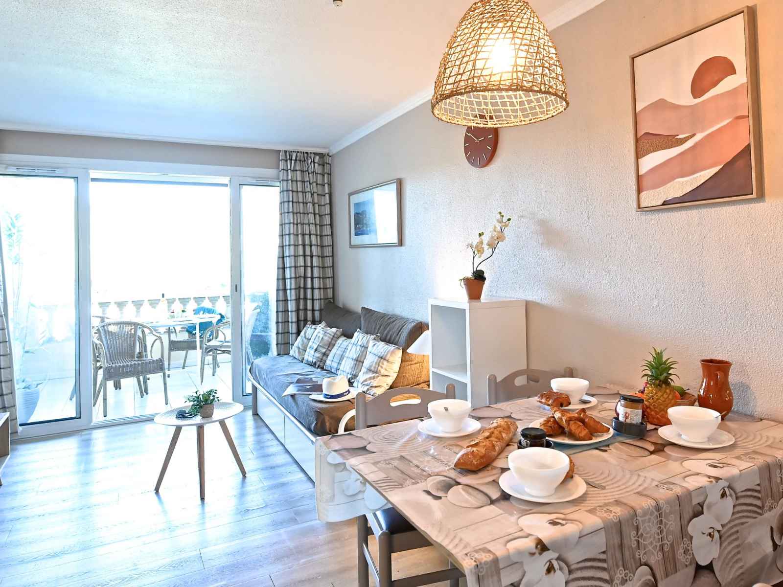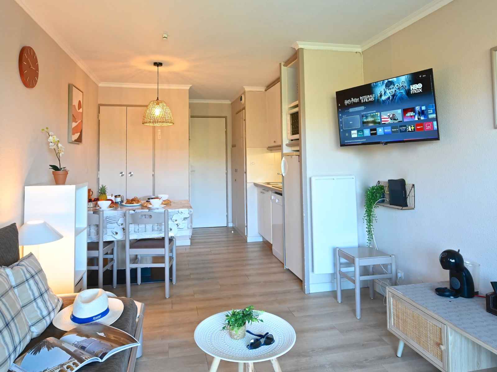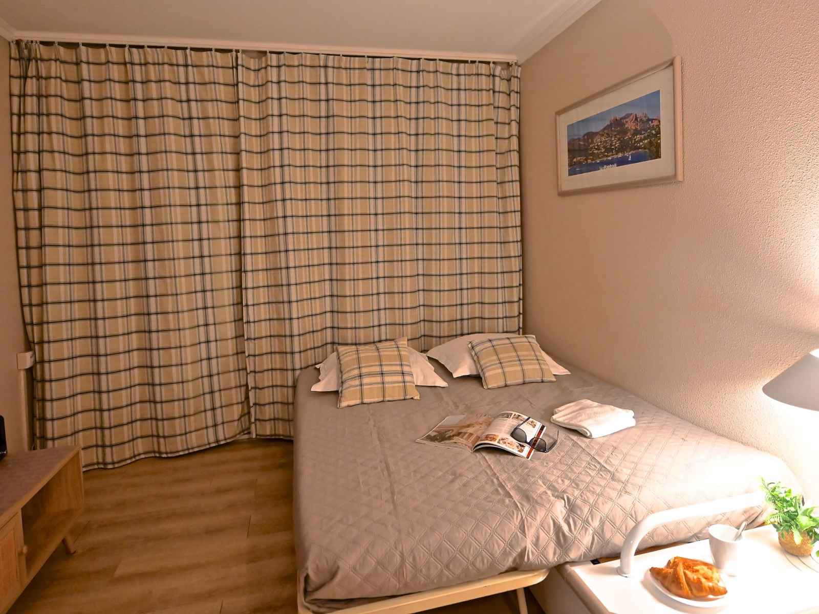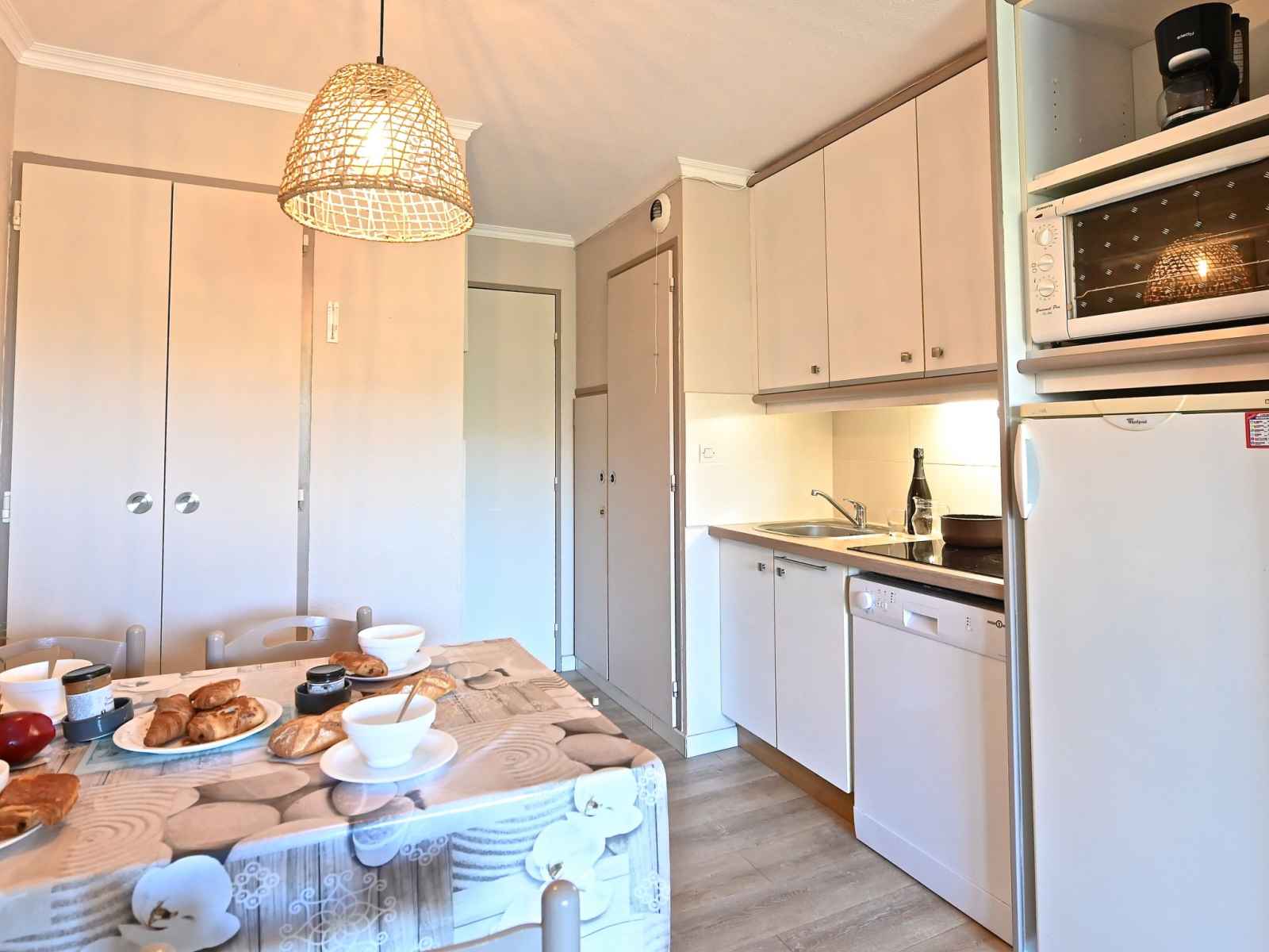 "le belvédère v1 202", apt 3 pièces 37 m2 sur 2 niveaux au 1er étage. partiellement rénové en 2025, aménagement confortable: séjour avec 1 divan-lit double (2 x 80 cm, longueur 190 cm), tv (écran plat), air-conditionné. sortie sur la terrasse. coin cuisine (lave-vaisselle, 4 plaques vitrocéramiques, grille-pain, bouilloire électrique,
