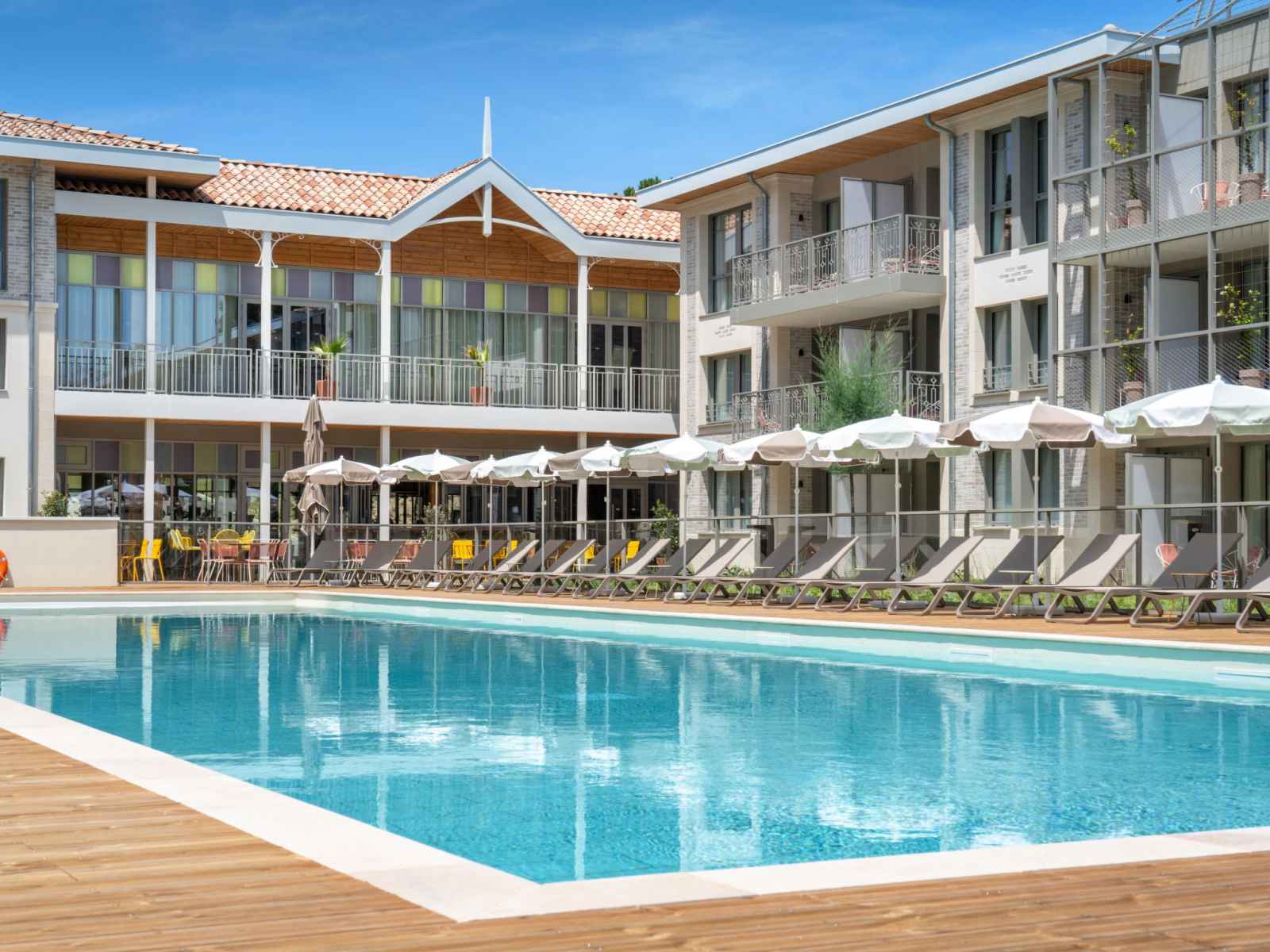 Belle résidence hôtelière "la résidence", de 3 étages, année de construction 2025. en bordure de la localité, à 3 km du centre d'arcachon, dans un quartier résidentiel, à 10 m de la forêt, à 100 m de la mer, à 100 m de la plage. en commun: parc 6'290 m2 (clôturé), piscine chauffée (28 x 7 m, profondeur 100 - 150 cm, disponibilité