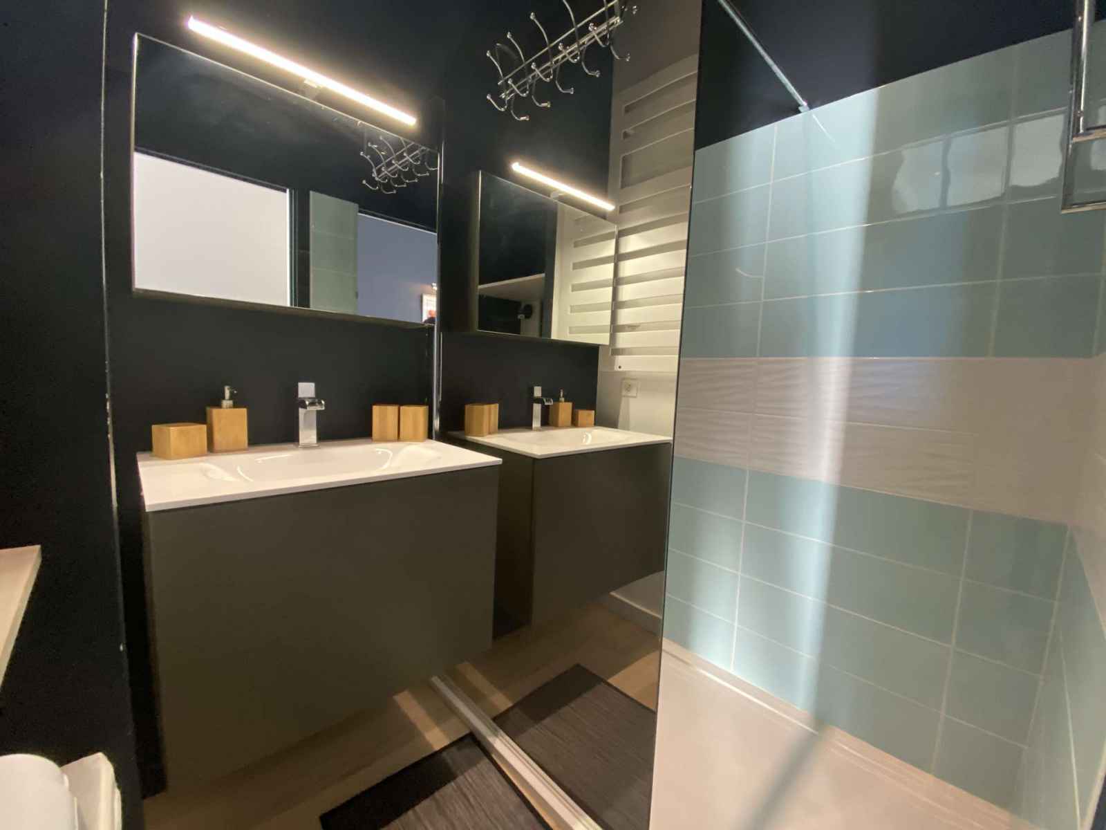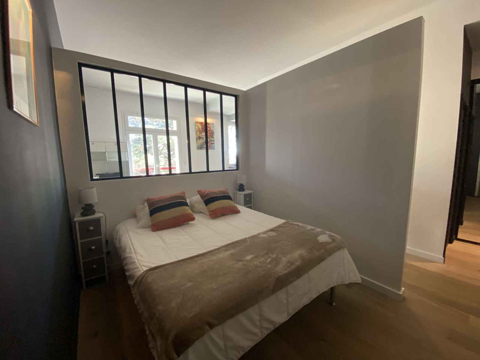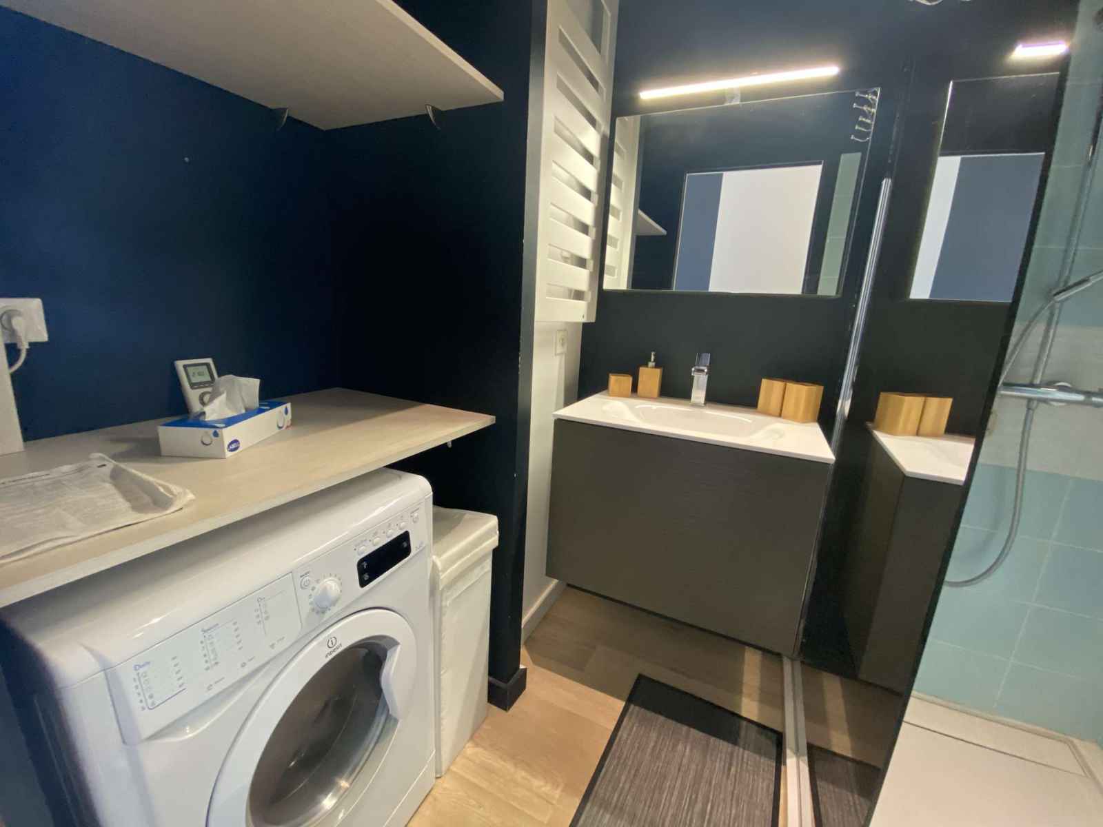 Cet appartement se compose d’une entrée avec WC séparé et lave-mains, d'un coin chambre séparé par une élégante verrière, avec un lit 160 cm et des placards. La salle d’eau, moderne, dispose d'une douche à l'italienne, d’une vasque et d’un lave-linge-séchant.