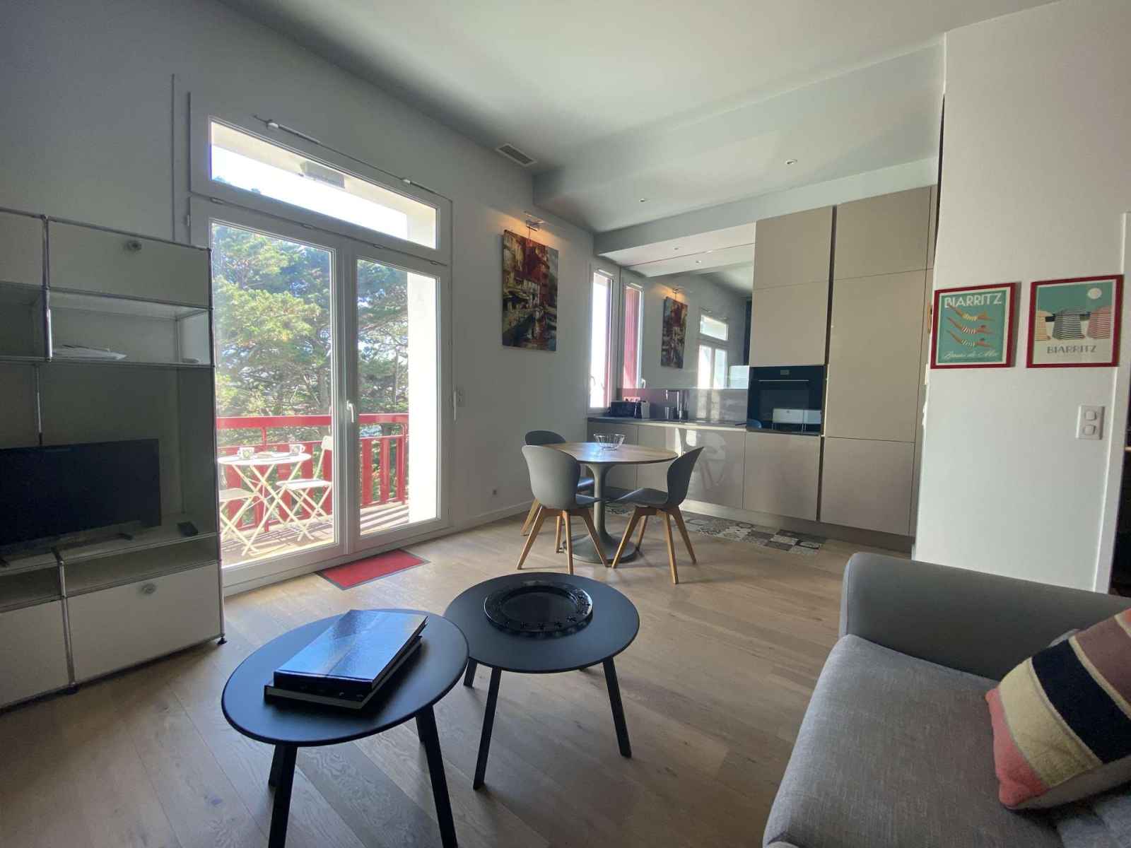 La pièce de vie spacieuse inclut un canapé, une télévision et une cuisine ouverte, aménagée et entièrement équipée (réfrigérateur/congélateur, four, plaque à induction 2 foyers, micro-ondes, grille-pain, cafetière NESPRESSO, etc.). L’ensemble s'ouvre sur un balcon de 3 m² exposé Sud, offrant une belle vue sur le bassin et un espace idéal pour vos repas en extérieur.
