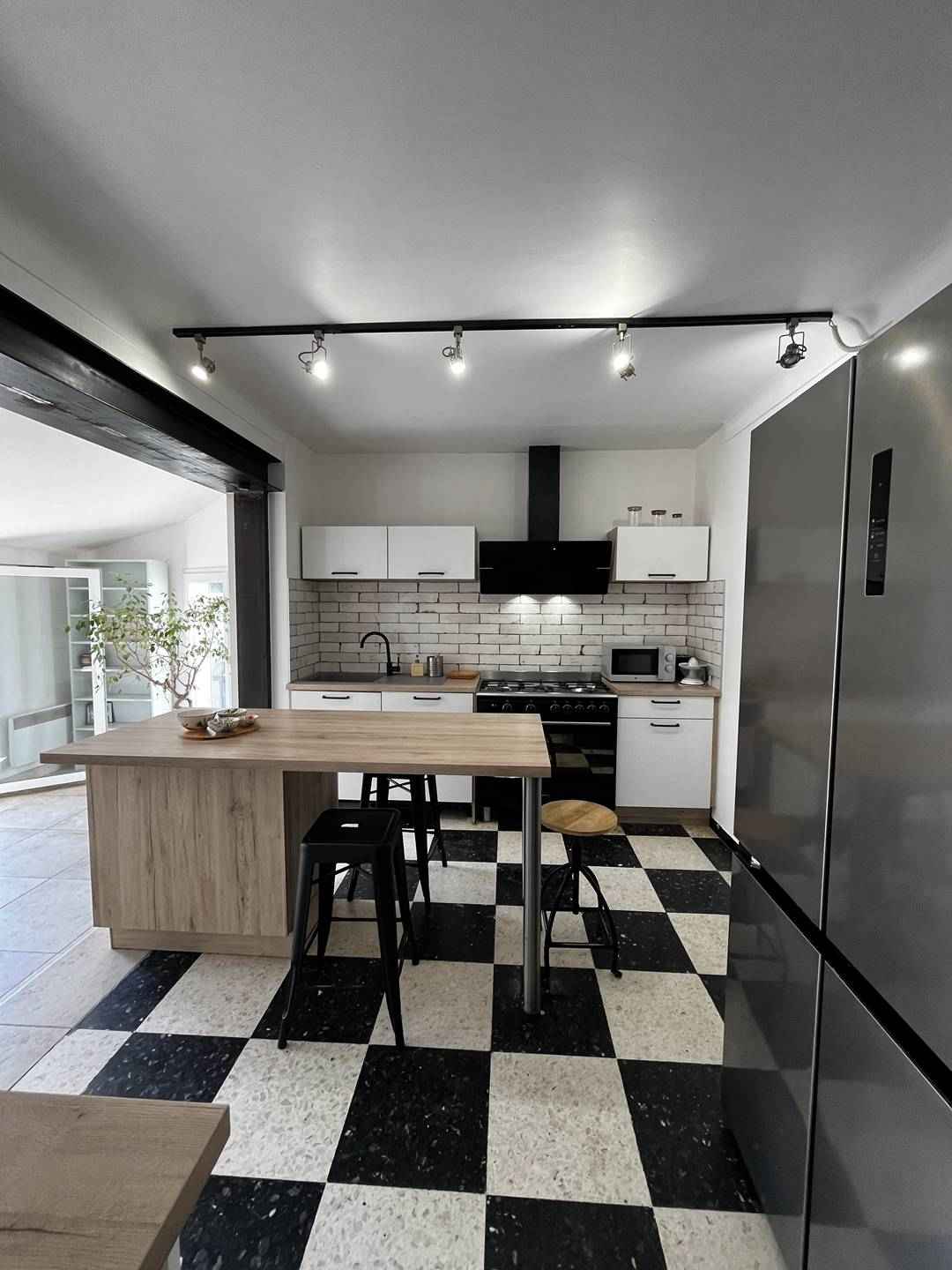 d'une cuisine équipée, micro-onde, plaque de cuisson, réfrigérateur congélateur.