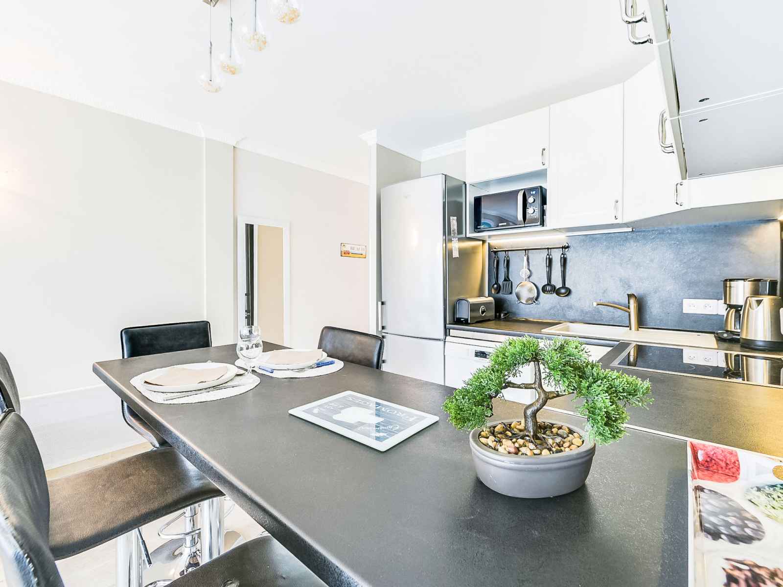 Apt 2 pièces 34 m2 au 1er étage. complètement rénové, aménagement confortable et agréable: séjour/salle à manger avec 1 divan-lit double (140 cm), tv (écran plat), air-conditionné. sortie sur la terrasse. 1 chambre avec 1 lit double (160 cm). cuisine ouverte (four, lave-vaisselle, 4 plaques vitrocéramiques, micro-ondes, cafetière