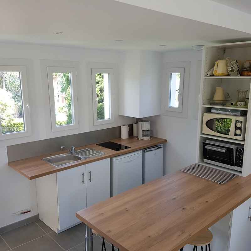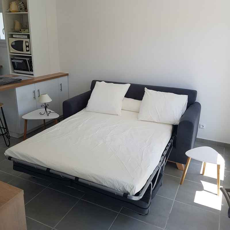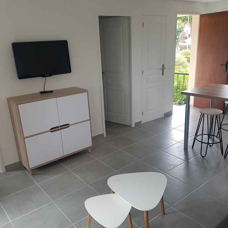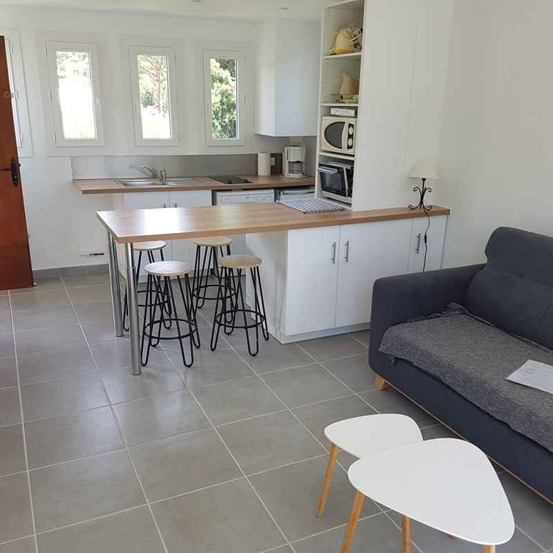 composition : entrée, cuisine américaine équipée avec lave-vaisselle, frigo-top,four et micro-ondes. plaques vitro, séjour équipé avec un canapé convertible 140, chambre