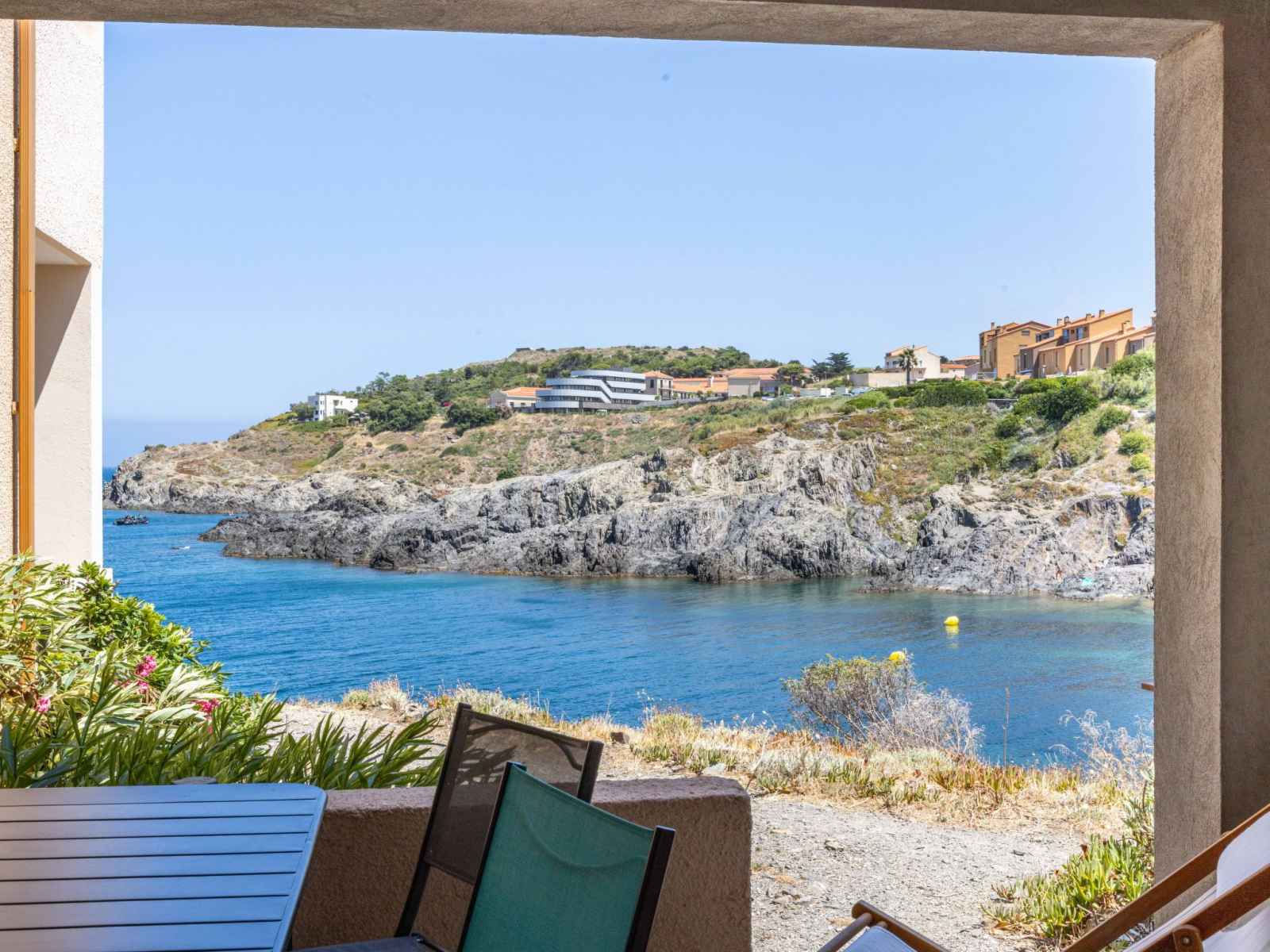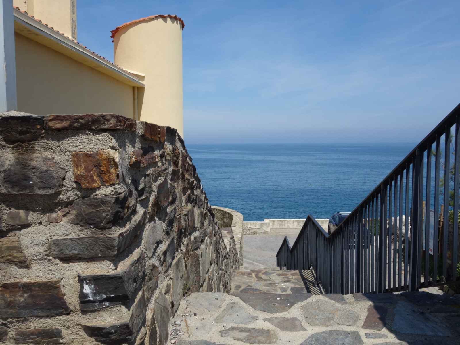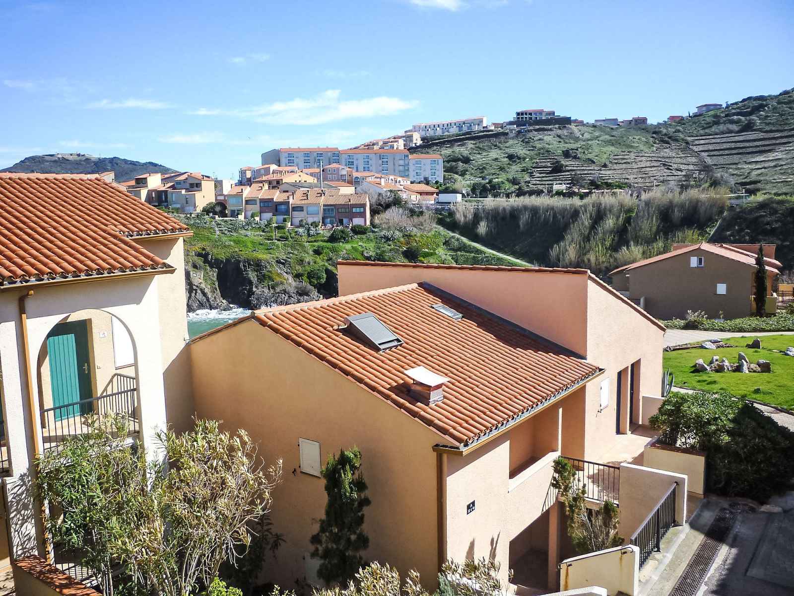 A flanc de falaise et dominant la baie avec accès direct à une crique (petite plage de sable et graviers) résidence "les roches bleues". en bordure de la localité, à 1.5 km du centre de collioure, à 200 m de la mer, à 200 m de la plage. magasins 1 km, supermarché 400 m, restaurant 500 m, arrêt de bus 300 m, gare ferroviaire "collioure"