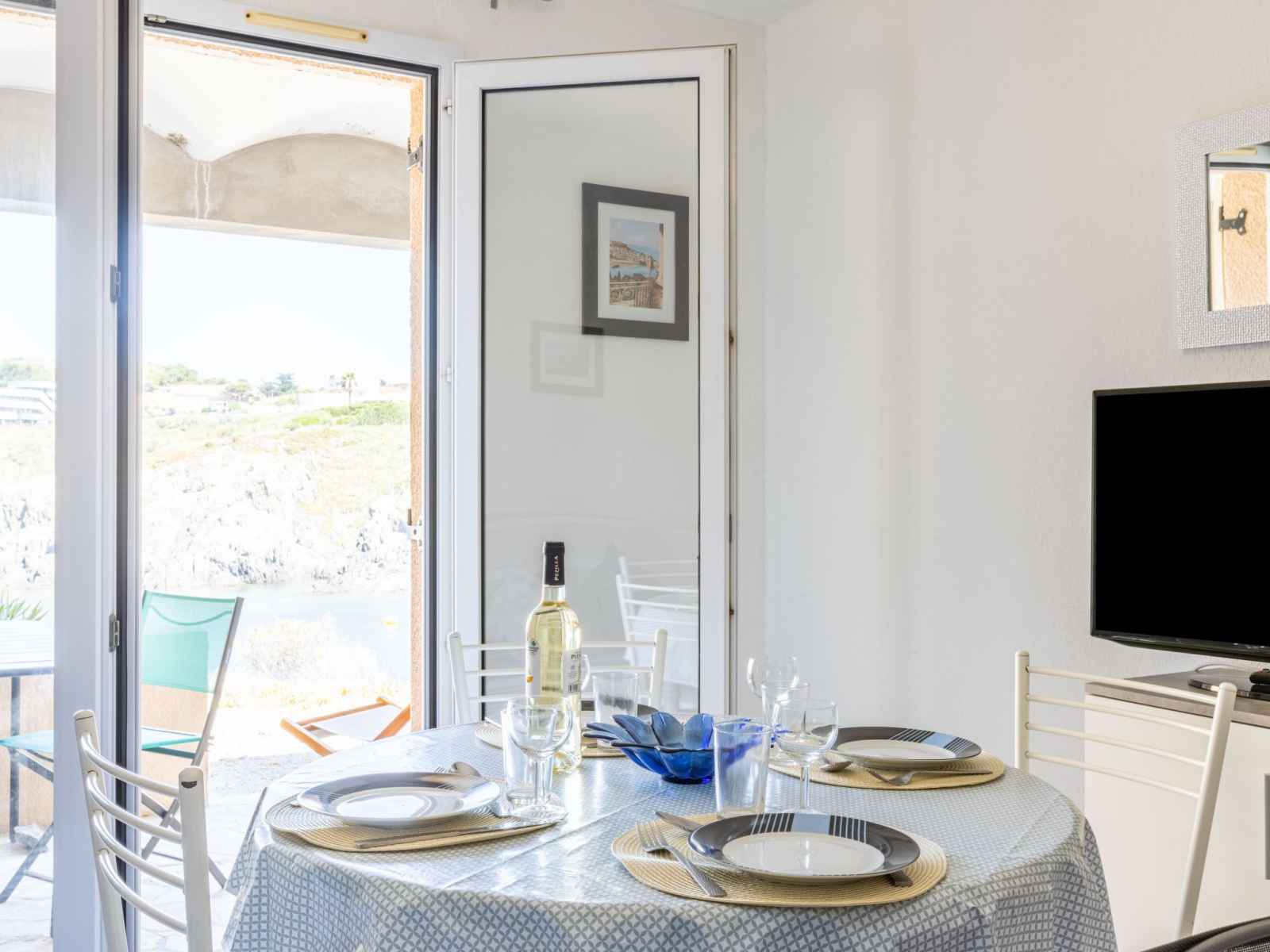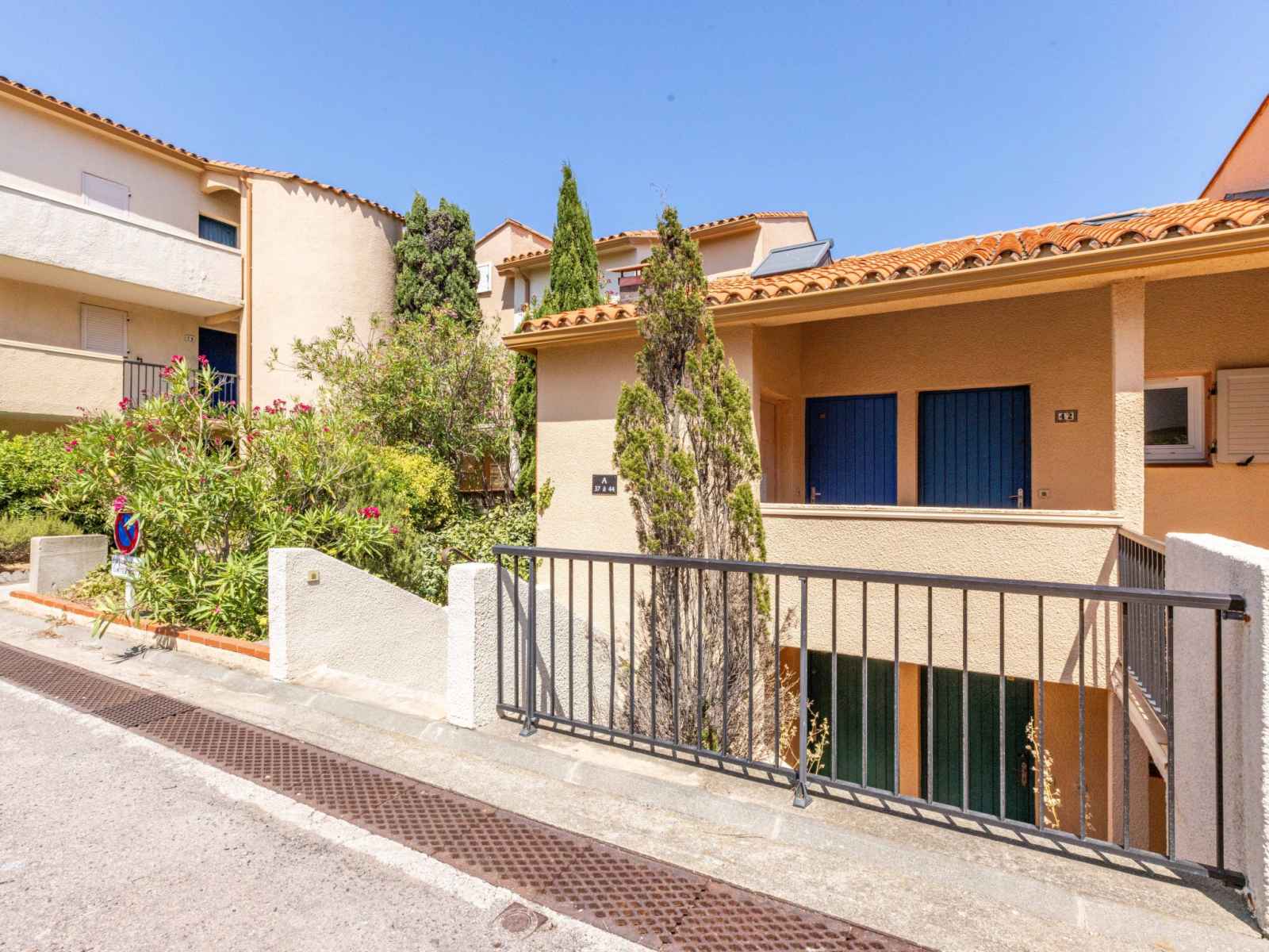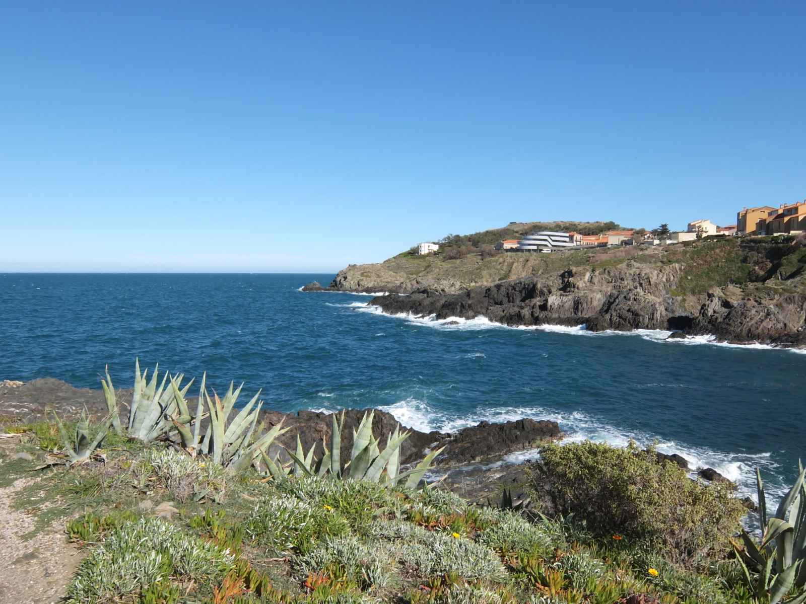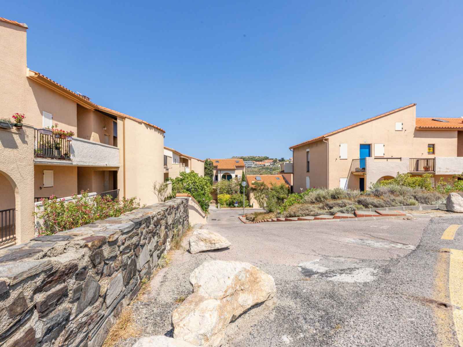 A flanc de falaise et dominant la baie avec accès direct à une crique (petite plage de sable et graviers) résidence "les roches bleues". en bordure de la localité, à 1.5 km du centre de collioure, à 200 m de la mer, à 200 m de la plage. magasins 1 km, supermarché 400 m, restaurant 500 m, arrêt de bus 300 m, gare ferroviaire "collioure"