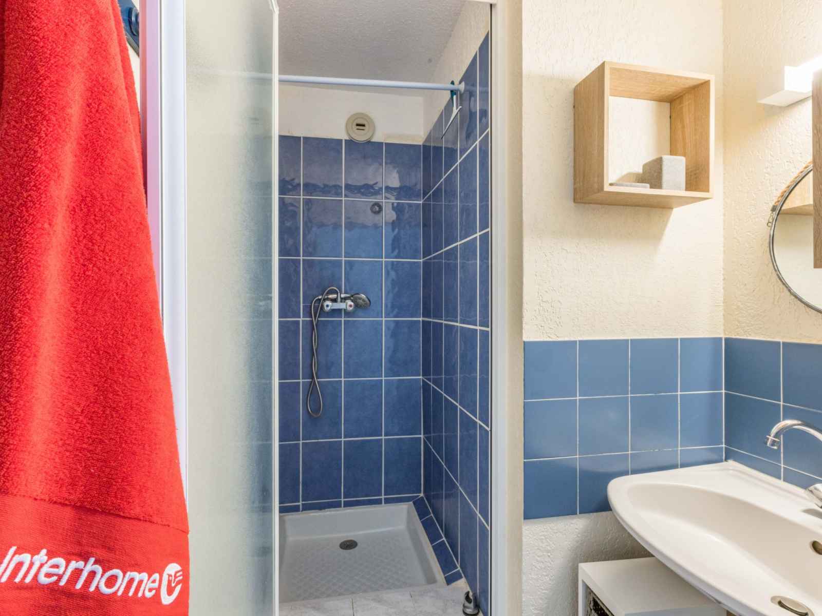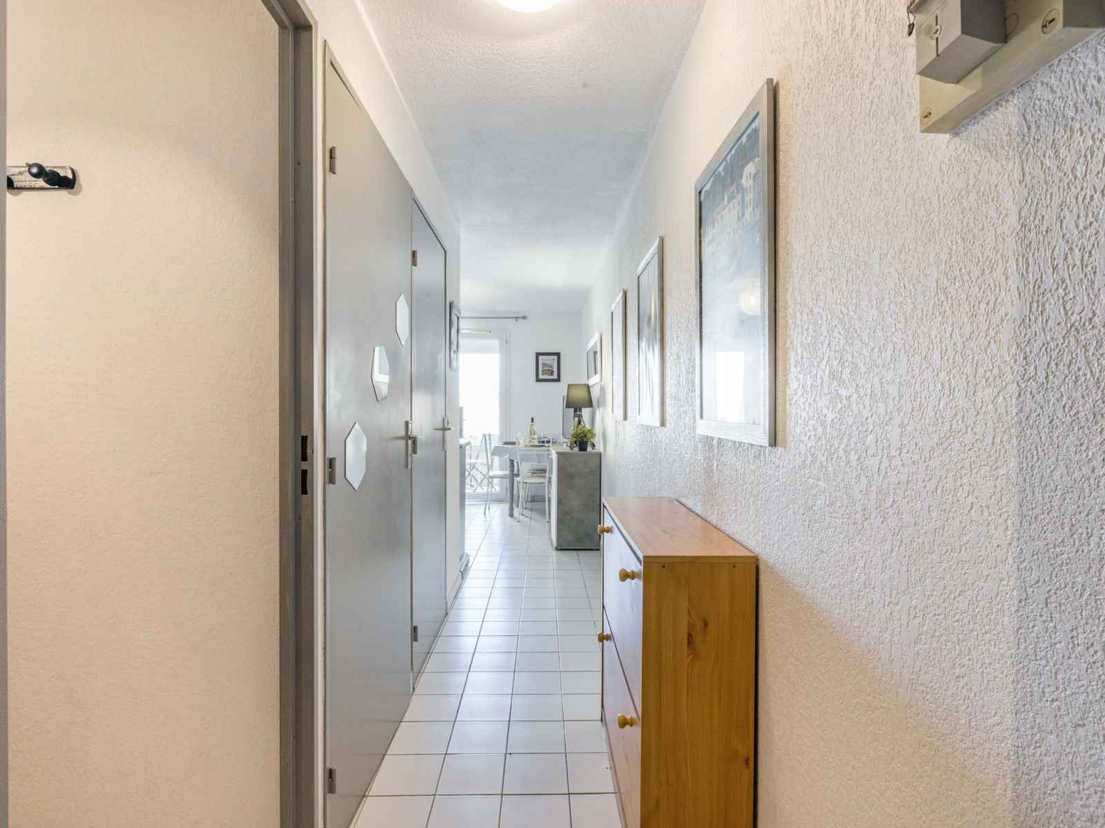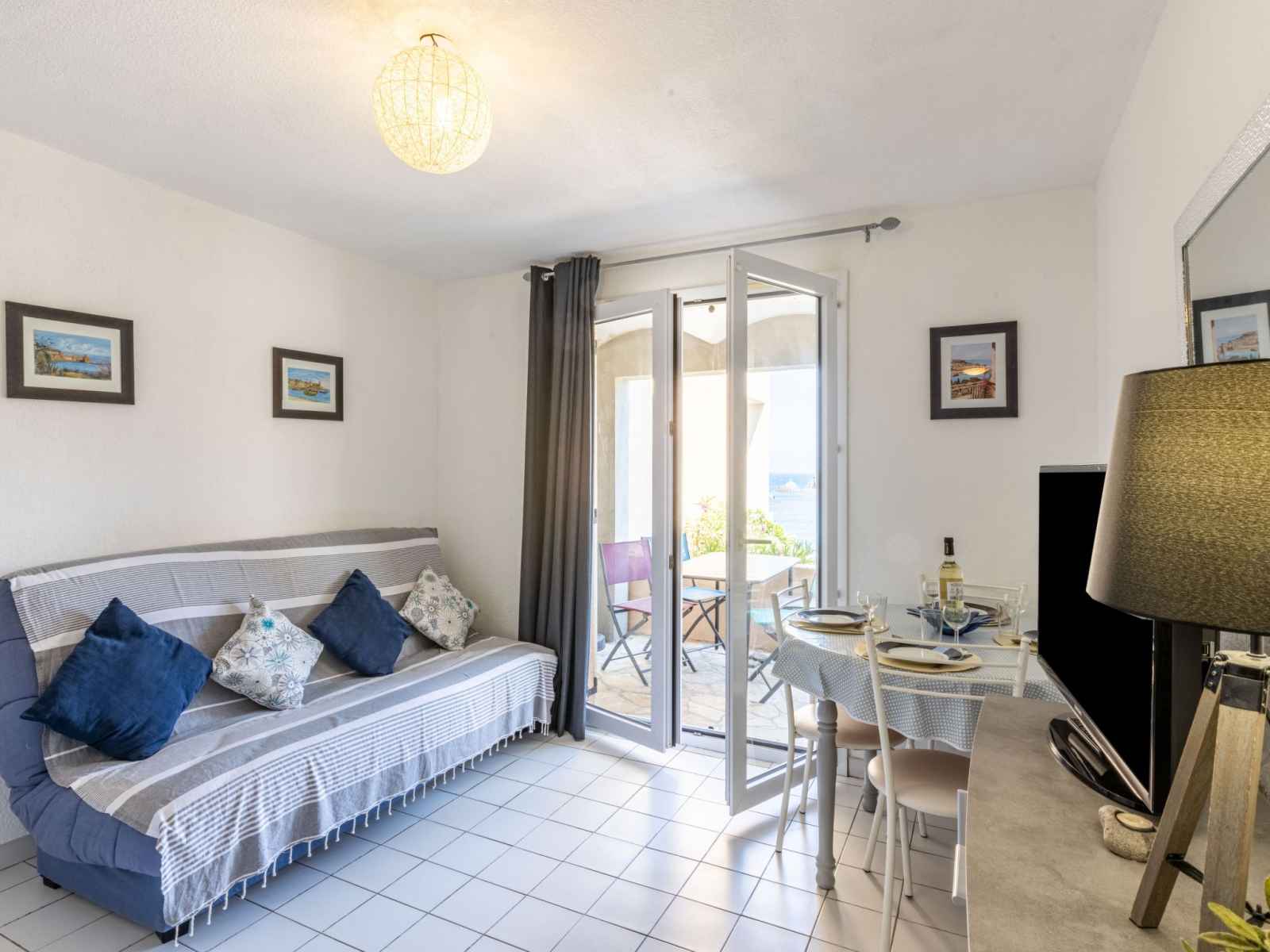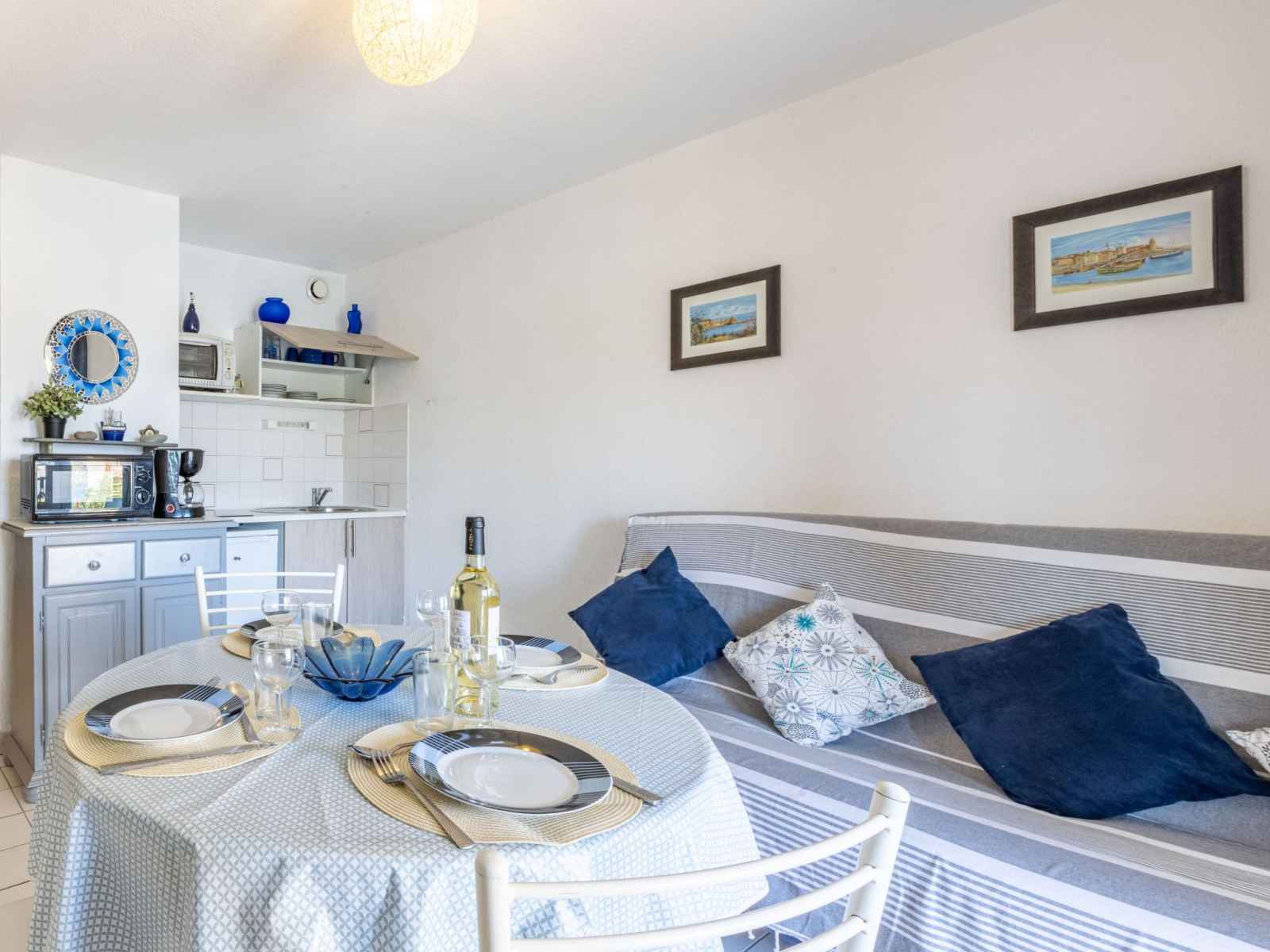 Apt 2 pièces 25 m2, au rez-de-chaussée. séjour/salle à manger avec 1 divan-lit double et tv. sortie sur le balcon. 1 petite chambre avec 1 x 2 lits superposés (90 cm). coin cuisine (2 plaques de cuisson, mini-four, micro-ondes). douche, wc séparé. balcon 5 m2, situation est. meubles de terrasse. belle vue sur la mer. garage. l'accès à