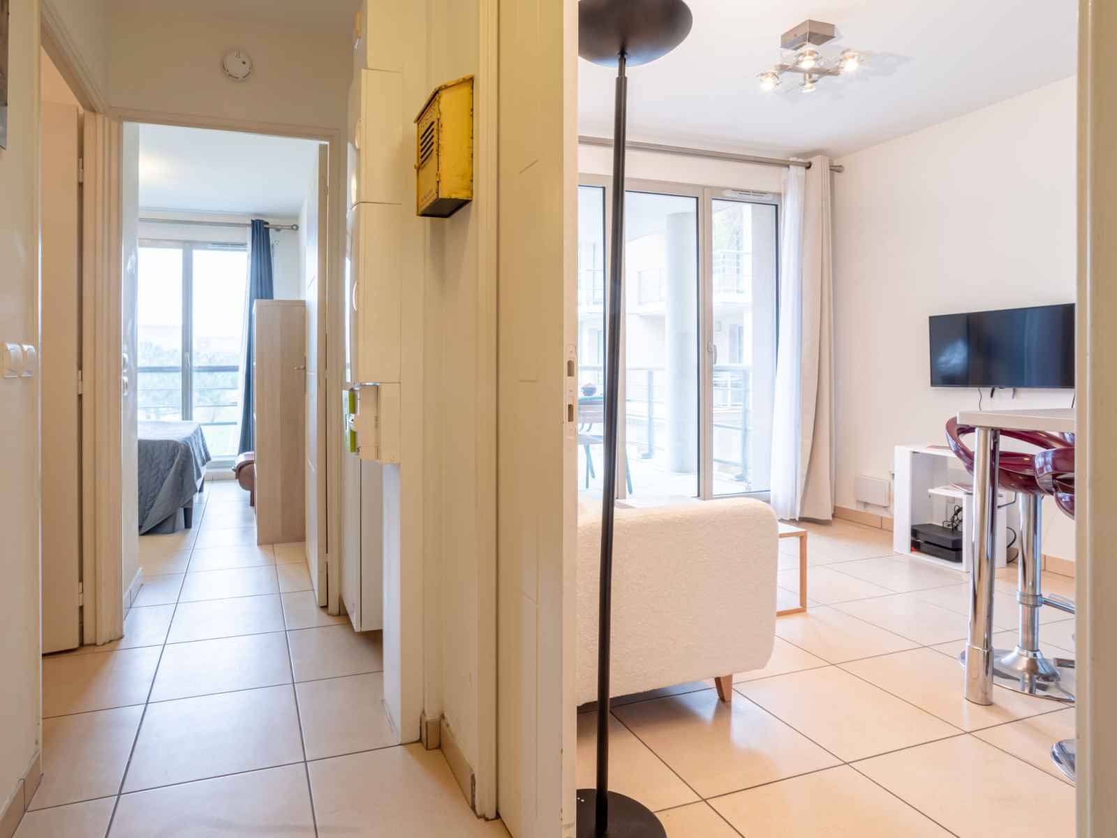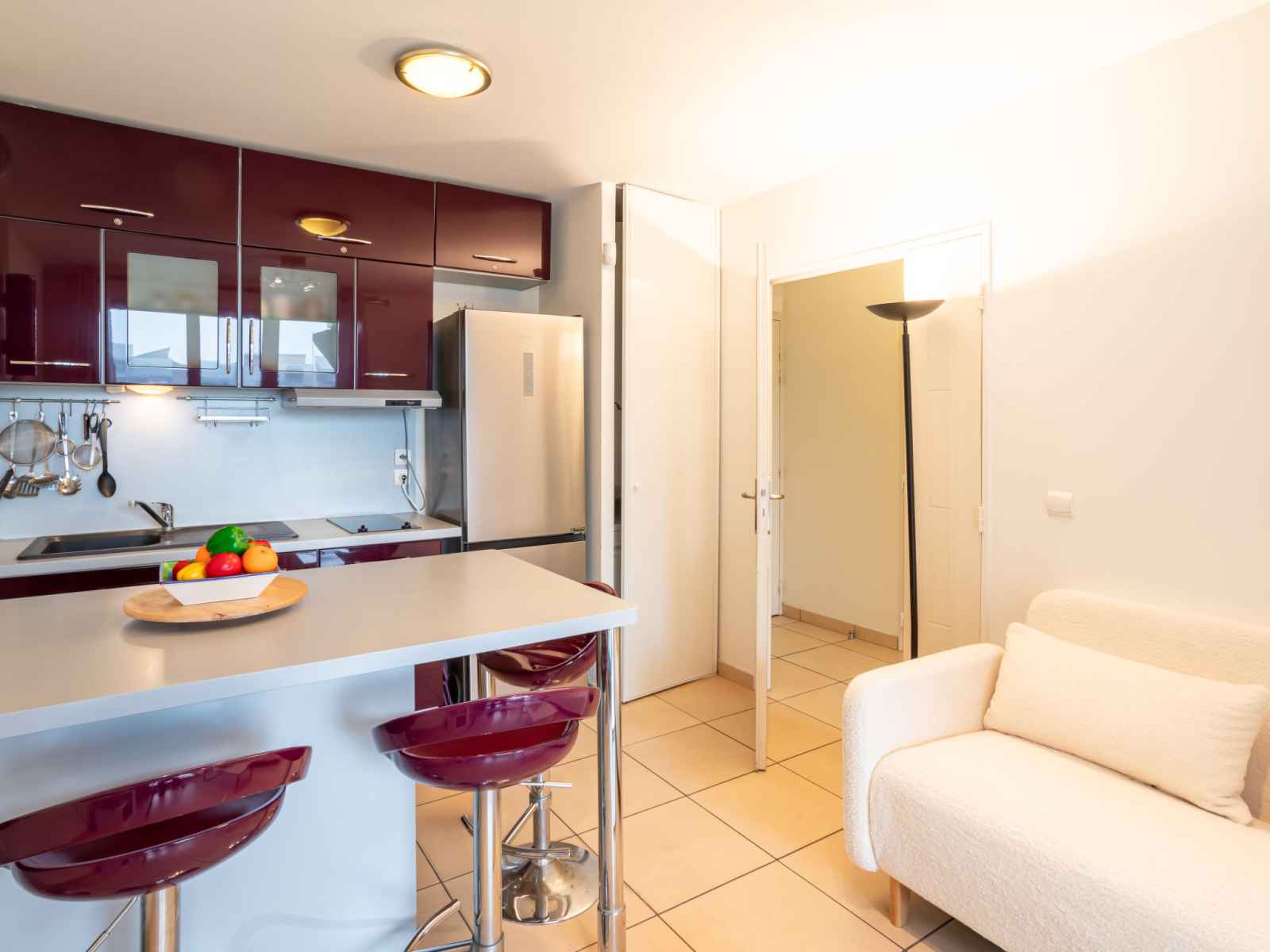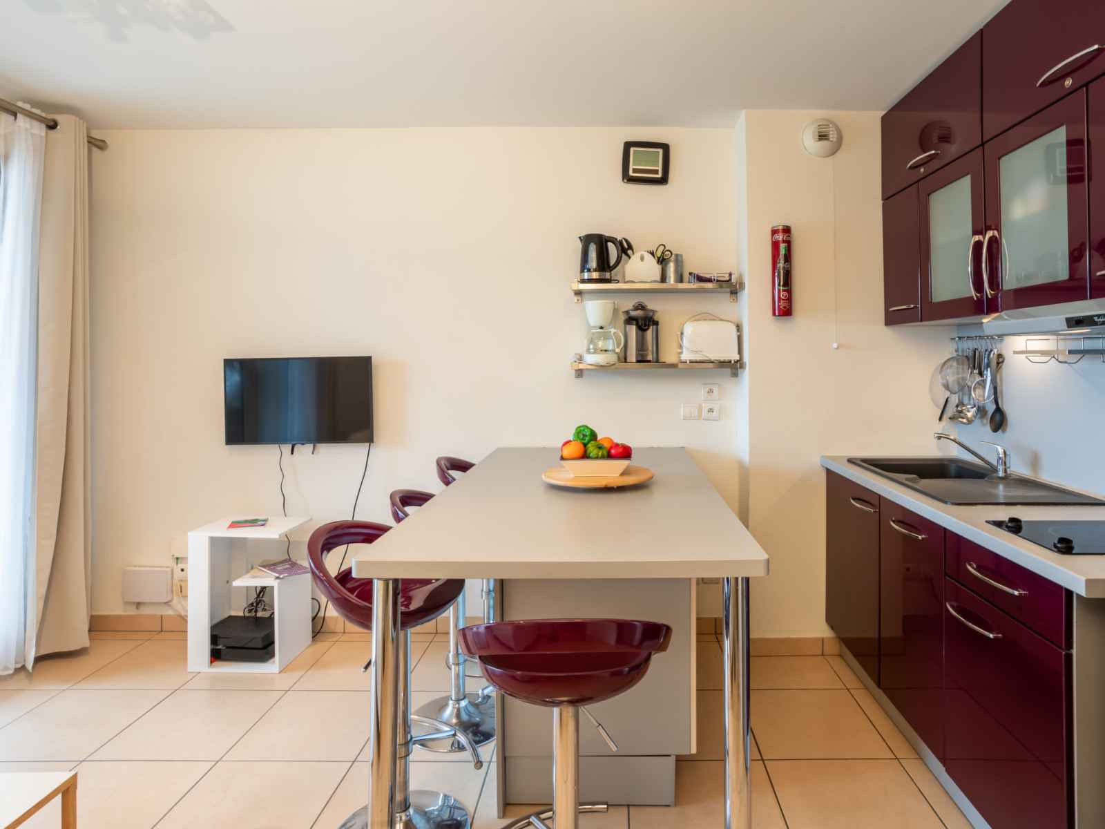 Apt 2 pièces 38 m2 au 1er étage. entrée. séjour/salle à manger avec tv (écran plat). sortie sur la terrasse. 1 chambre avec 1 grand-lit (1 x 160 cm, longueur 200 cm). cuisine ouverte (2 plaques de cuisson, lave-vaisselle, grille-pain, bouilloire électrique, congélateur, cafetière électrique, combiné micro-ondes). douche, wc séparé.