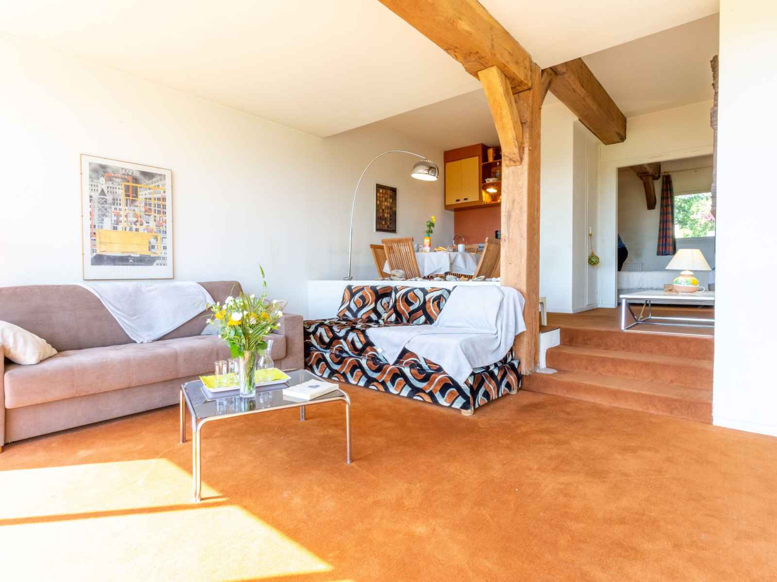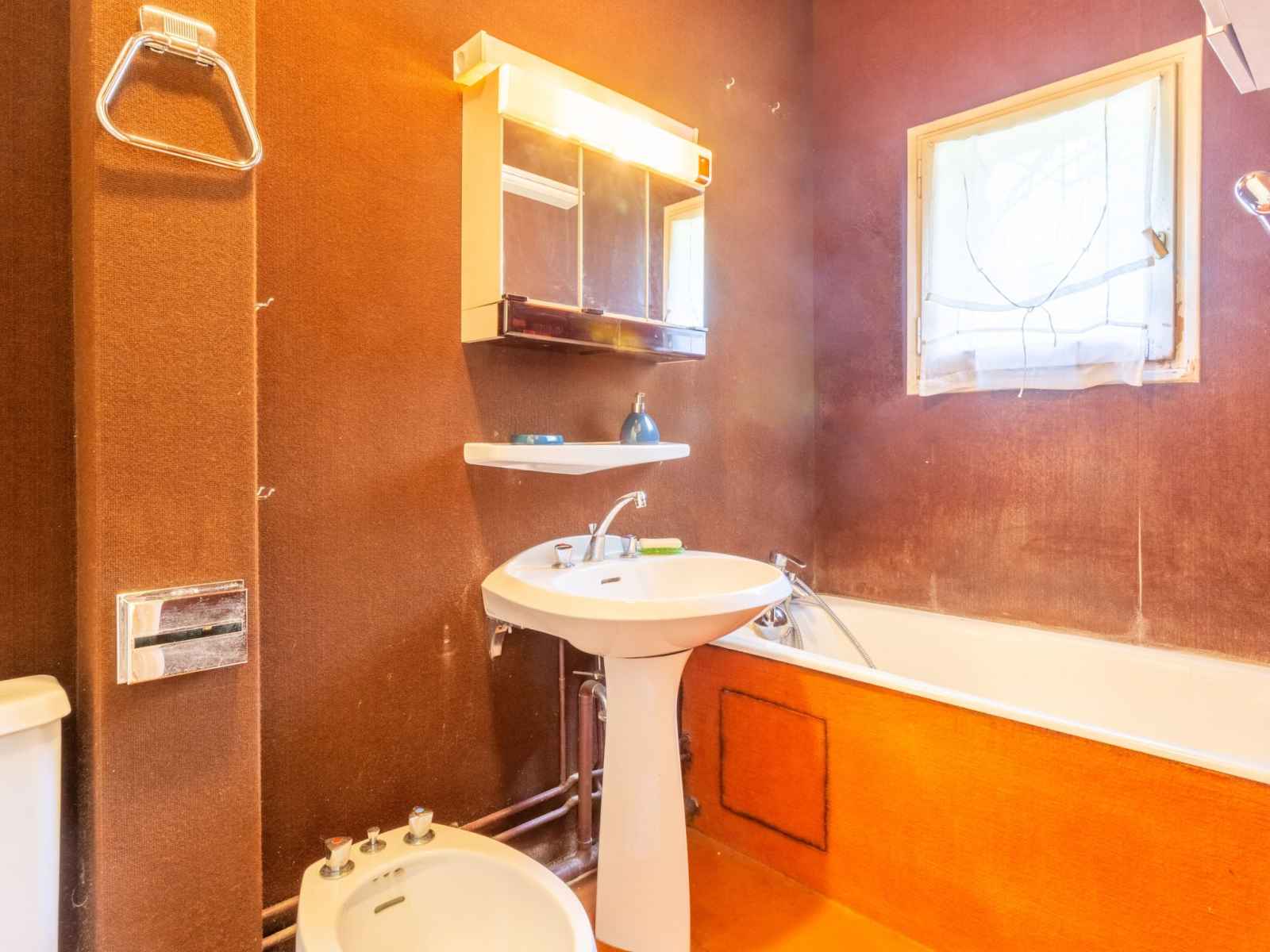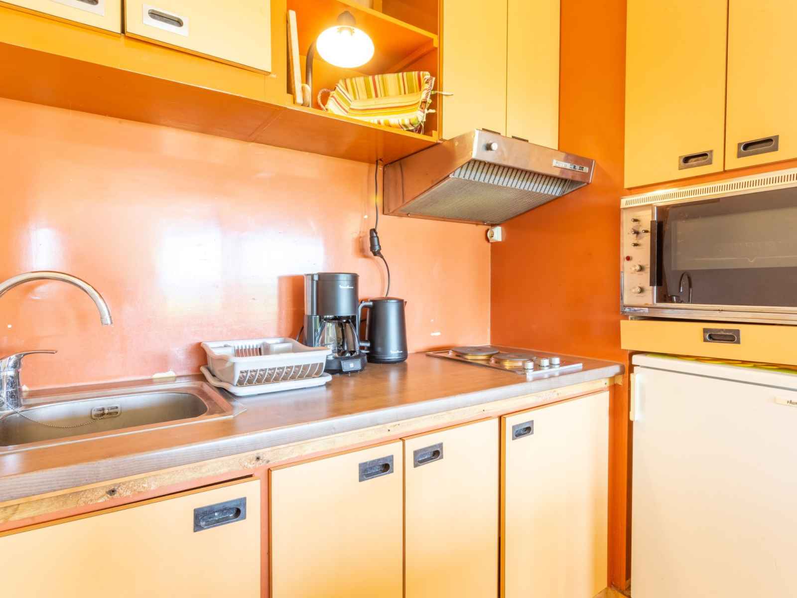 Appartement sur 2 niveaux 2 pièces 50 m2, au rez-de-chaussée, situation ouest. entrée. 1 chambre avec 2 lits (90 cm, longueur 190 cm), bain/wc. cuisine ouverte (2 plaques de cuisson, four, grille-pain, bouilloire électrique, cafetière électrique) avec table pour les repas. chauffage. À l'étage inférieur: salon avec baie vitrée avec 1