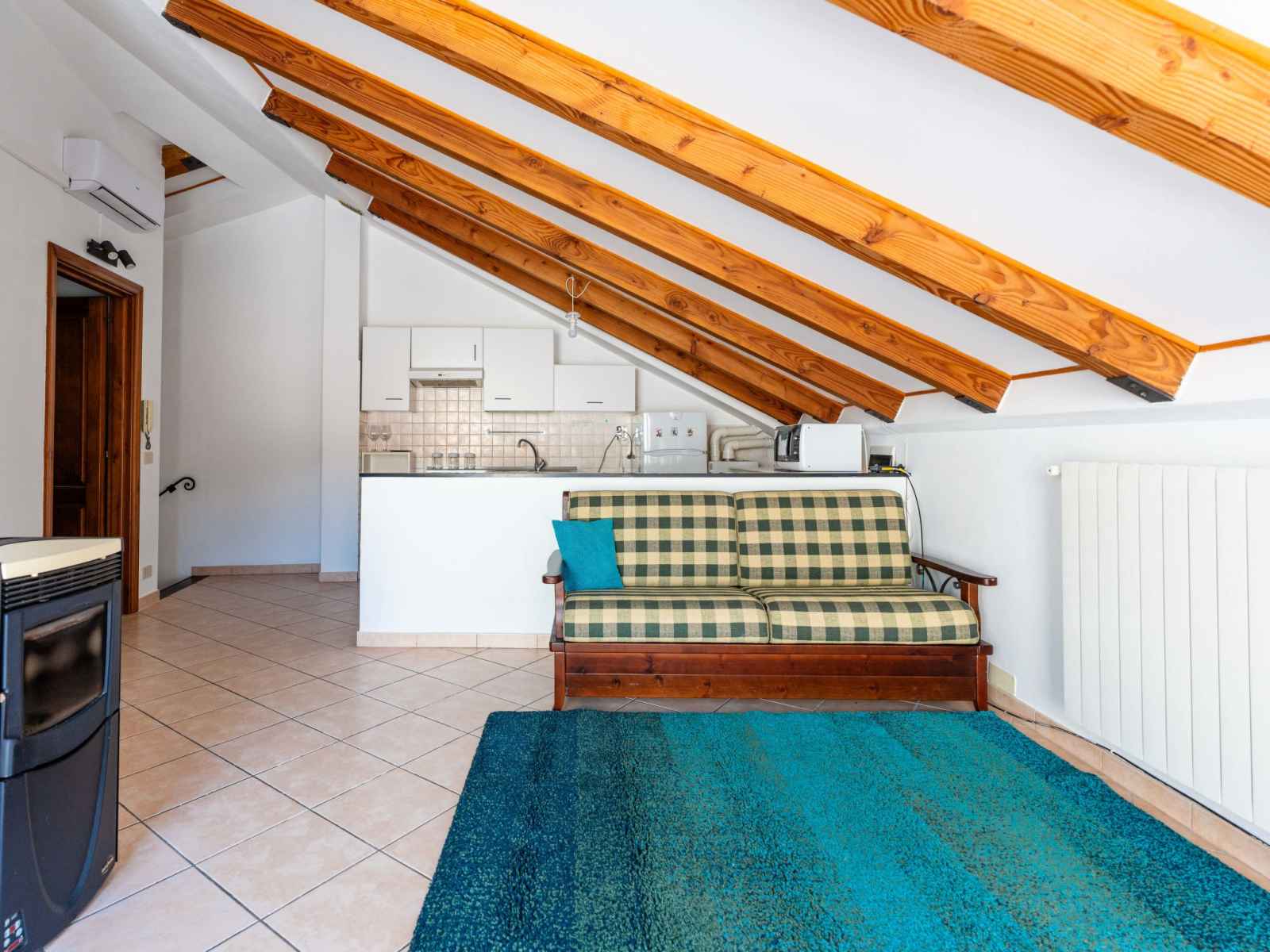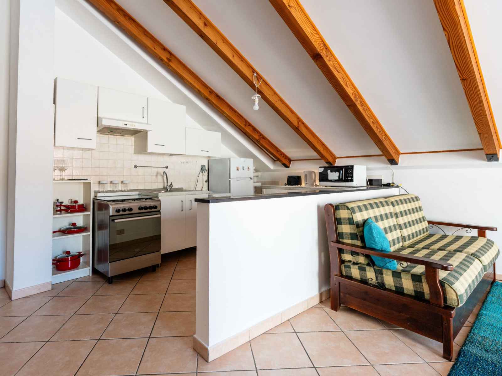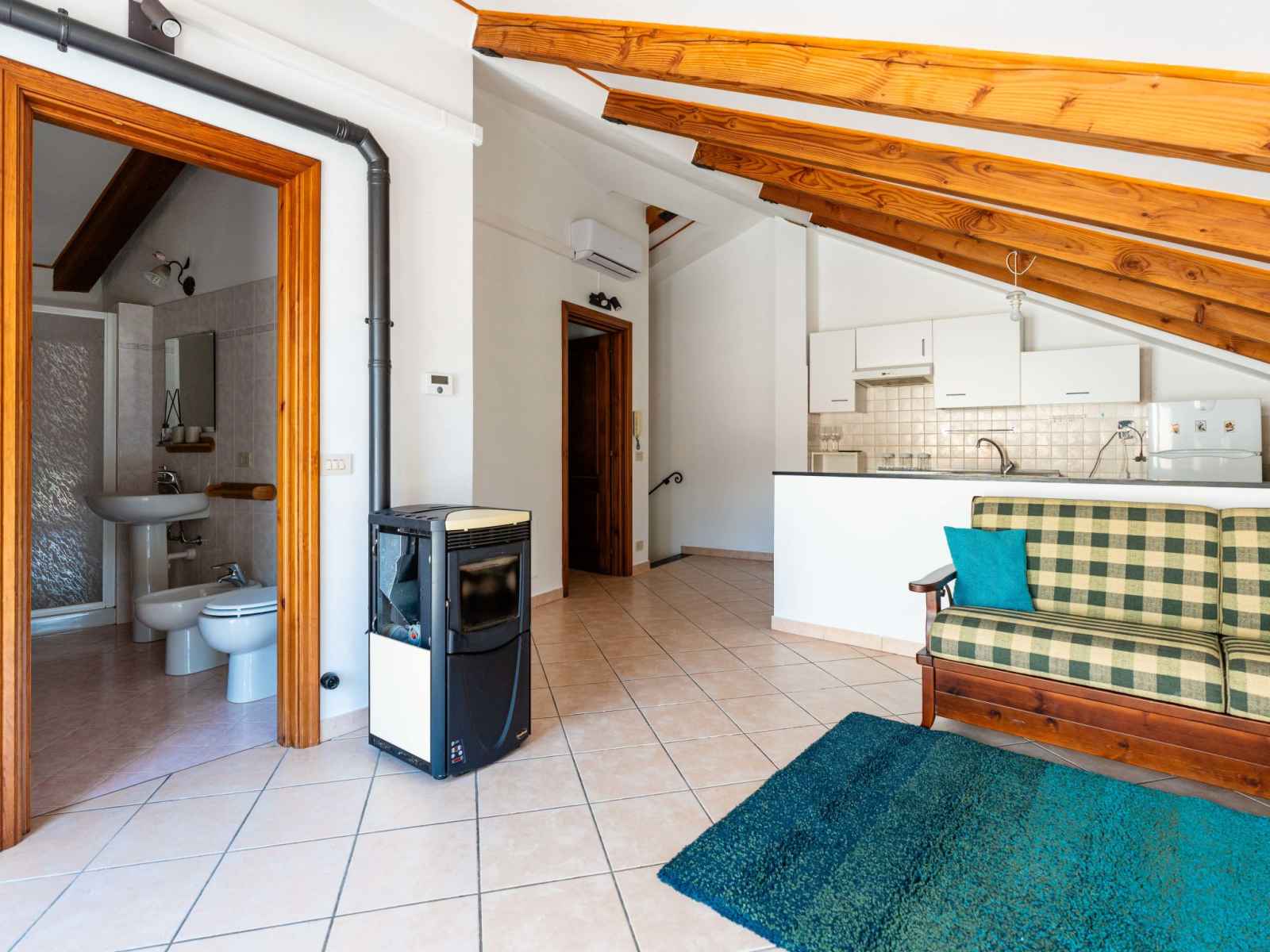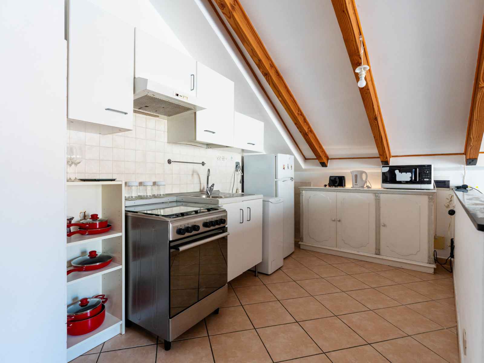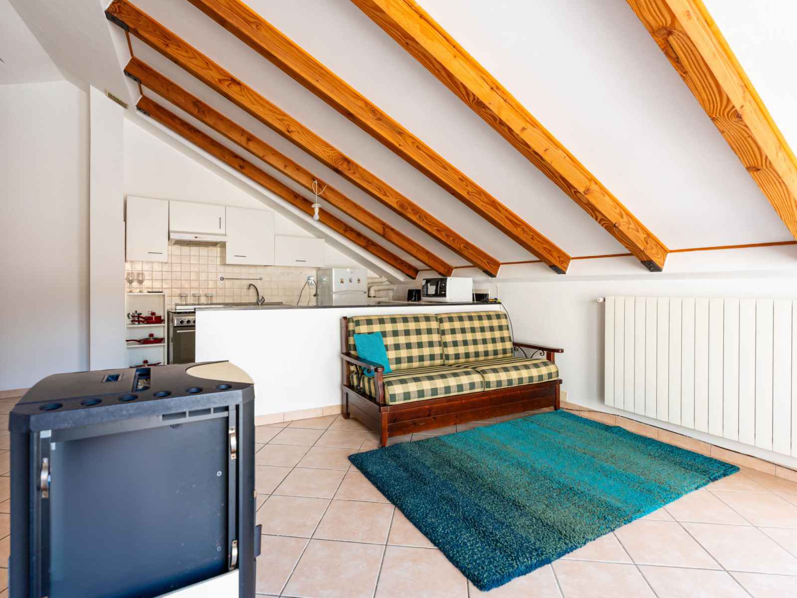"mansarda", apt 2 pièces 50 m2, sous le toit. mansardé, aménagement fonctionnel et plaisant: séjour/salle à manger avec 1 divan-lit double (160 cm, longueur 200 cm). sortie sur la terrasse. 1 chambre double hauteur plafond 100 - 220 cm. coin cuisine (four, 4 feux, grille-pain, bouilloire électrique). douche/bidet/wc. chauffage au gaz,
