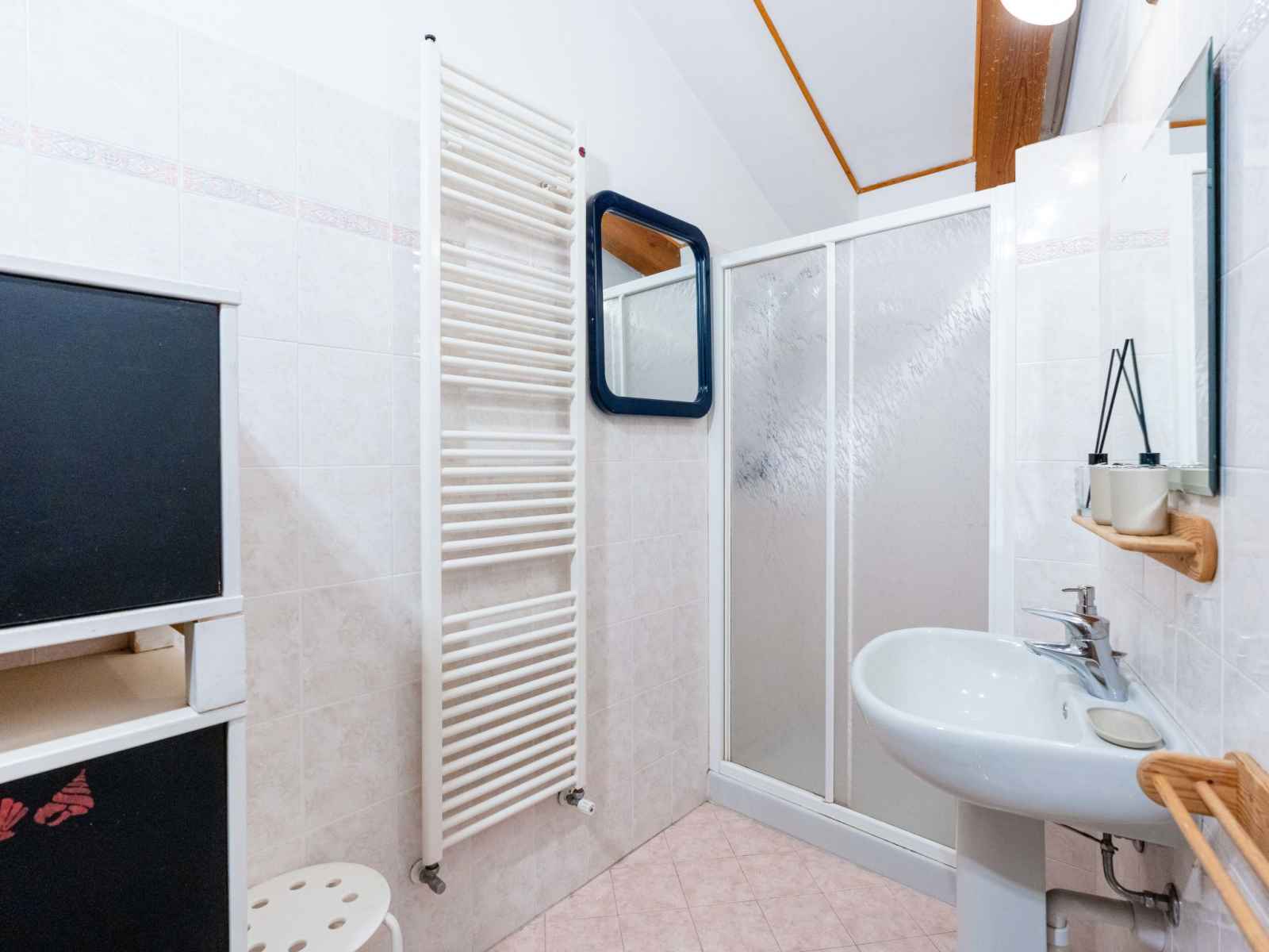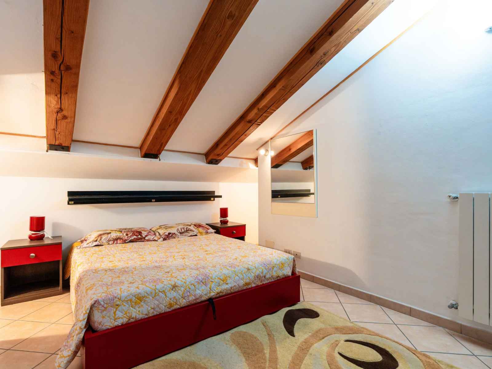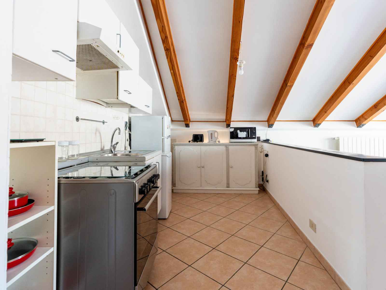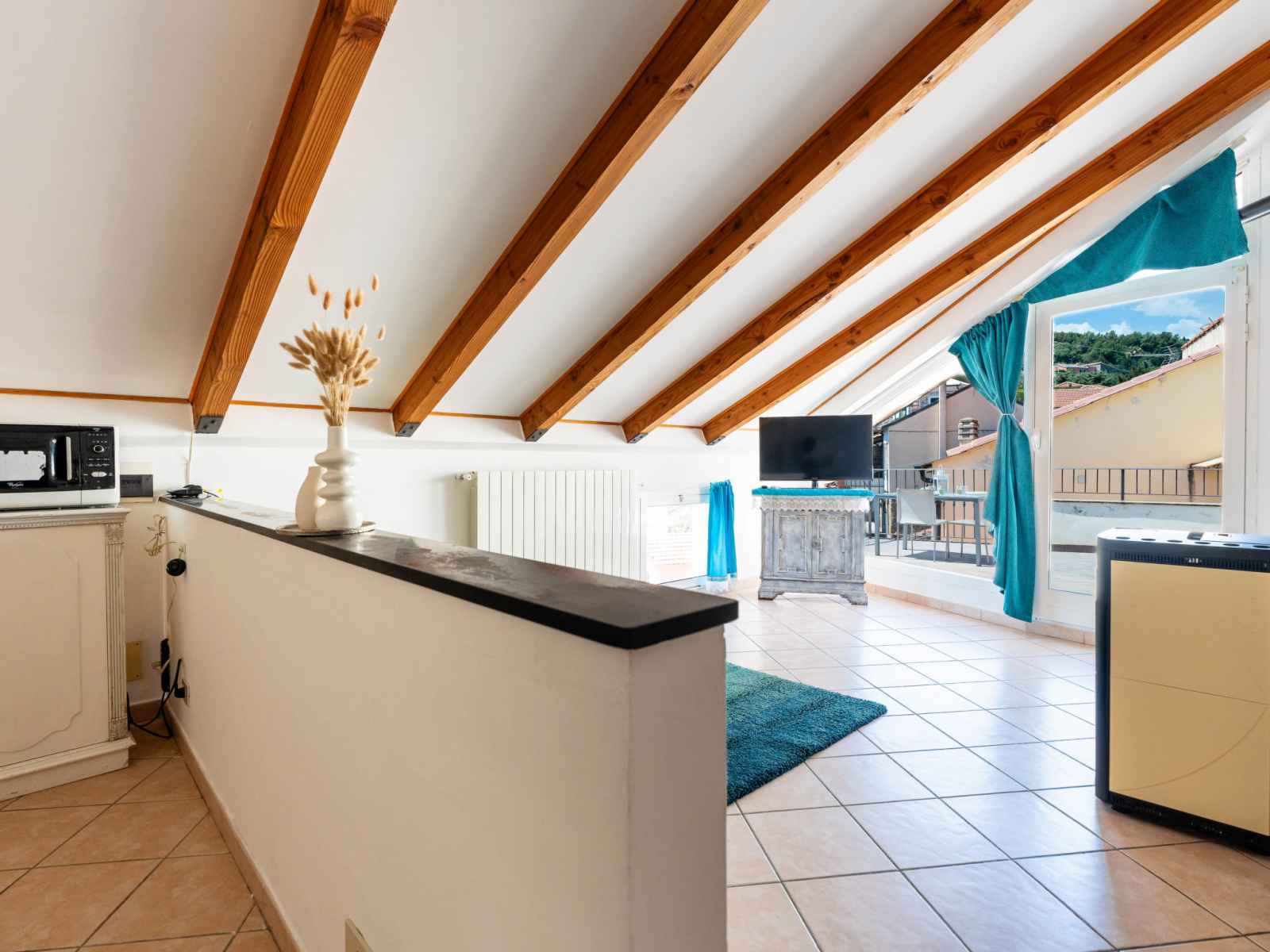 "mansarda", apt 2 pièces 50 m2, sous le toit. mansardé, aménagement fonctionnel et plaisant: séjour/salle à manger avec 1 divan-lit double (160 cm, longueur 200 cm). sortie sur la terrasse. 1 chambre double hauteur plafond 100 - 220 cm. coin cuisine (four, 4 feux, grille-pain, bouilloire électrique). douche/bidet/wc. chauffage au gaz,