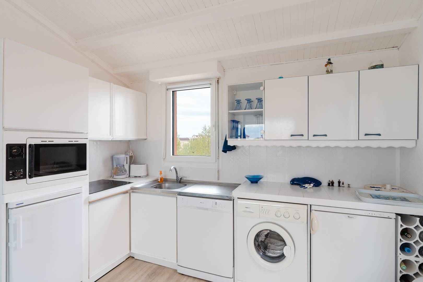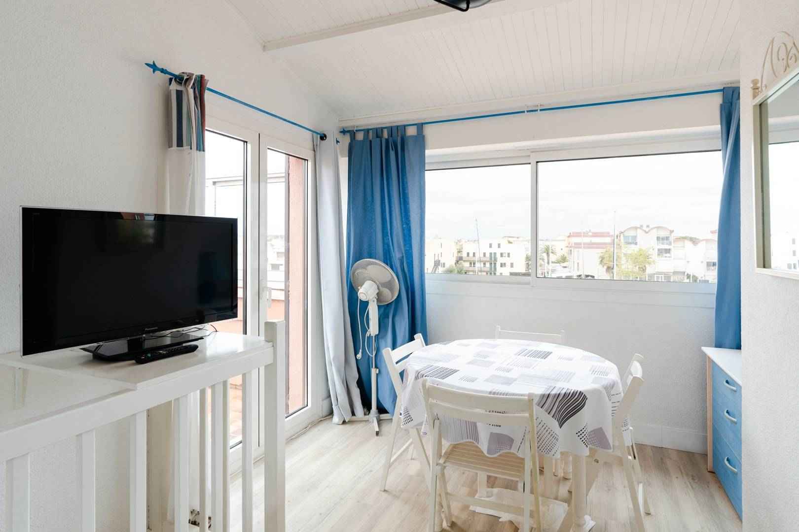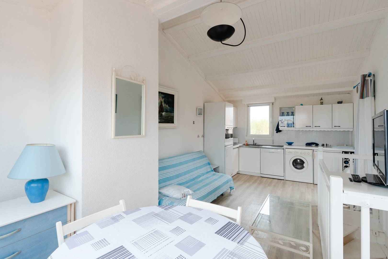 A l'étage, une grande pièce à vivre lumineuse avec un canapé-lit (140x190cm), TV (chaînes françaises), un coin-cuisine équipé (réfrigérateur, congélateur, plaque de cuisson, micro-ondes, lave vaisselle, cafetière, lave-linge) et une belle terrasse avec vue sur le port.