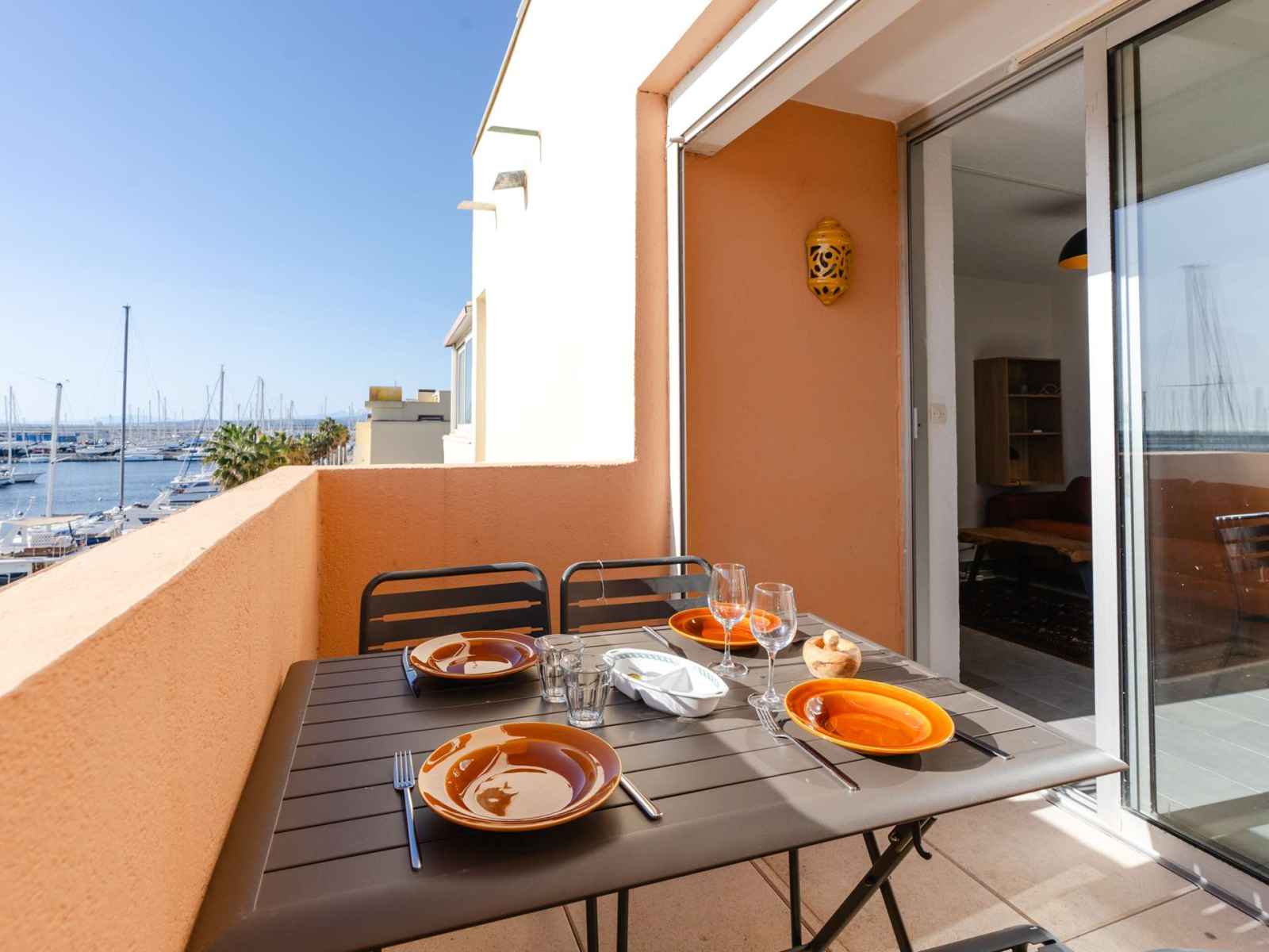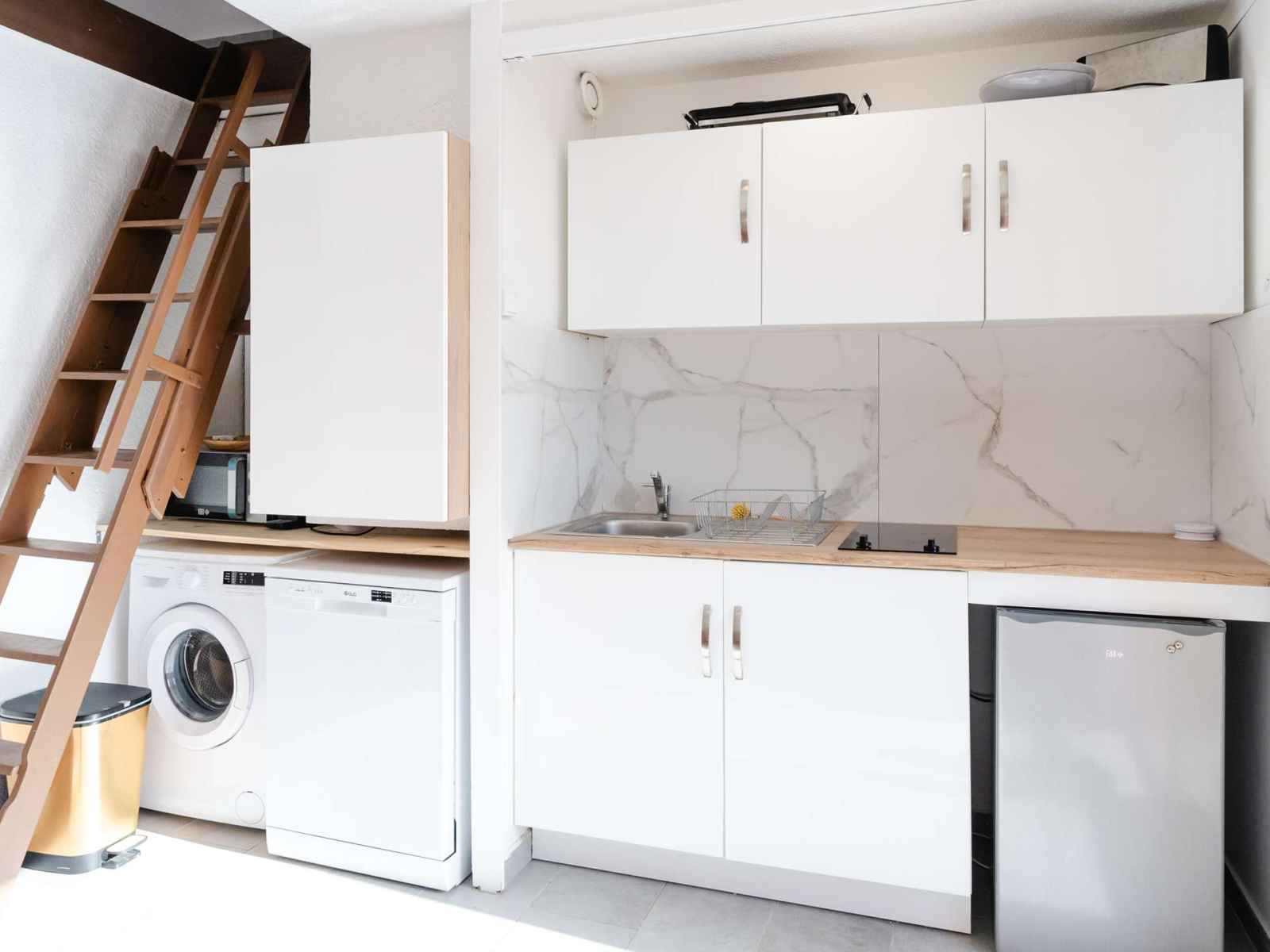 2 feux vitro-céramique, cafetière à dosettes Nespresso, micro-ondes, lave-linge, lave-vaisselle, réfrigérateur top avec freezer). Le salon dispose d'un canapé convertible et d'une TV (chaines françaises). Accès au balcon avec table pour 4 personnes, salle d’eau avec cabine de douche, petit lavabo et WC.