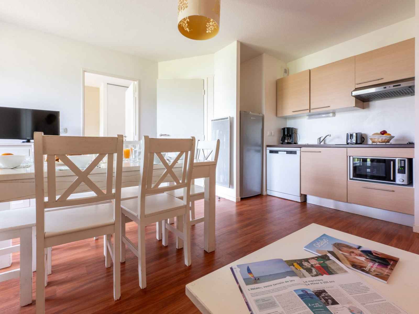 kitchenette équipée (plaque vitrocéramique 2 feux, micro-ondes/gril, lave-vaisselle, 10 couverts, cafetière électrique, bouilloire électrique, réfrigérateur)