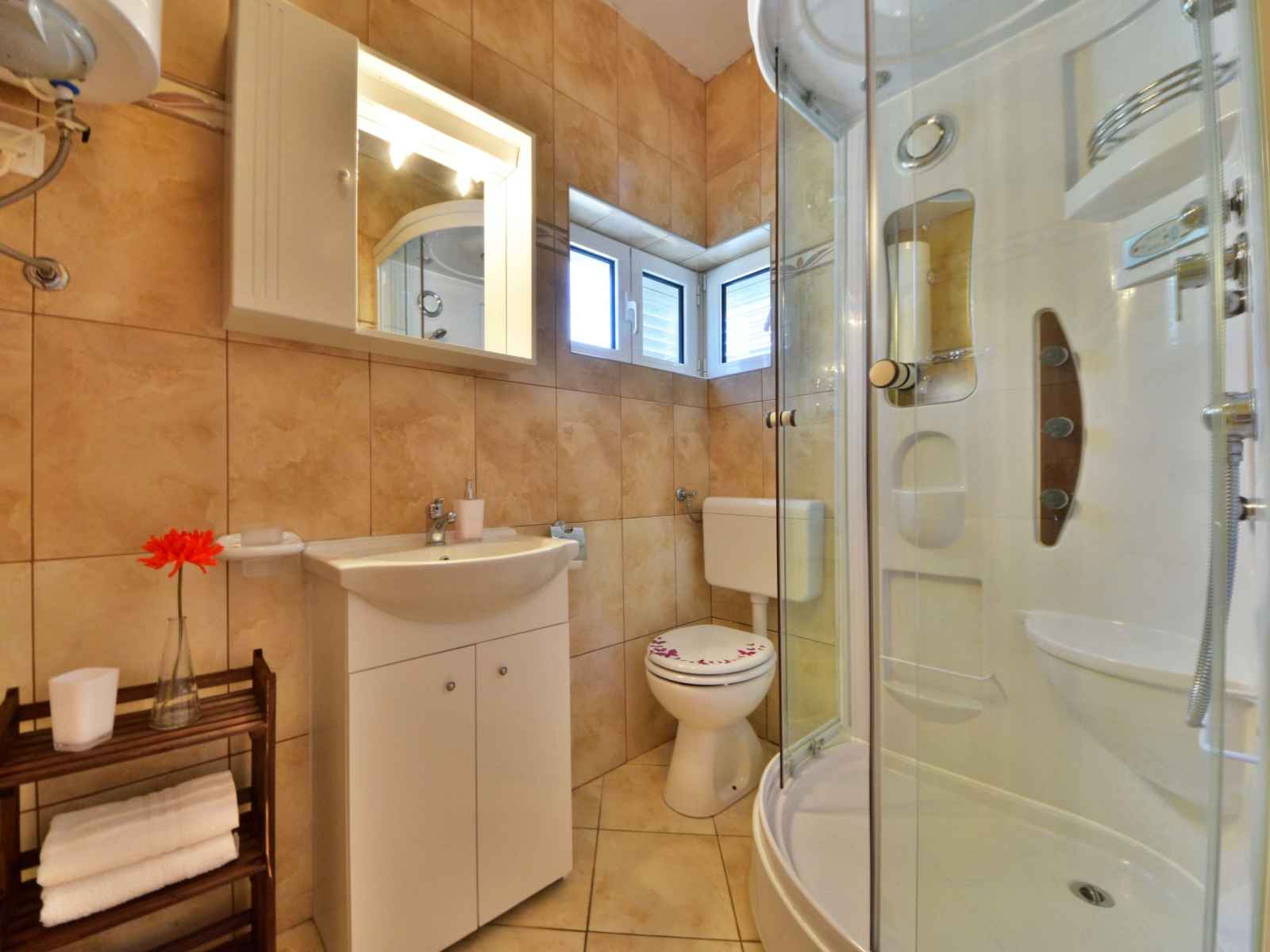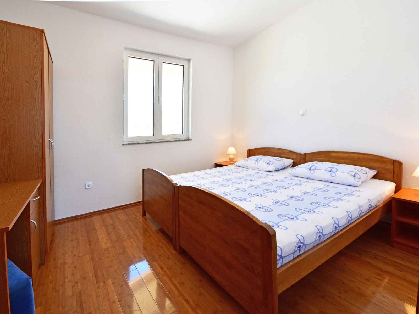 Apt 2 pièces 40 m2, rez-de-chaussée surélevé, situation sud-est. séjour/salle à manger 20 m2 avec 1 divan-lit double (140 cm, longueur 200 cm), tv (satellite) (écran plat), air-conditionné. sortie sur la terrasse. 1 chambre avec 2 lits (90 cm, longueur 200 cm). cuisine ouverte (4 plaques de cuisson, four). douche/wc, douche à jets. pas de