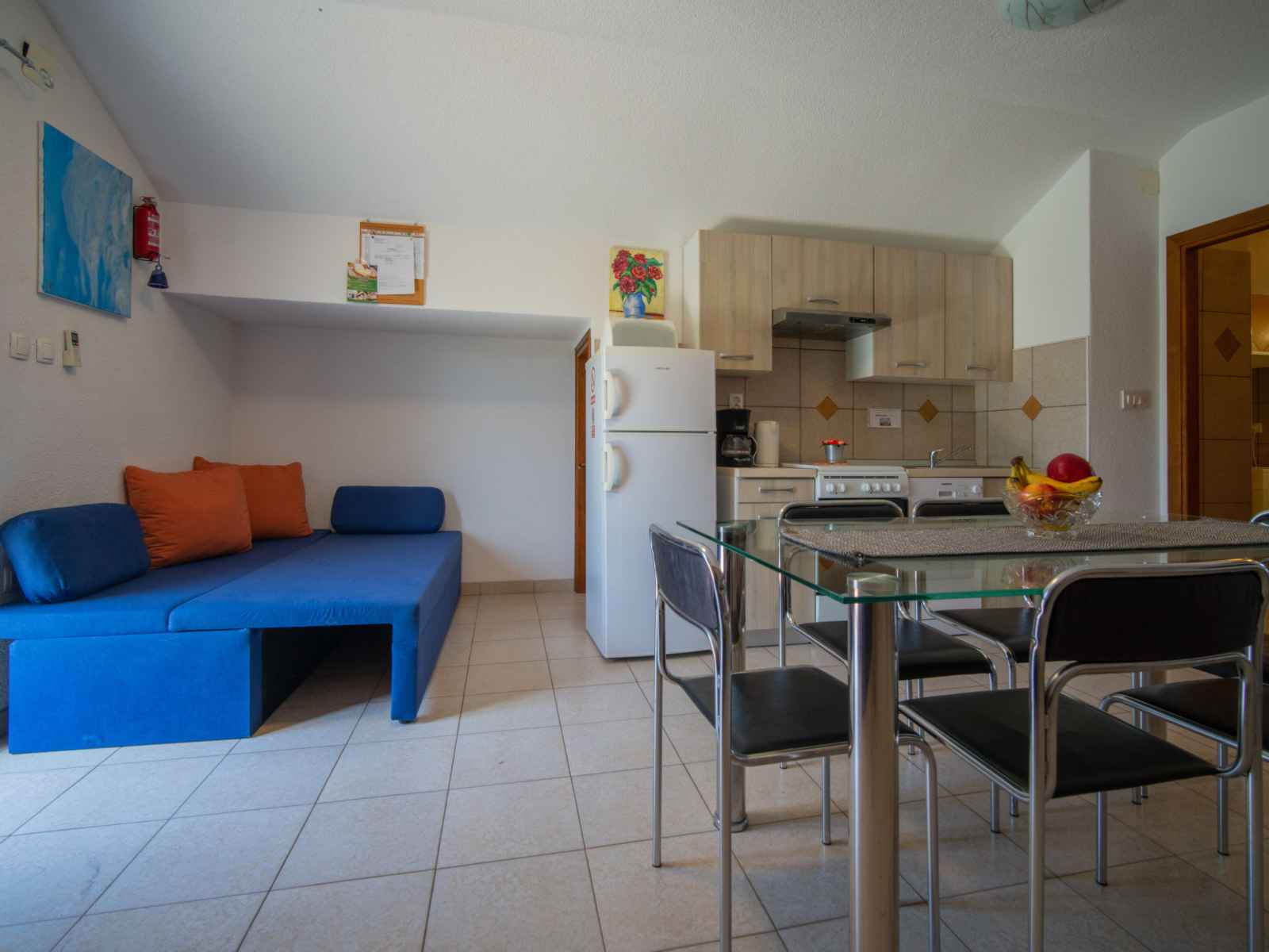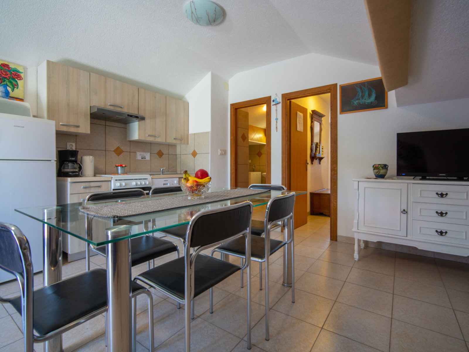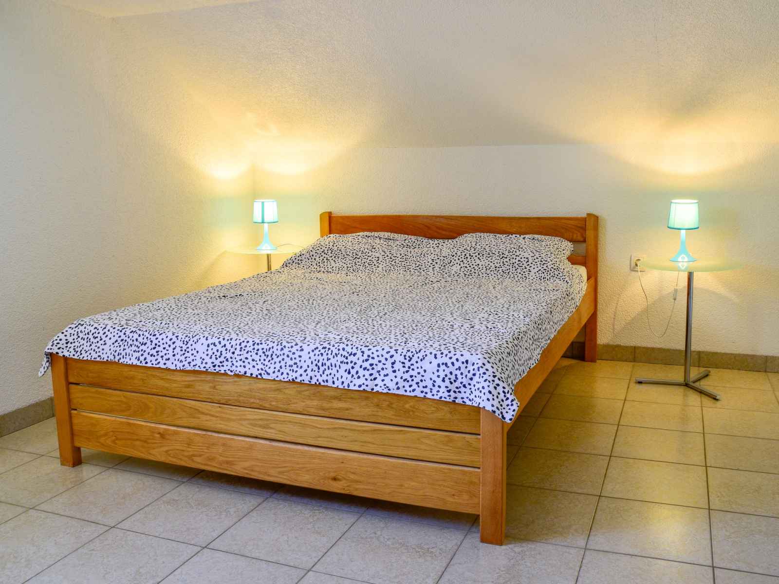 Apt 2 pièces 65 m2, sous le toit, situation sud. séjour/salle à manger mansardé hauteur plafond 105 - 255 cm avec tv (écran plat), air-conditionné. 1 chambre mansardée hauteur plafond 105 - 255 cm avec 2 grands-lits (160 cm, longueur 200 cm). cuisine ouverte (4 plaques de cuisson, four, lave-vaisselle, congélateur). douche/bidet/wc. pas de