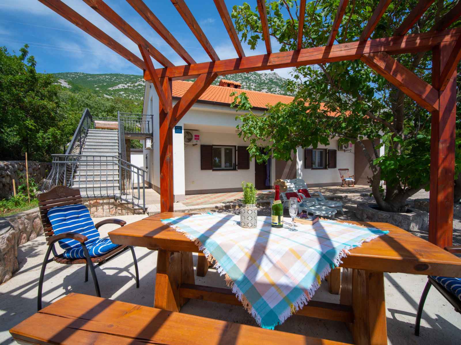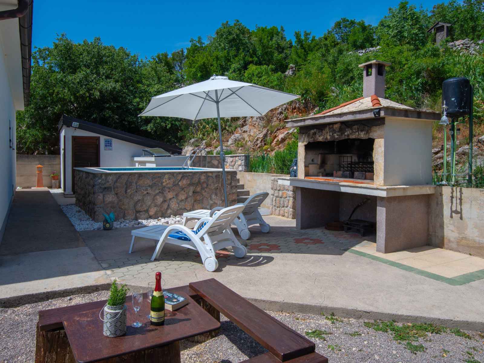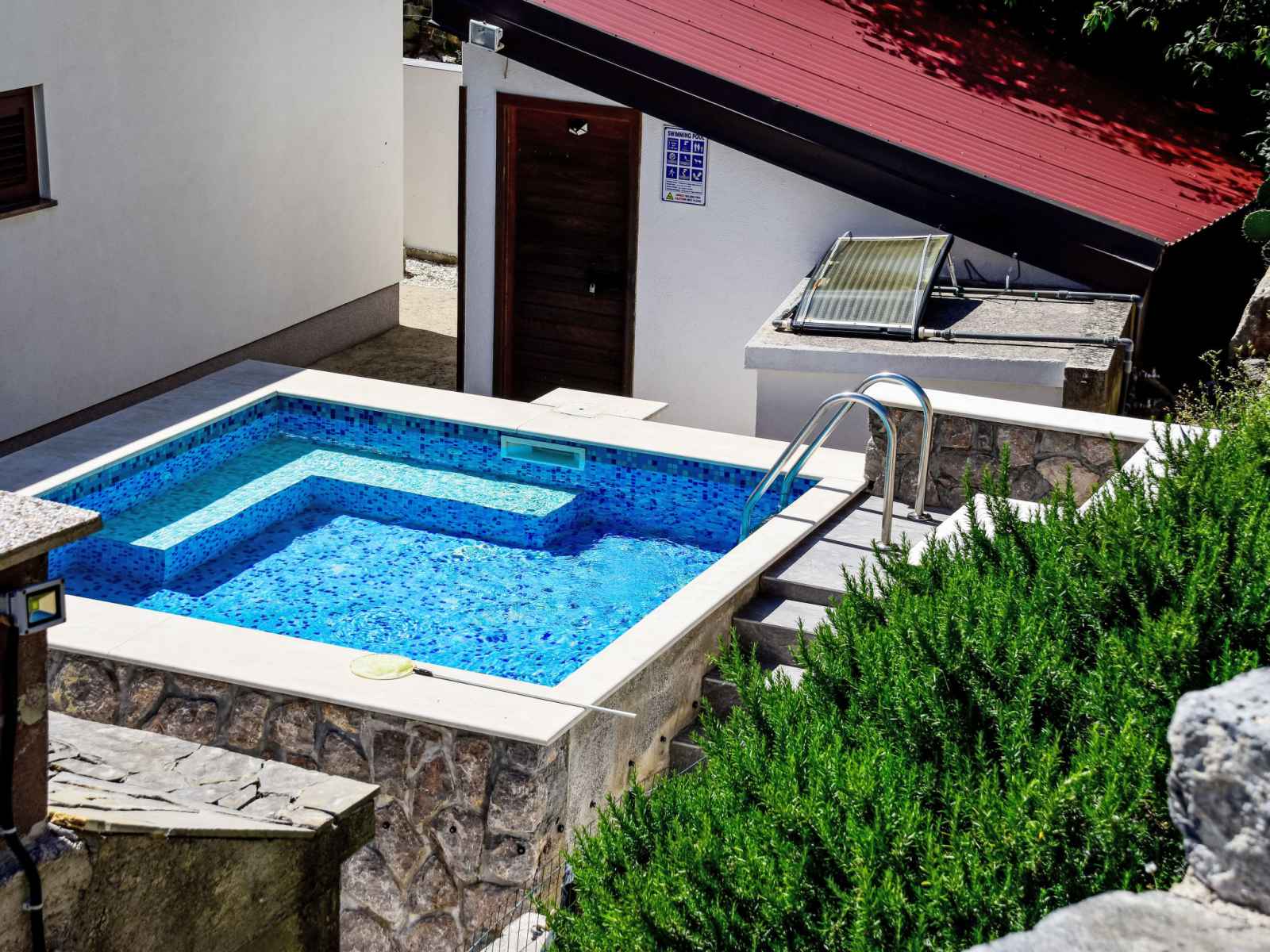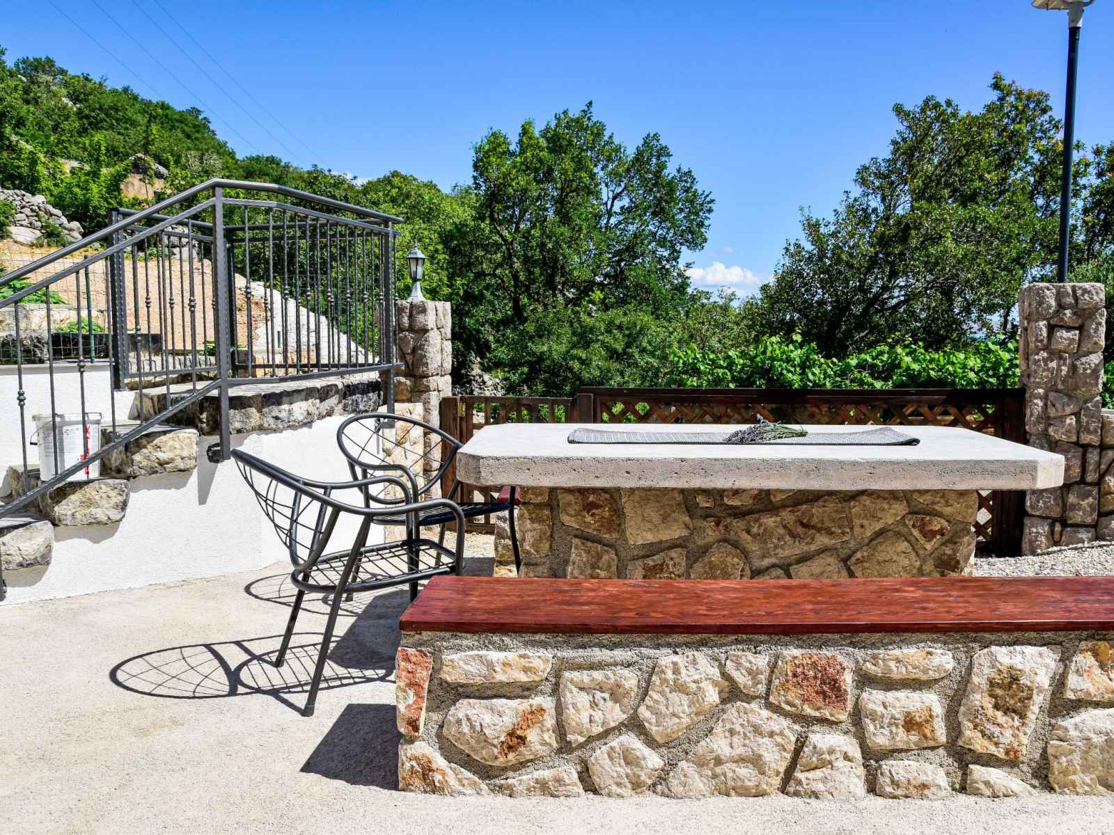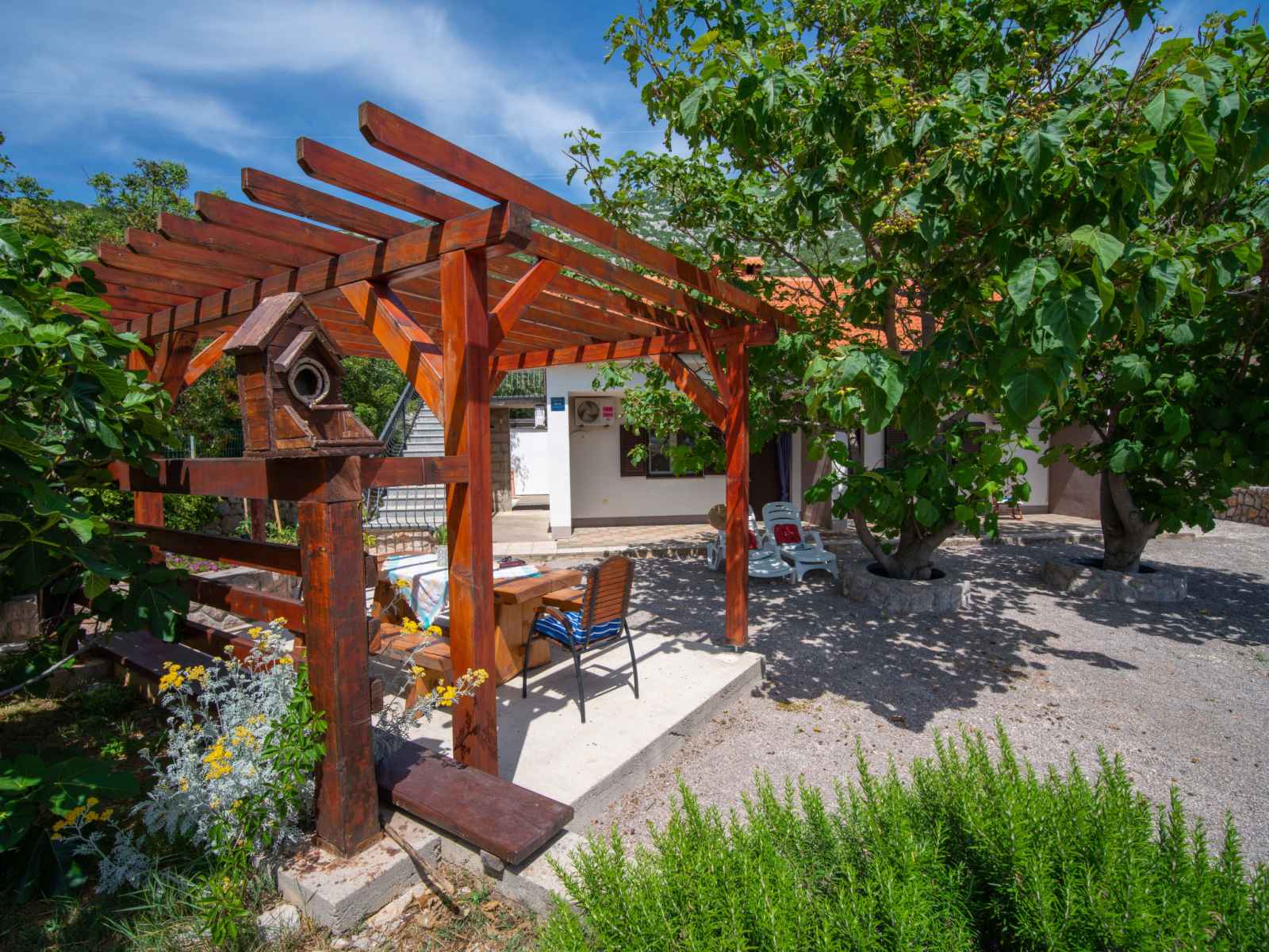 Cesarica à 5 km de karlobag: maison à 3 apts "sanja". situation isolée, ensoleillée, surélevée, à 800 m de la mer, à 800 m de la plage. en commun: terrain 500 m2 (clôturé), piscine (3 x 3 m, profondeur 90 cm, disponibilité saisonnière: 01.mai. - 16.sep.). douche extérieure, pergola (10 m2), meubles de jardin, barbecue. infrastructures