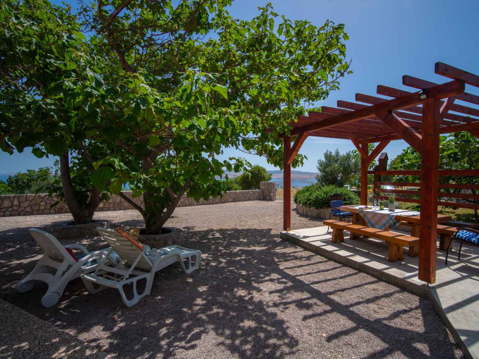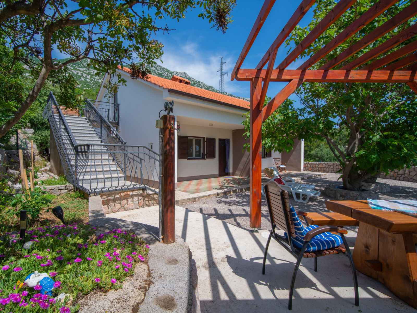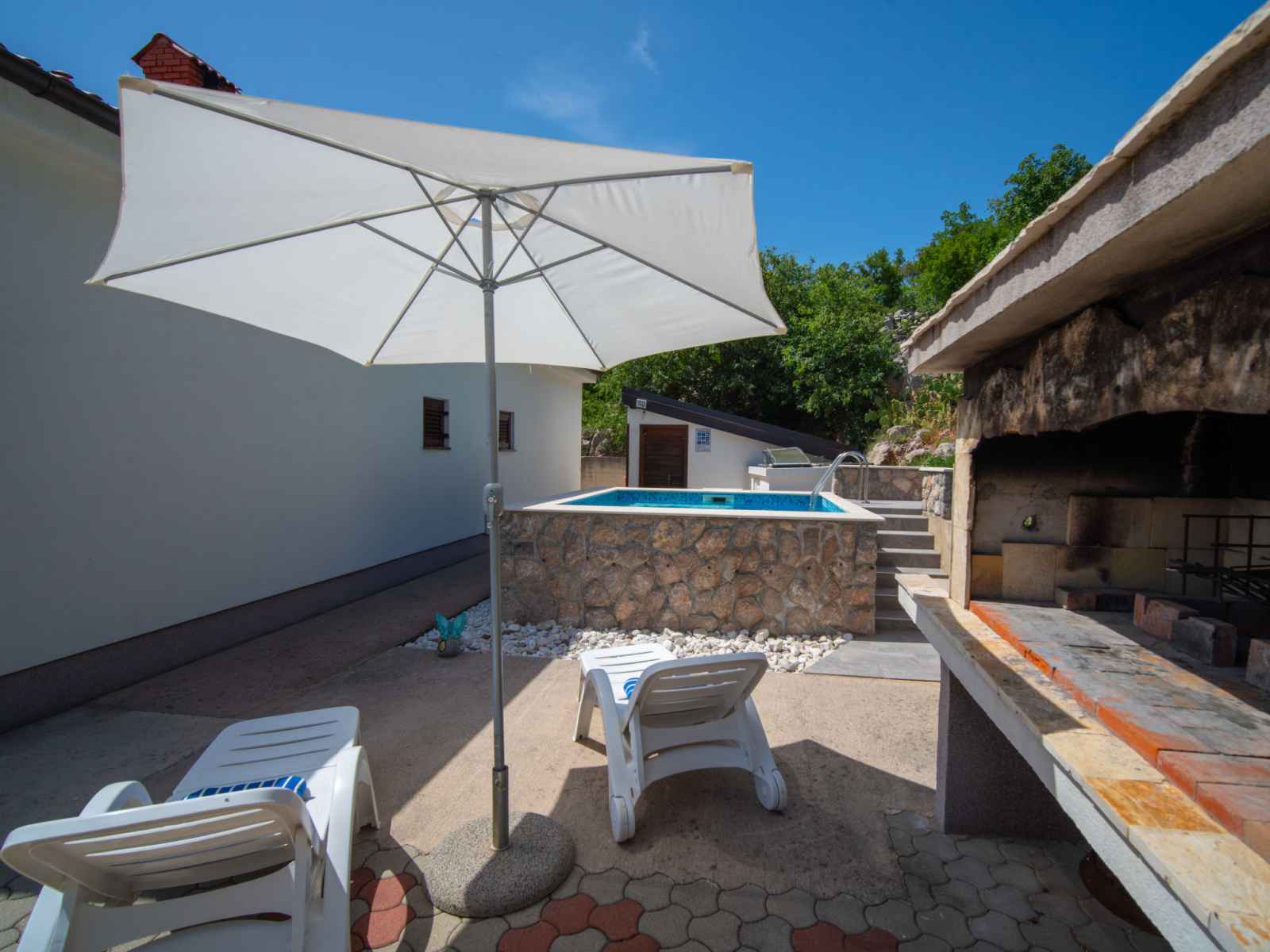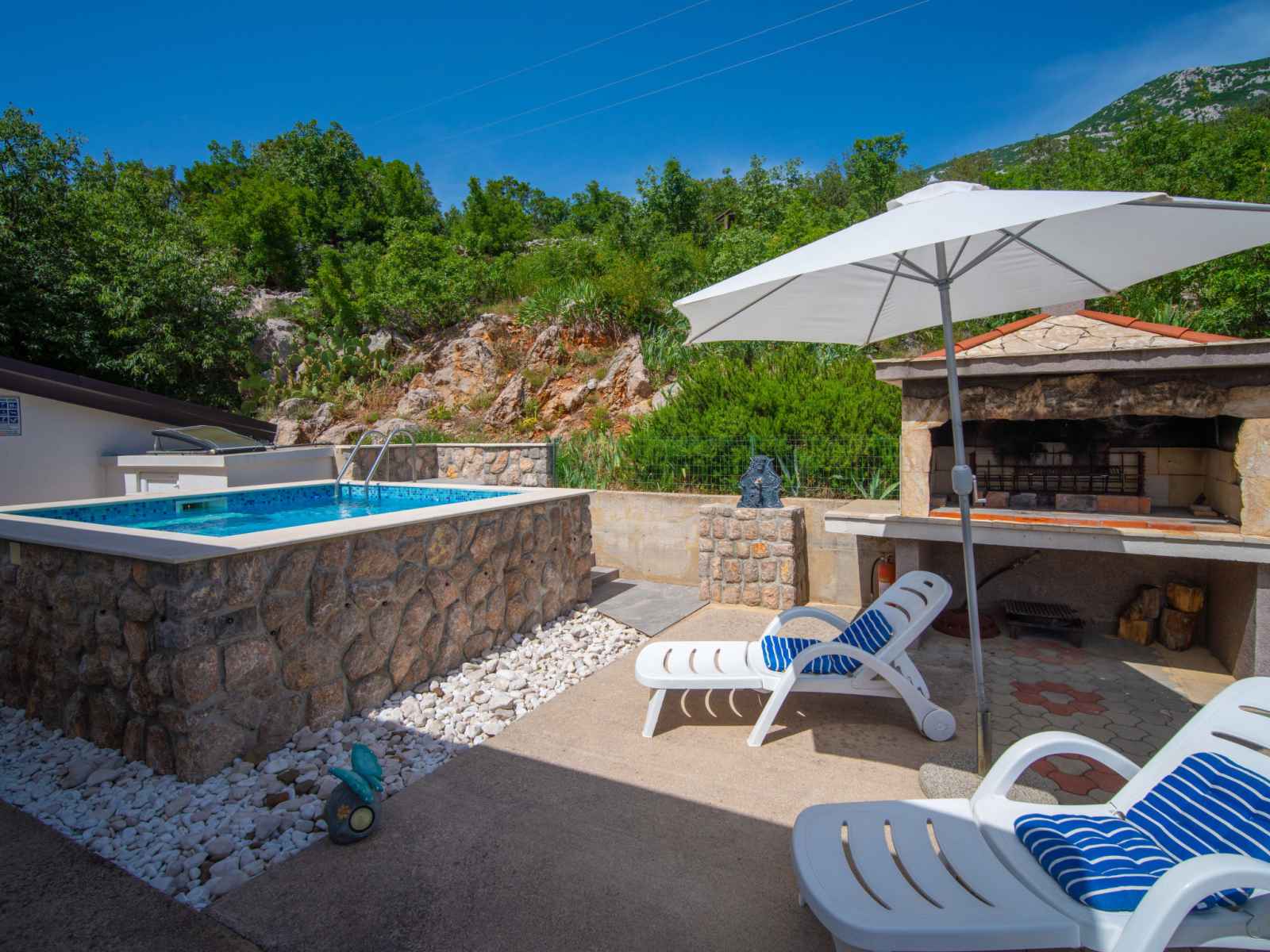 Cesarica à 5 km de karlobag: maison à 3 apts "sanja". situation isolée, ensoleillée, surélevée, à 800 m de la mer, à 800 m de la plage. en commun: terrain 500 m2 (clôturé), piscine (3 x 3 m, profondeur 90 cm, disponibilité saisonnière: 01.mai. - 16.sep.). douche extérieure, pergola (10 m2), meubles de jardin, barbecue. infrastructures