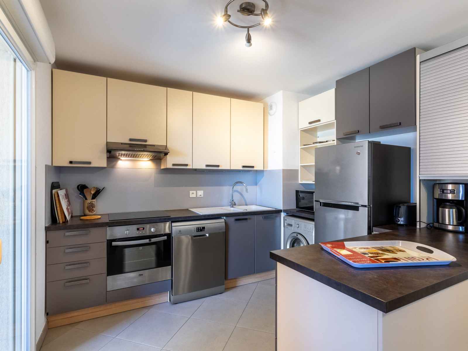 Apt 2 pièces 44 m2 au 4ème étage, situation ouest. aménagement confortable: séjour/salle à manger avec 1 divan-lit (140 cm, longueur 190 cm), 1 x 2 lits superposés (70 cm, longueur 190 cm), tv (écran plat), air-conditionné. 1 chambre avec 1 lit double (2 x 80 cm, longueur 200 cm), ventilateur. cuisine ouverte (four, lave-vaisselle, 4