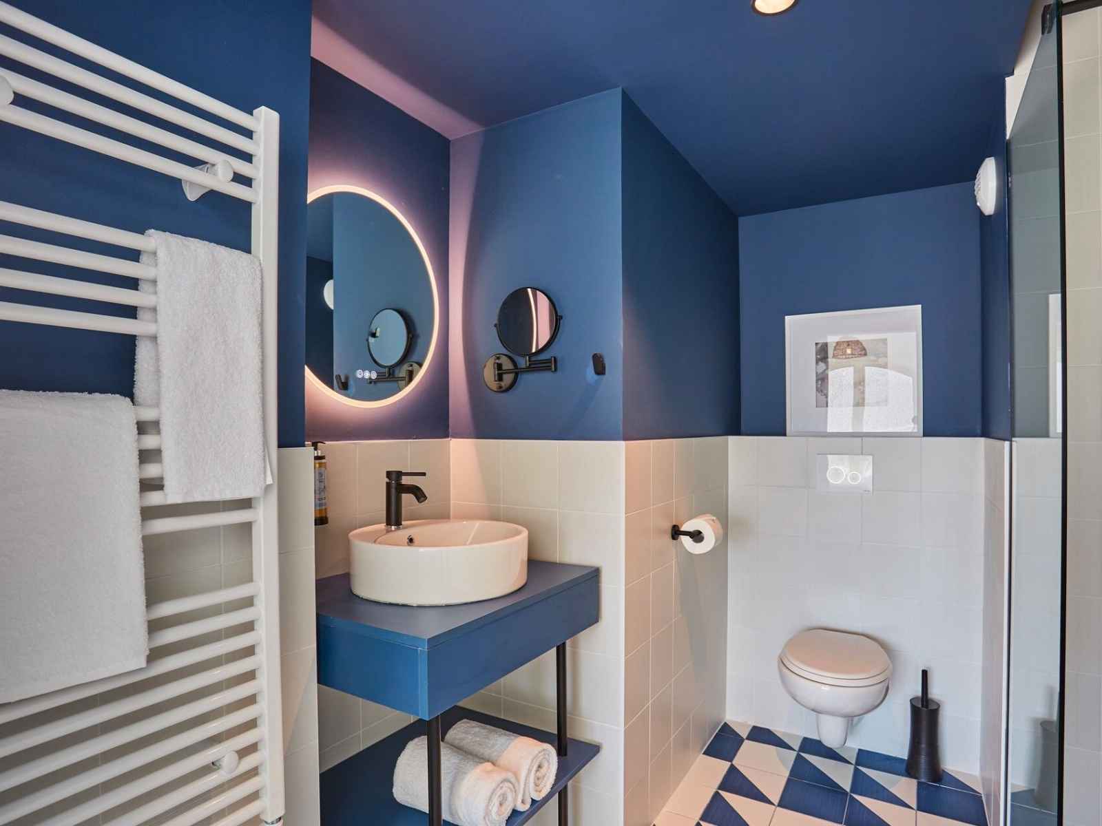 salle de bain avec cabine de douche, sèche-cheveux, sèche-serviettes