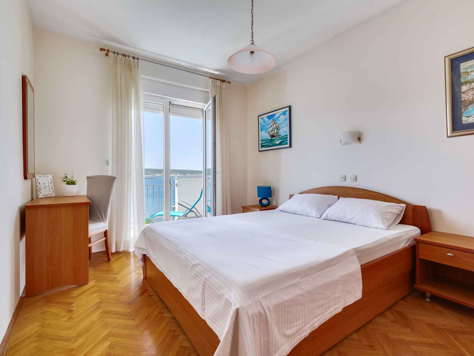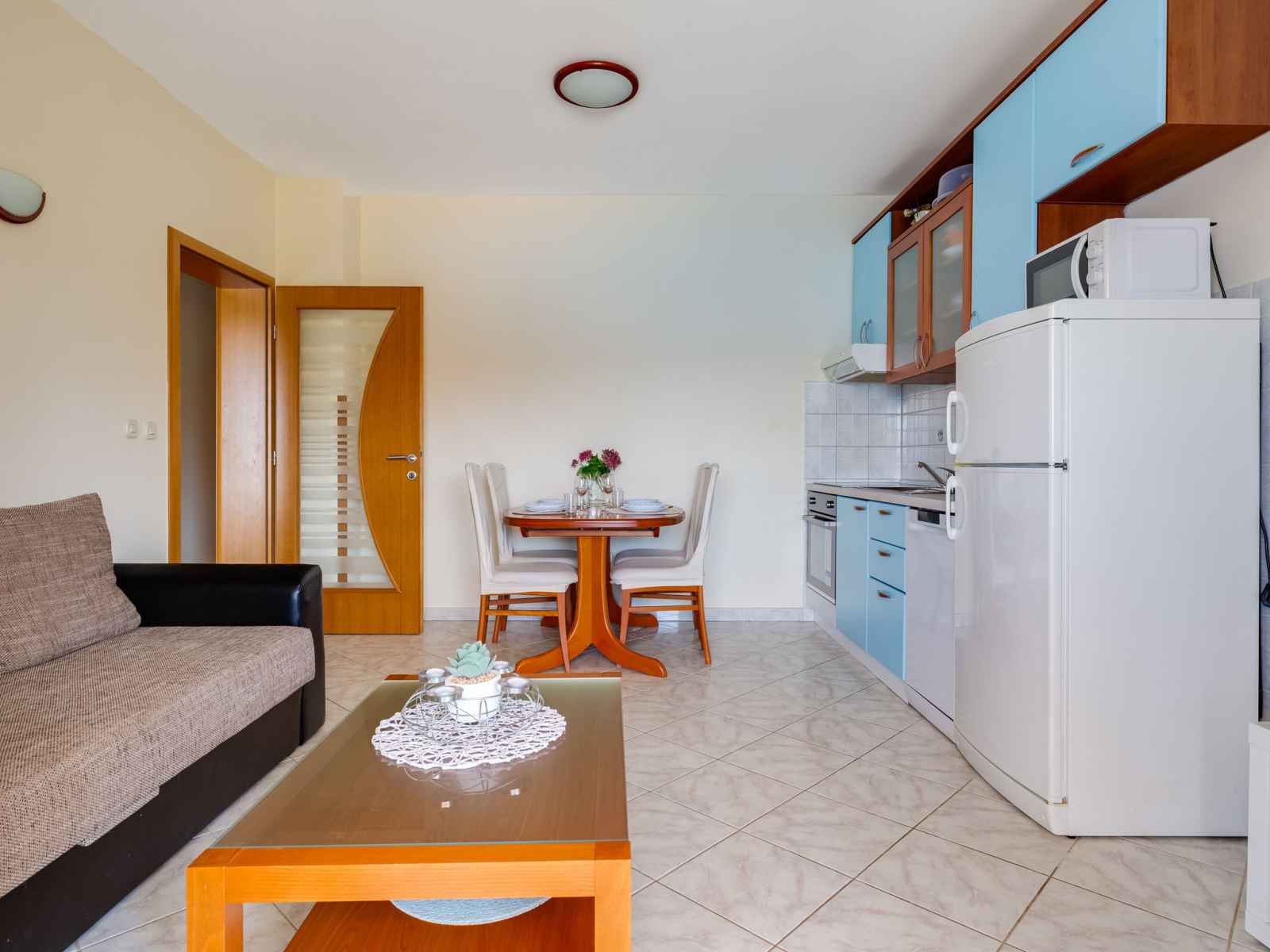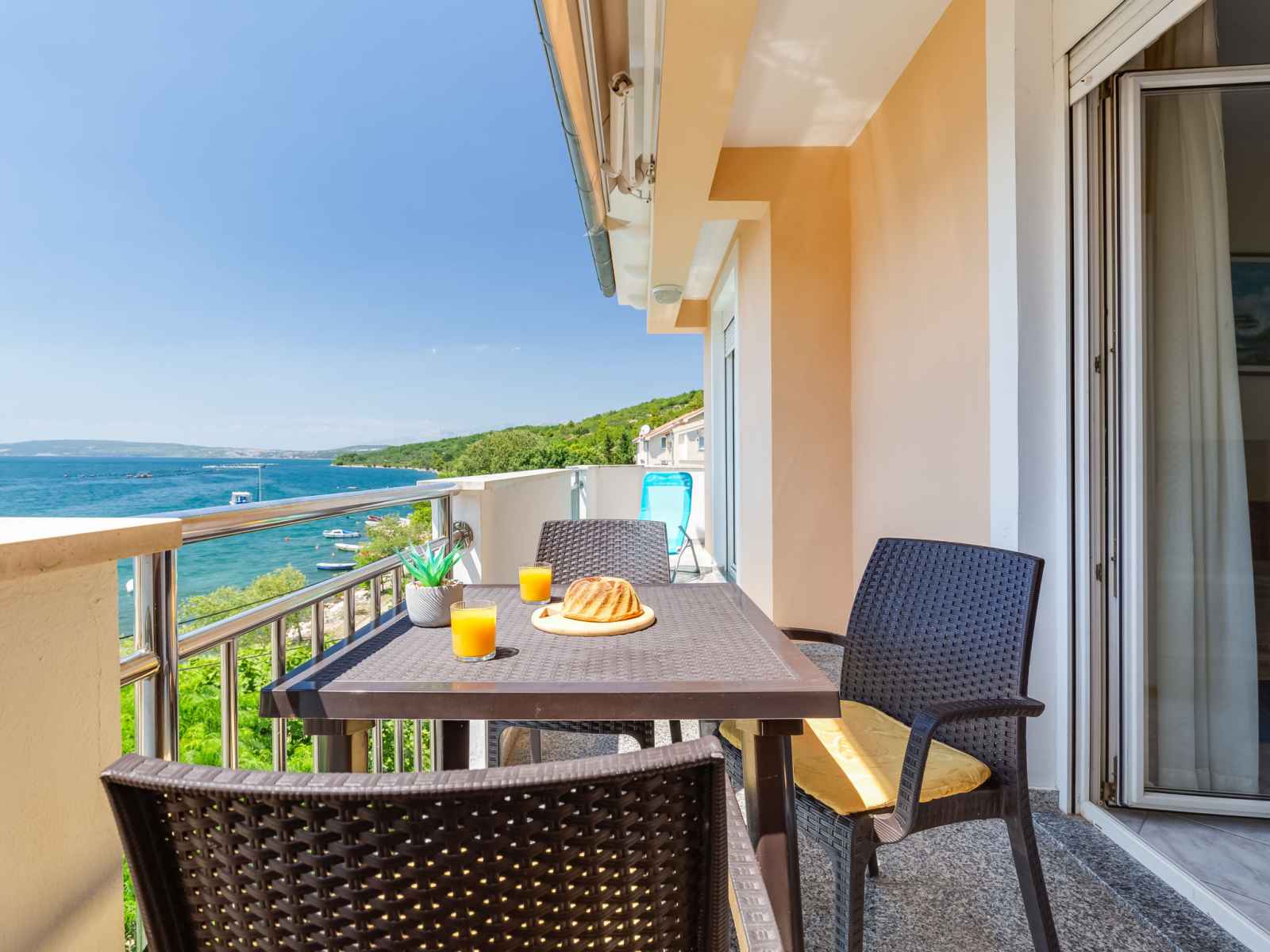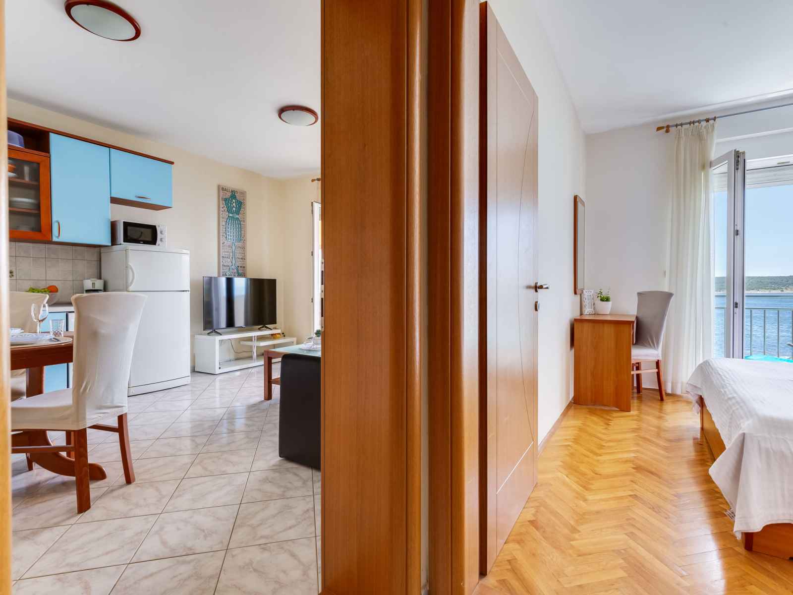 "daria 2", apt 2 pièces 45 m2 au 2ème étage. séjour/salle à manger 18 m2 avec 1 divan-lit, tv (satellite) et air-conditionné. sortie sur le balcon. 1 chambre avec 1 lit double. sortie sur le balcon. cuisine ouverte (4 plaques de cuisson, four, lave-vaisselle, congélateur). douche/bidet/wc. pas de chauffage. balcon. mobilier de balcon.