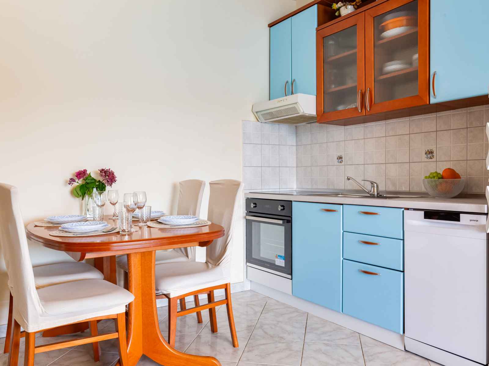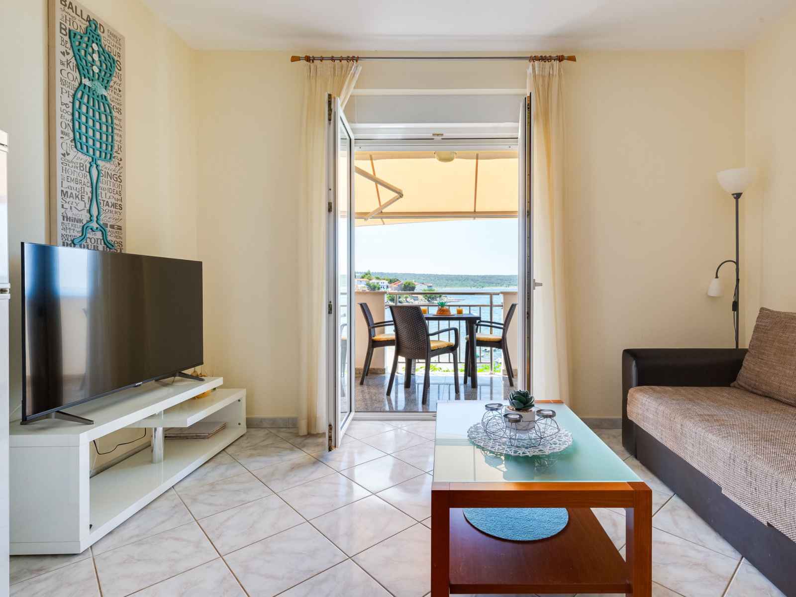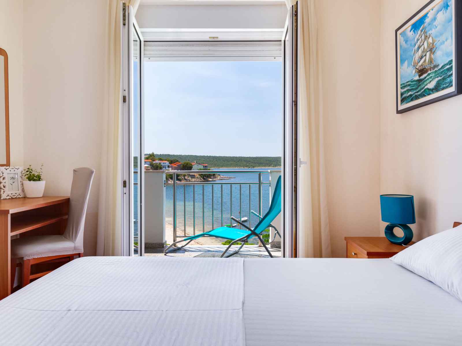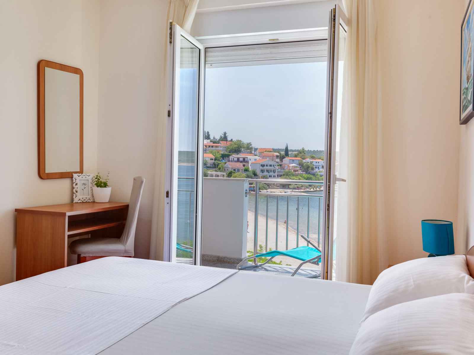 "daria 2", apt 2 pièces 45 m2 au 2ème étage. séjour/salle à manger 18 m2 avec 1 divan-lit, tv (satellite) et air-conditionné. sortie sur le balcon. 1 chambre avec 1 lit double. sortie sur le balcon. cuisine ouverte (4 plaques de cuisson, four, lave-vaisselle, congélateur). douche/bidet/wc. pas de chauffage. balcon. mobilier de balcon.