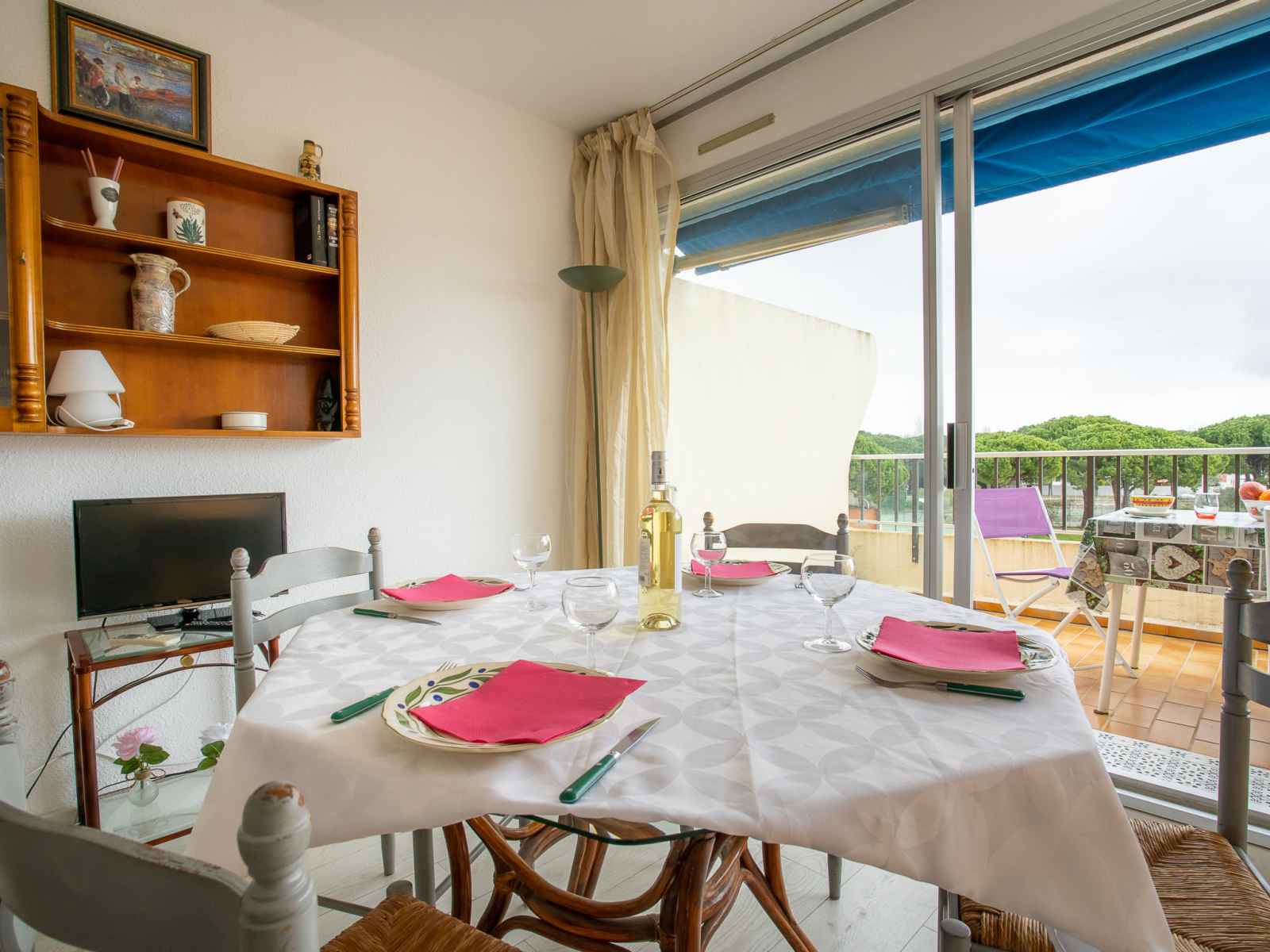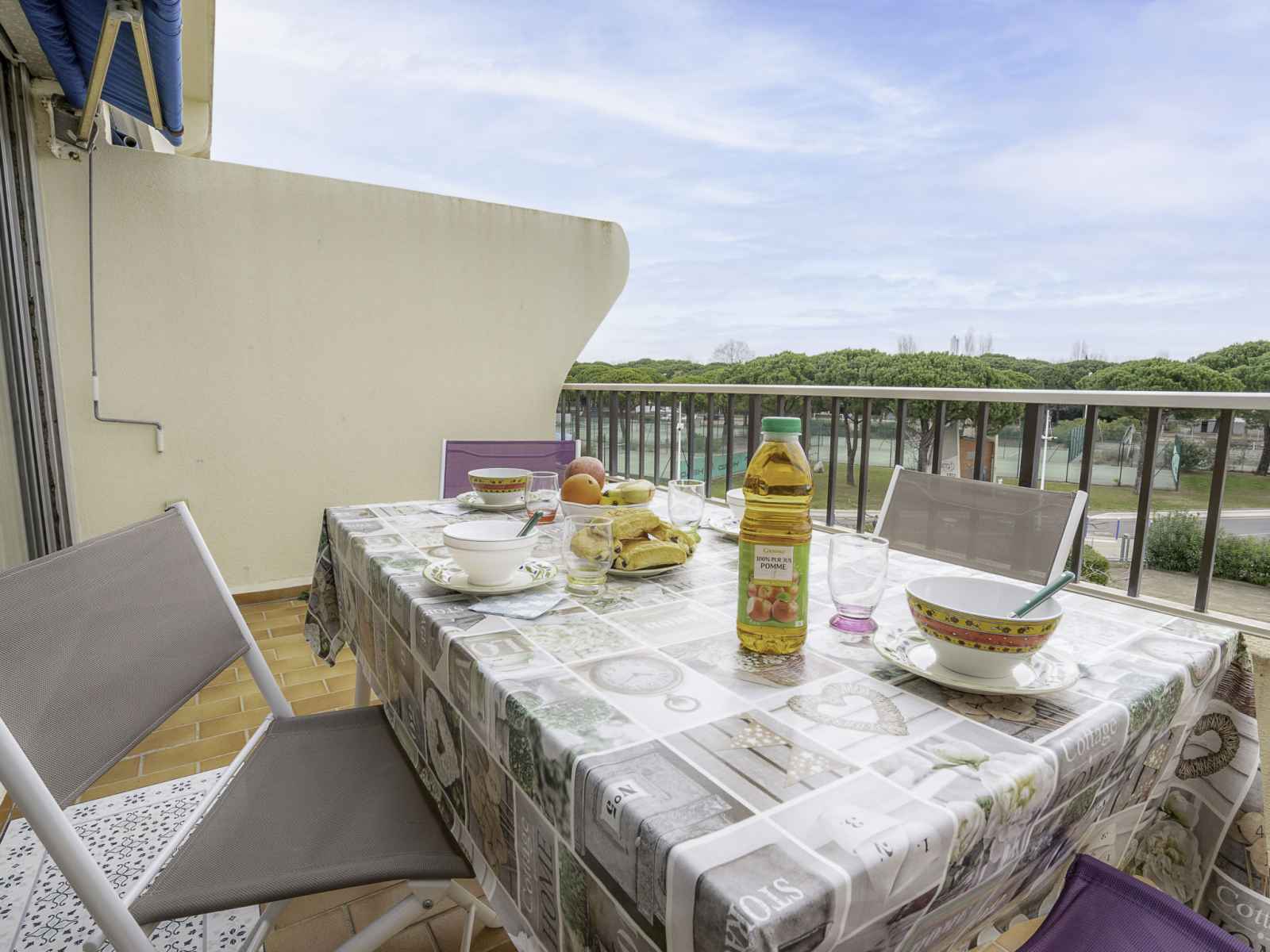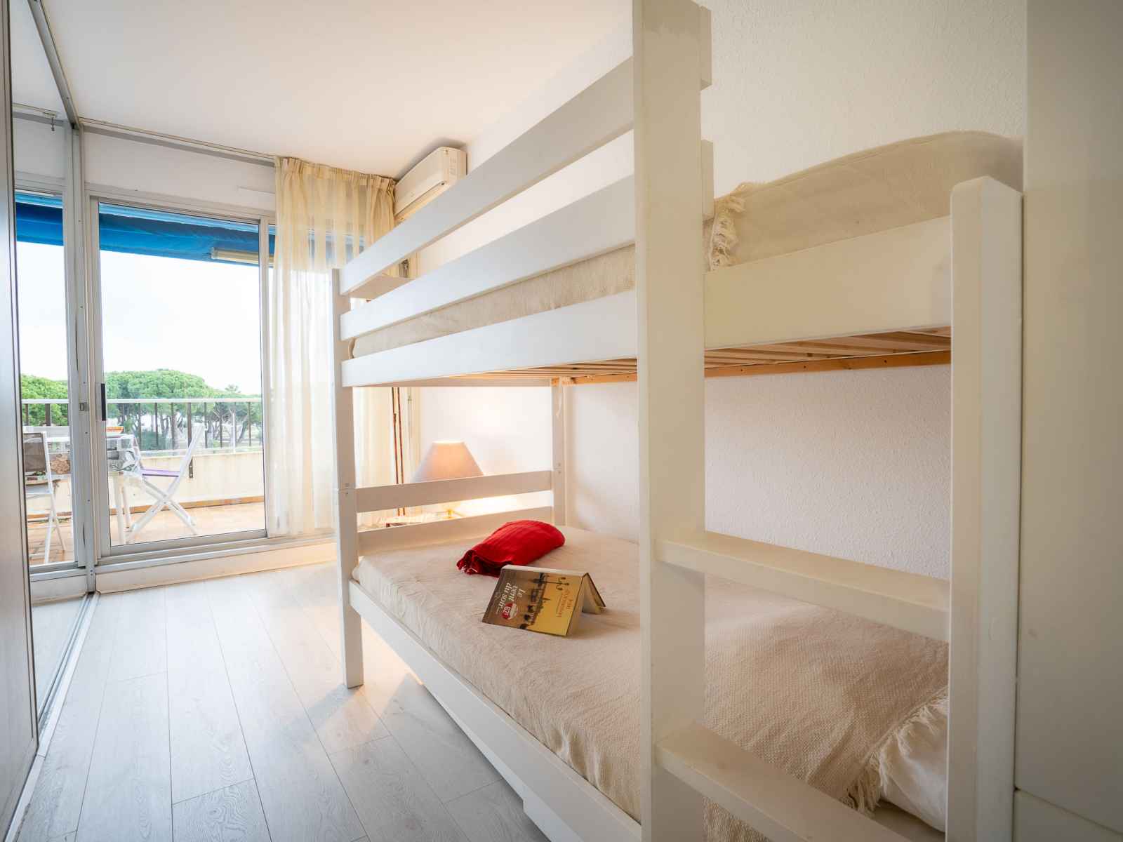 Apt 2 pièces 27 m2 au 2ème étage. séjour/salle à manger avec 1 grand-lit (140 cm, longueur 190 cm), tv et air-conditionné. 1 chambre avec porte coulissante avec 1 x 2 lits superposés (90 cm, longueur 180 cm). petite cuisine ouverte (3 plaques de cuisson, four, micro-ondes). salle de bains, wc séparé. terrasse 10 m2, situation est. meubles