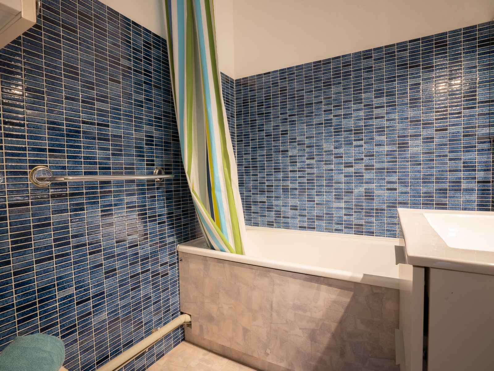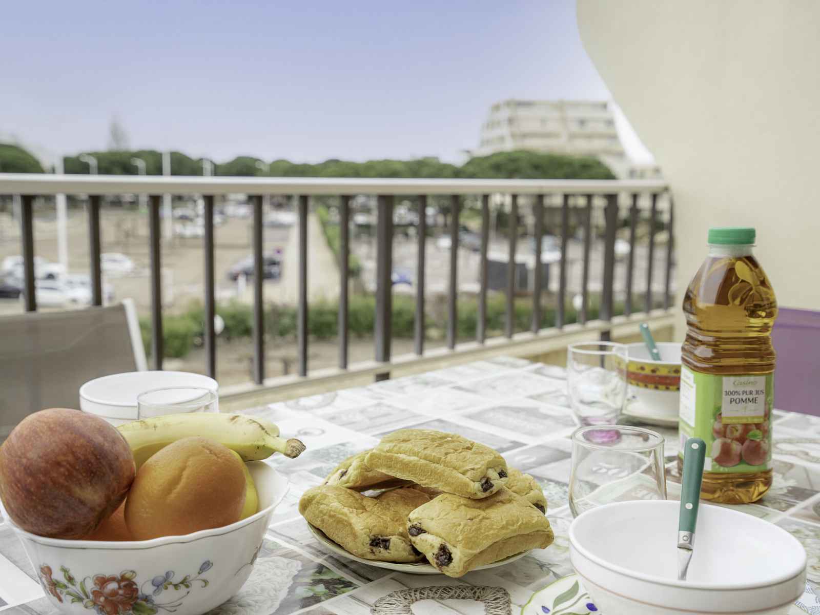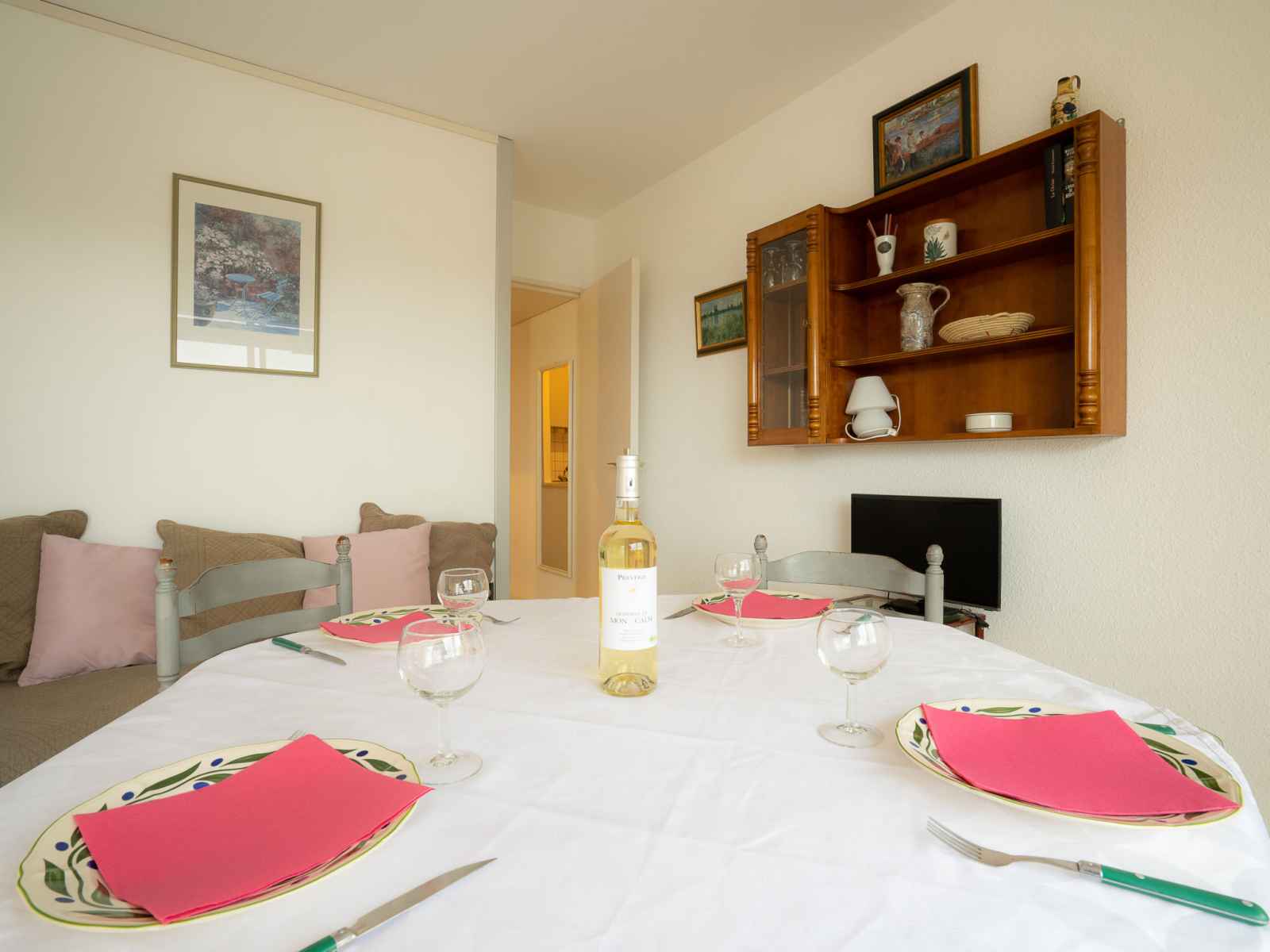 Apt 2 pièces 27 m2 au 2ème étage. séjour/salle à manger avec 1 grand-lit (140 cm, longueur 190 cm), tv et air-conditionné. 1 chambre avec porte coulissante avec 1 x 2 lits superposés (90 cm, longueur 180 cm). petite cuisine ouverte (3 plaques de cuisson, four, micro-ondes). salle de bains, wc séparé. terrasse 10 m2, situation est. meubles