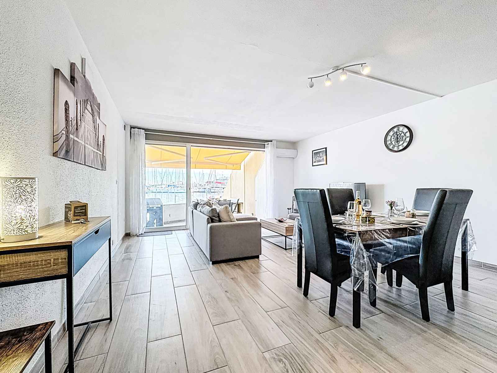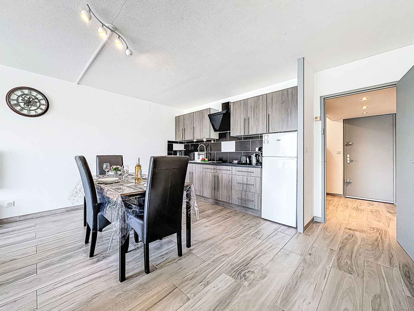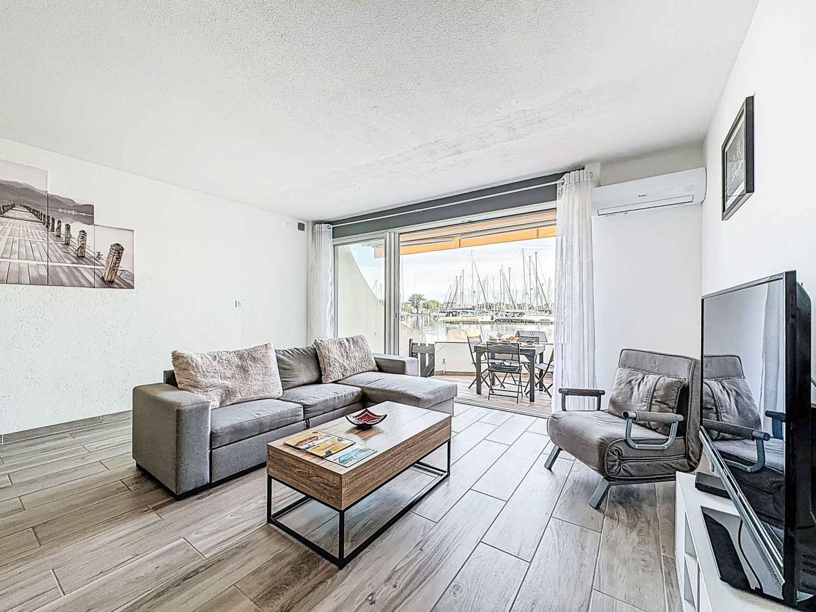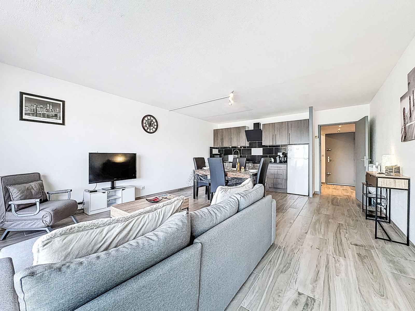 "les marines de l'airan", apt 2 pièces 52 m2, au rez-de-chaussée. aménagement moderne: séjour/salle à manger avec 1 divan-lit double (140 cm, longueur 190 cm), tv (écran plat). 1 chambre avec 1 grand-lit (140 cm, longueur 190 cm). cuisine ouverte (lave-vaisselle, 2 plaques à induction, grille-pain, micro-ondes, congélateur, cafetière
