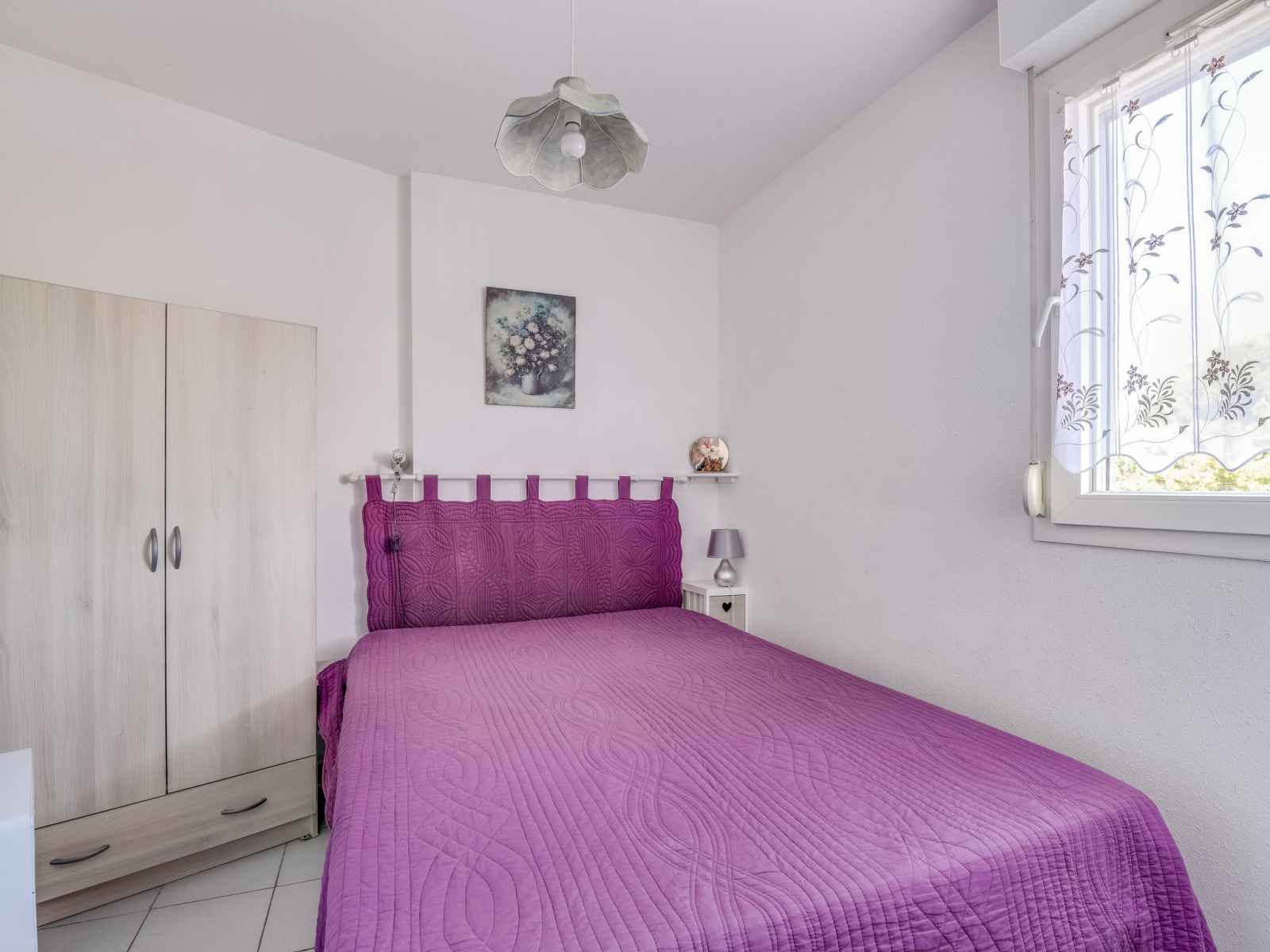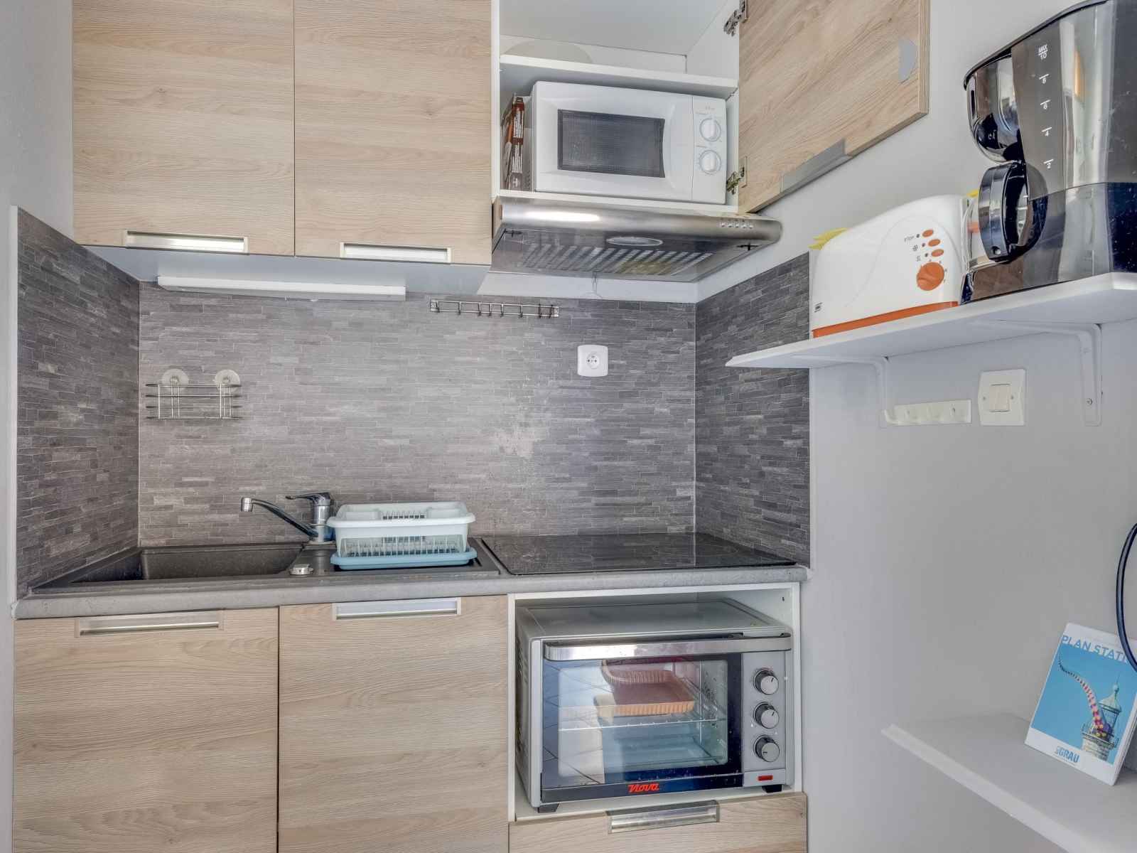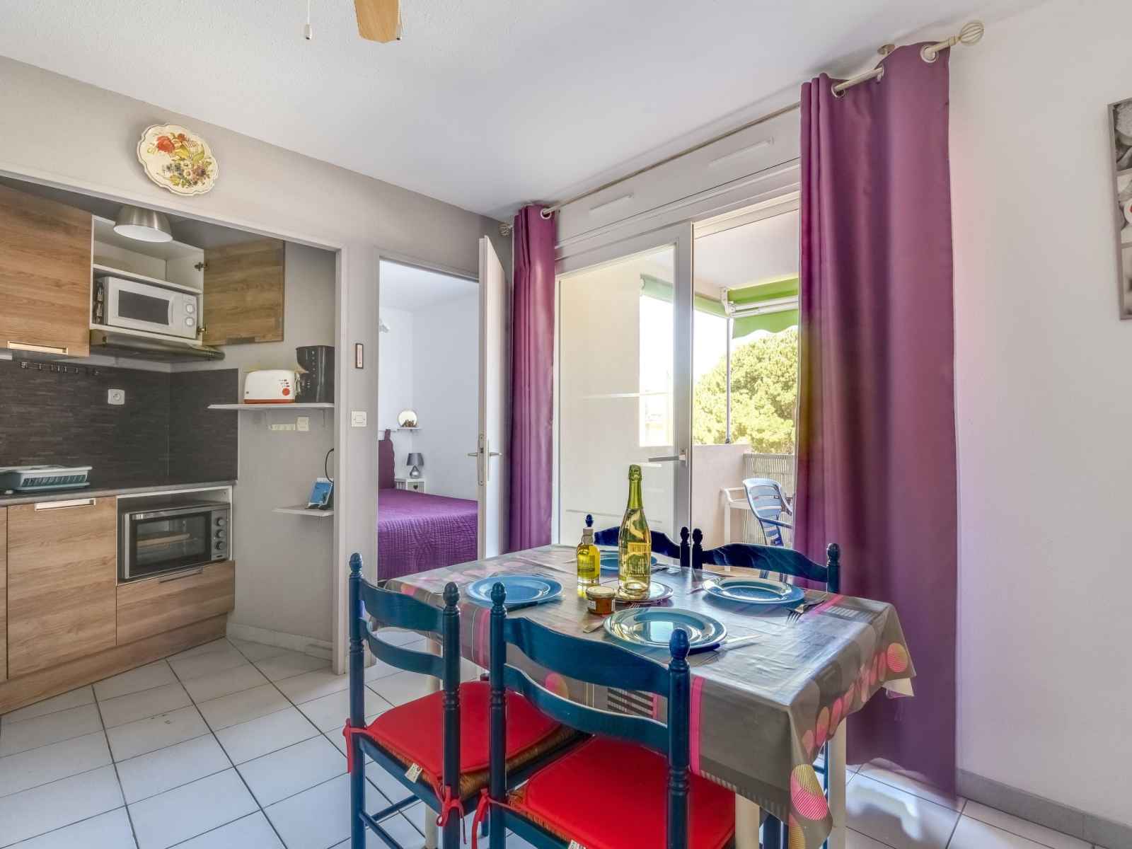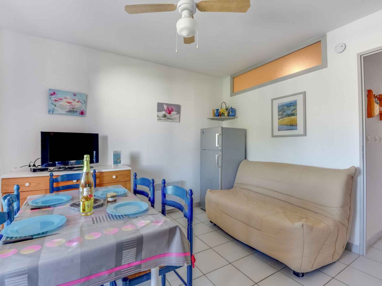Apt 2 pièces 27 m2 au 1er étage. séjour/salle à manger avec tv (écran plat). sortie sur la terrasse. 1 chambre avec 1 grand-lit (1 x 140 cm, longueur 190 cm). cabine avec 1 x 2 lits superposés (90 cm, longueur 190 cm). coin cuisine (4 plaques de cuisson, four, micro-ondes, congélateur, cafetière électrique). douche, wc séparé. chauffage
