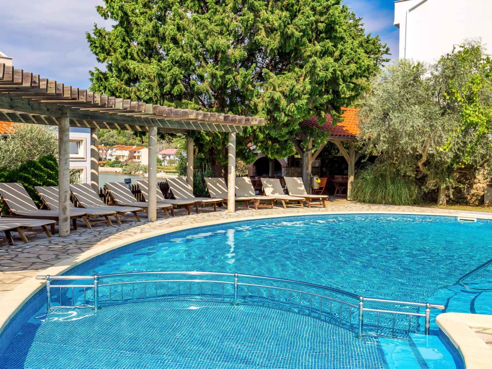 Kampor à 6 km de rab: petite résidence accueillante pour les enfants. situation tranquille, ensoleillée, à 40 m de la mer, à 40 m de la plage. en commun: terrain (clôturé), jardin entretenu avec pelouse, piscine en forme d’haricot chauffée (12 x 6 m, profondeur 120 - 160 cm, disponibilité saisonnière: 13.mai. - 30.sep.) avec marches