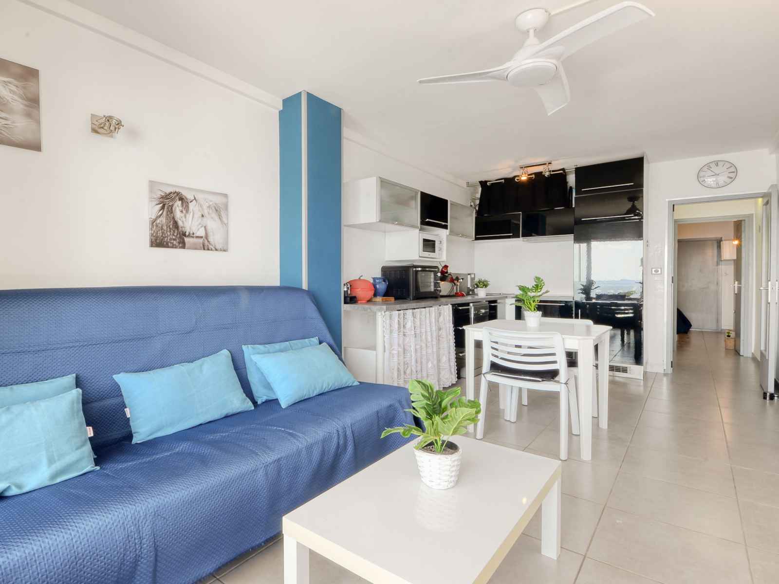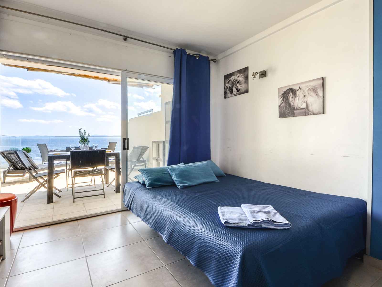 Apt 2 pièces 33 m2, situation sud-ouest. clair, aménagement fonctionnel et confortable: séjour/salle à manger avec 1 divan-lit (135 cm, longueur 90 cm), table pour les repas, tv (satellite), télévision numérique et ventilateur. sortie sur la terrasse, orientée sud et orientée ouest. 1 chambre ouverte avec 1 grand-lit (140 cm, longueur 200