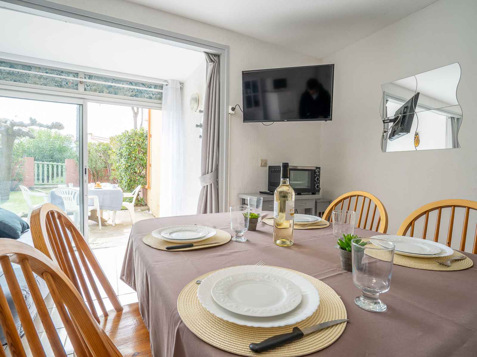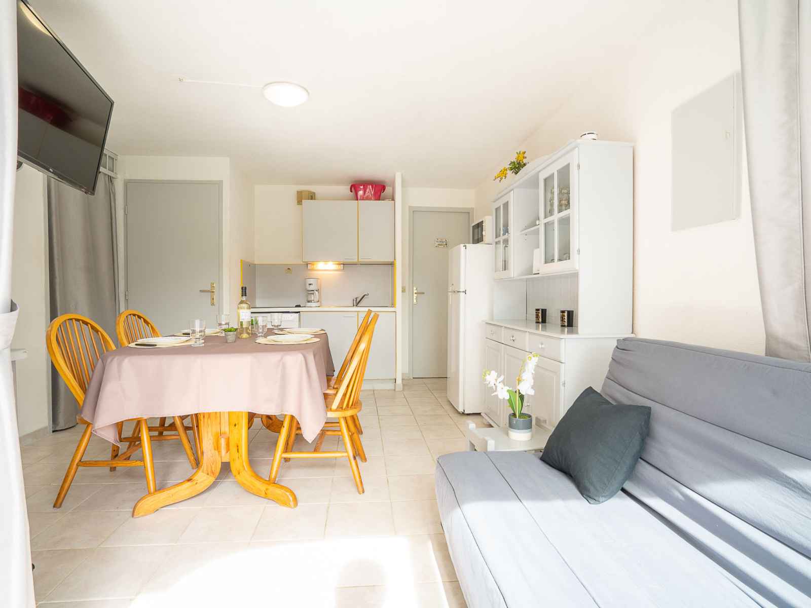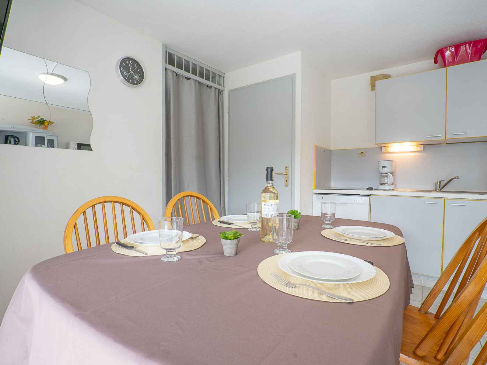 Apt 2 pièces 28 m2, au rez-de-chaussée. séjour/salle à manger avec tv (écran plat). sortie sur la terrasse. cabine avec 1 x 2 lits superposés (80 cm, longueur 190 cm). 1 chambre avec 1 grand-lit (140 cm, longueur 190 cm). coin cuisine (4 plaques de cuisson, four, lave-vaisselle, micro-ondes, congélateur, cafetière électrique). douche/wc.