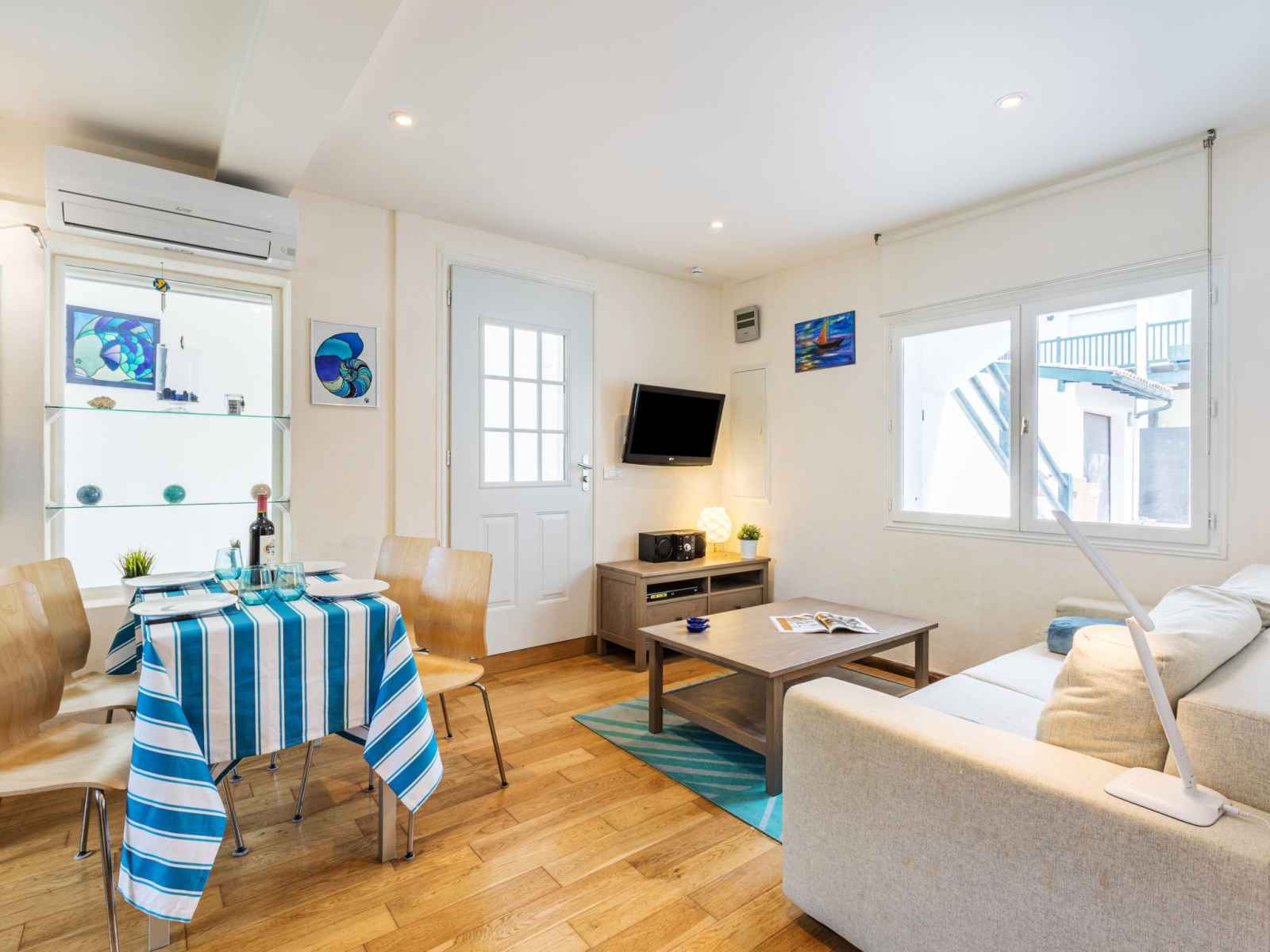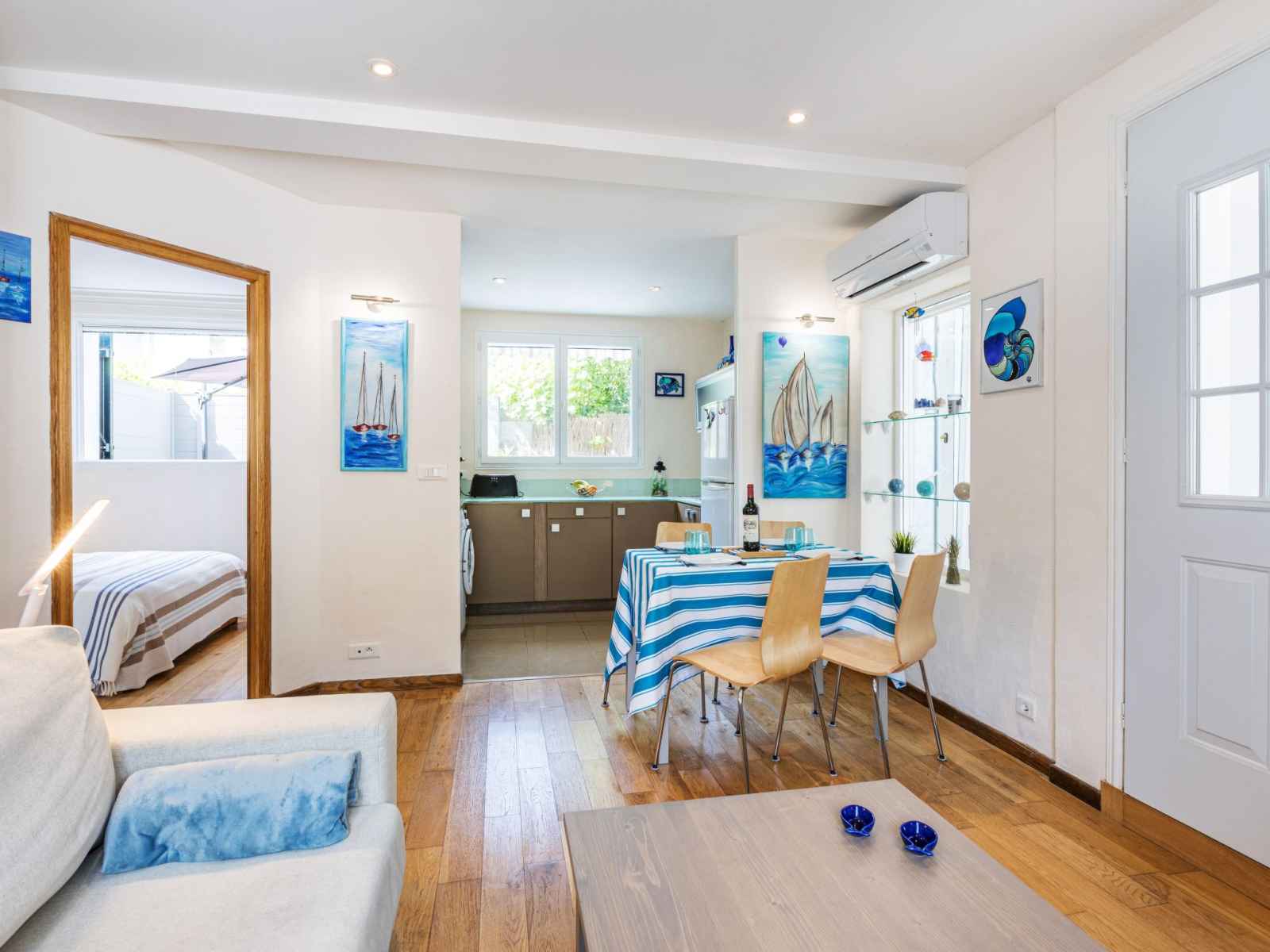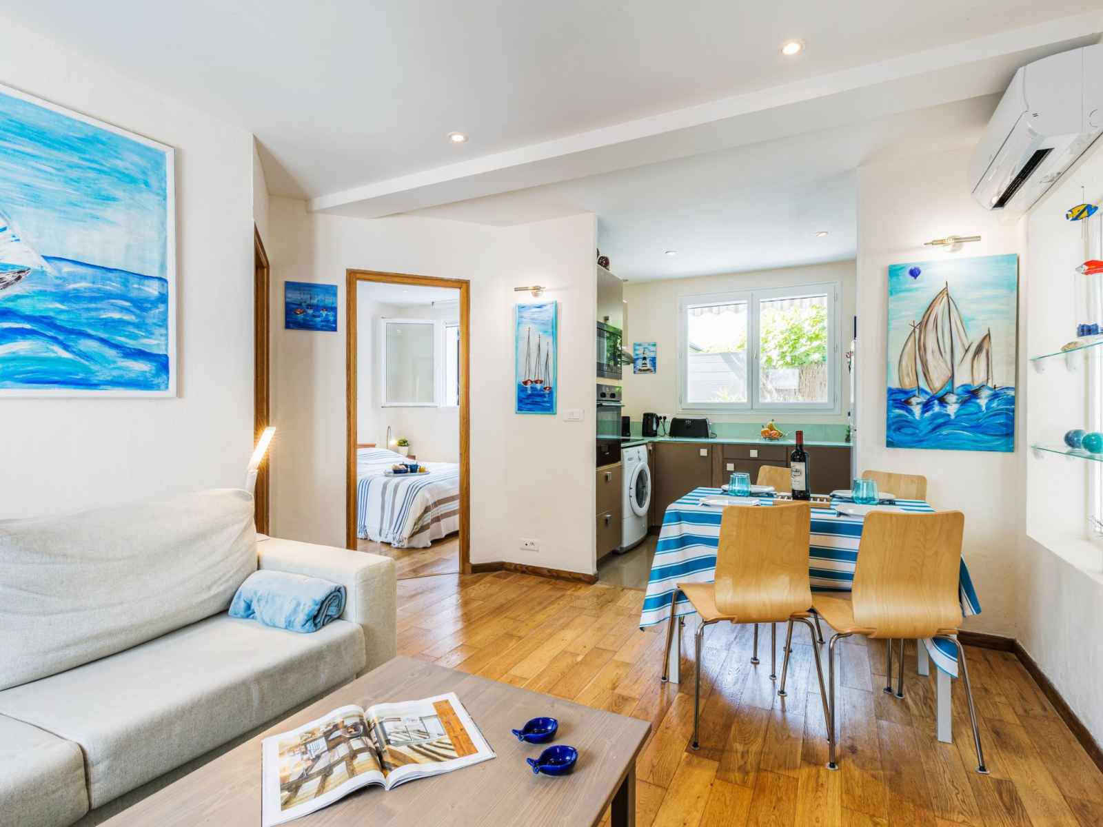 Apt 2 pièces 45 m2, au rez-de-chaussée. aménagement fonctionnel et agréable: séjour/salle à manger avec 1 divan-lit double (140 cm, longueur 190 cm), tv (écran plat), chaîne stéréo et air-conditionné. sortie sur la terrasse. 1 chambre avec 1 grand-lit (140 cm, longueur 190 cm), tv (écran plat). cuisine ouverte (four, 3 plaques à